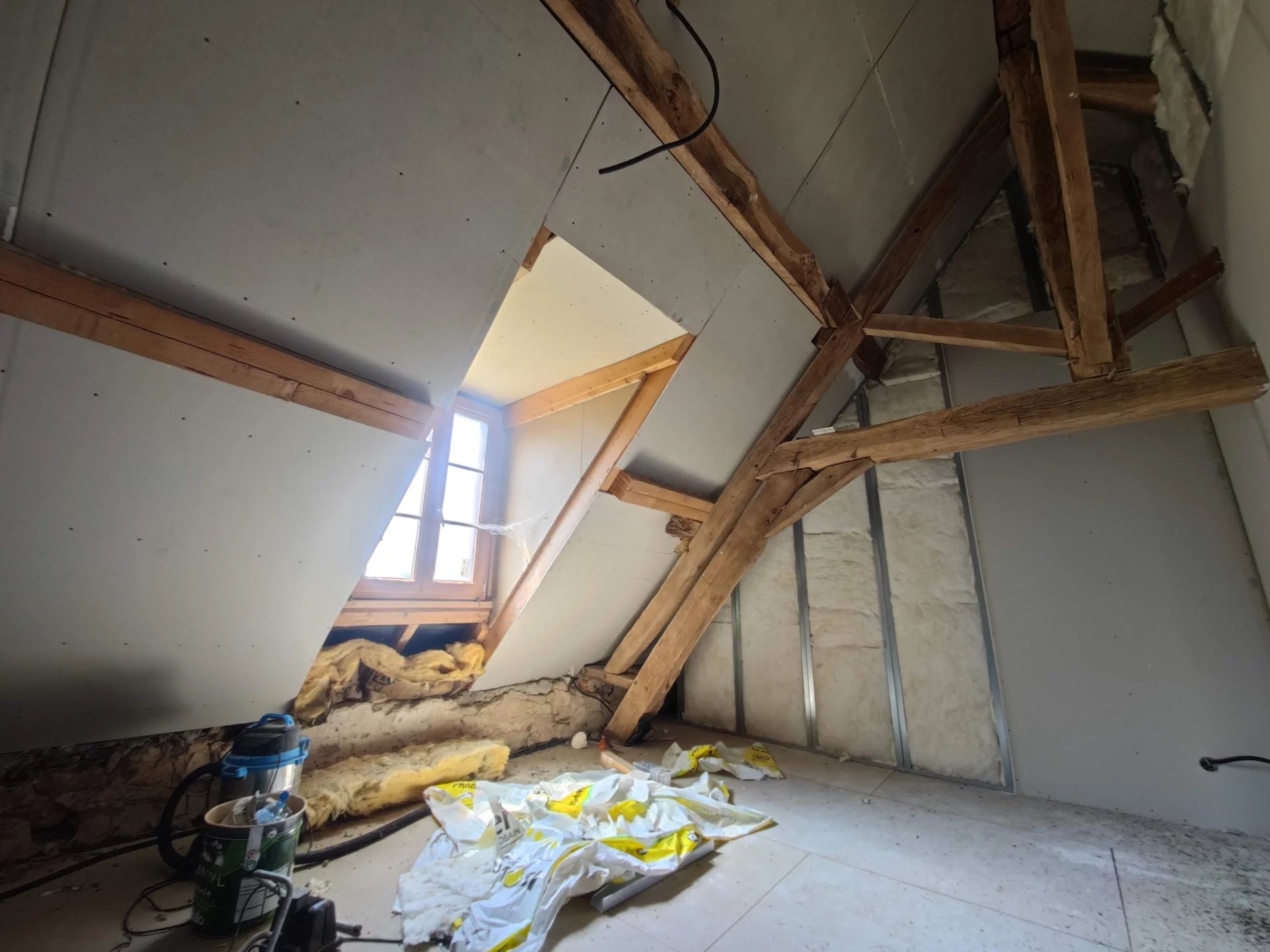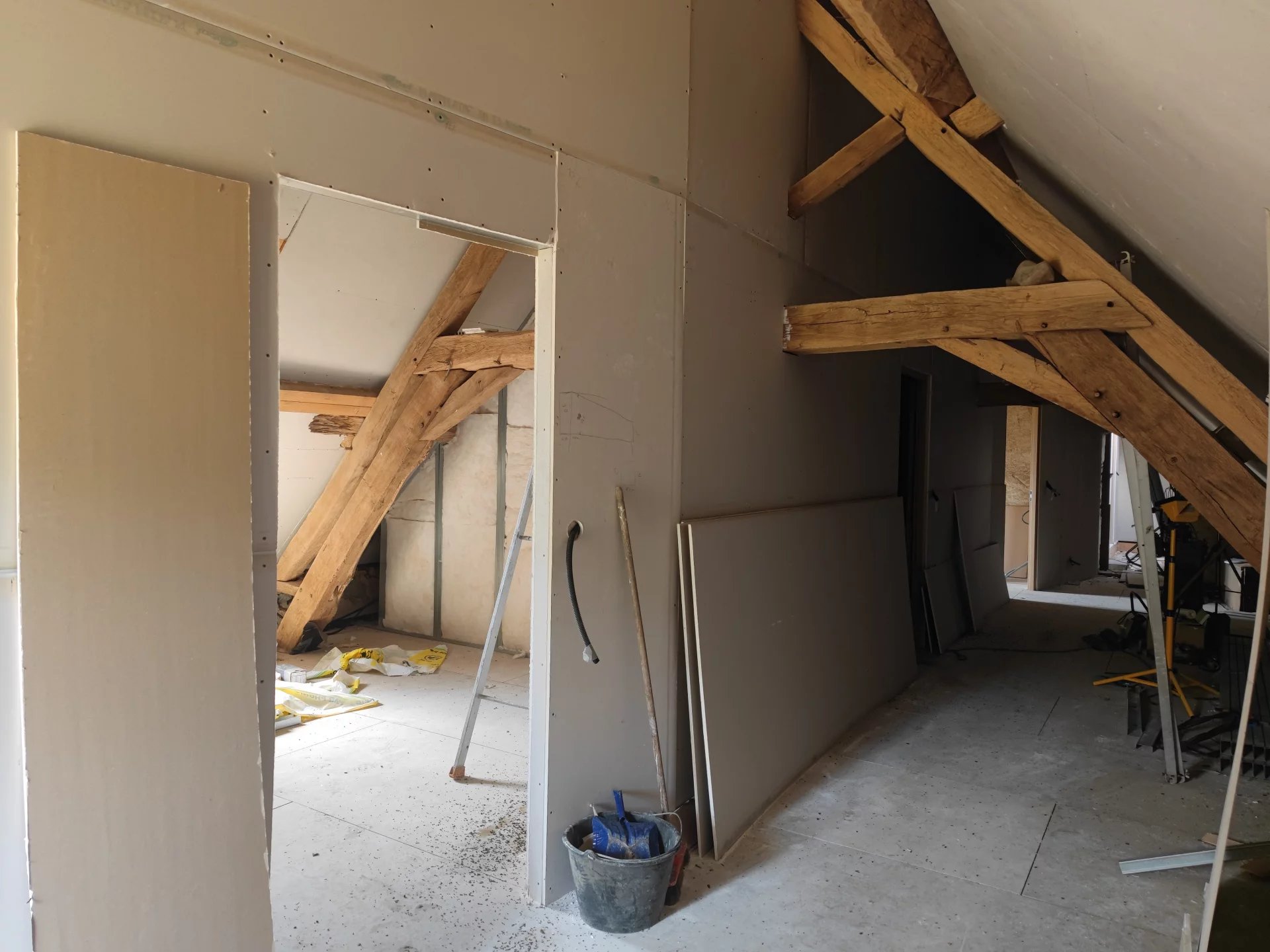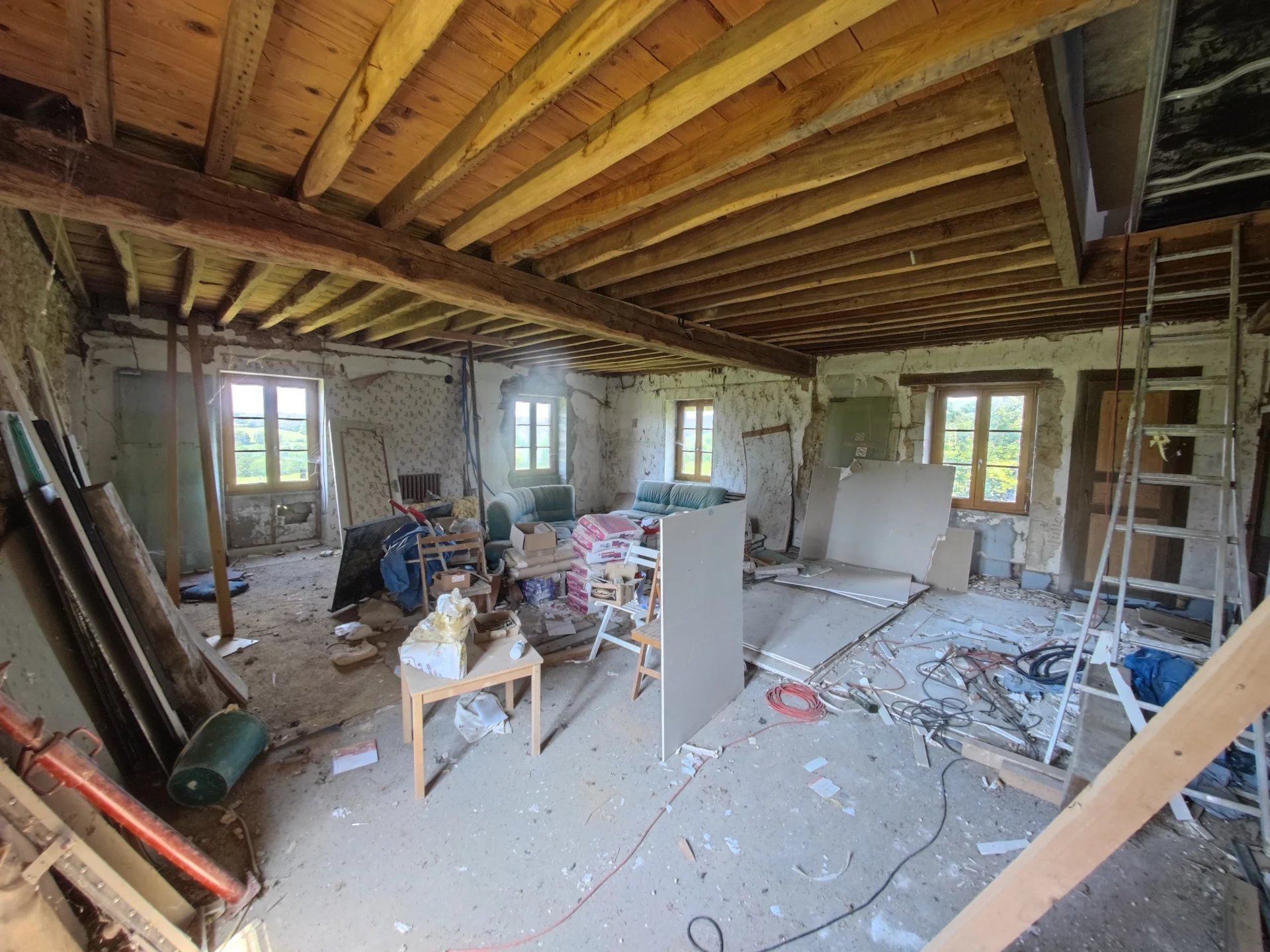 L’étage a été partiellement aménagé, avec des cloisons montées et doublées, offrant un grand couloir desservant quatre pièces, dont une de 40m2, offrant une vue imprenable sur la campagne environnante.