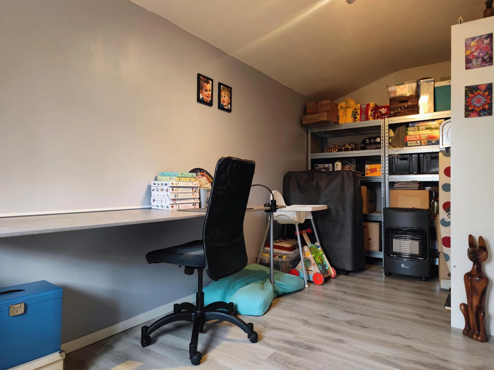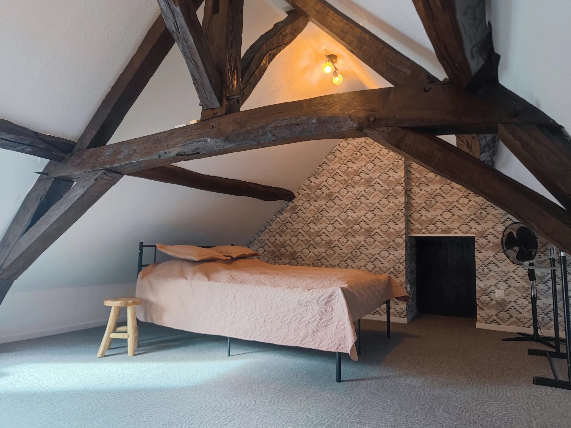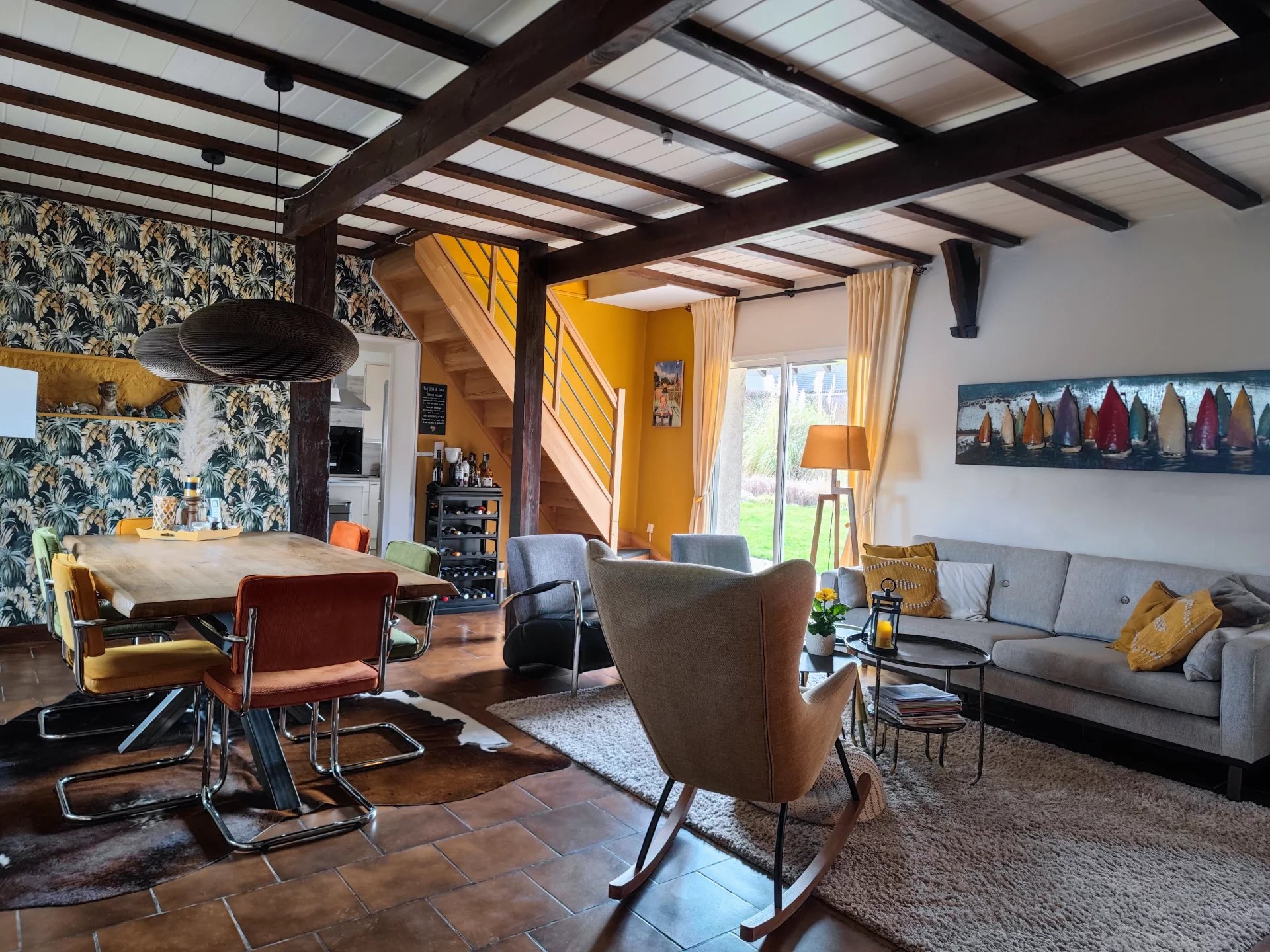 L’habitation se compose au rez-de-chaussée d’un vaste séjour de 36m2 accueillant un salon et une salle à manger, suivi d’une cuisine, de deux chambres et d’une pièce pouvant faire office de dressing, de bureau ou de chambre supplémentaire. Une salle d’eau avec WC complète le RDC. L’étage accueille une chambre ainsi que deux petits greniers.