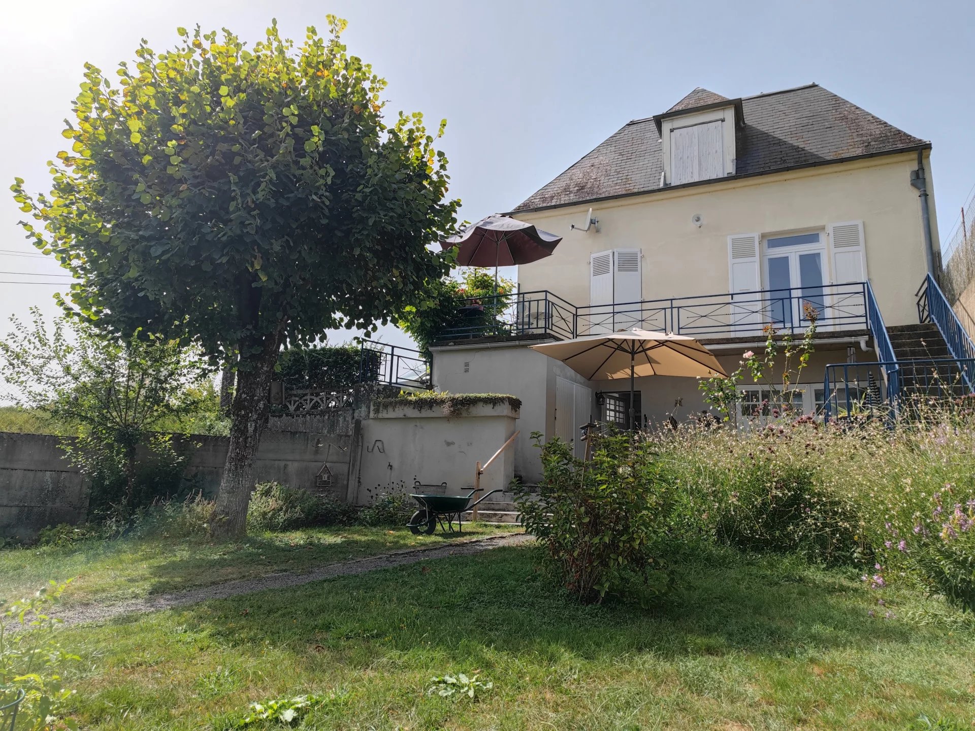 Niveau extérieur, vous pourrez profiter d’une terrasse donnant sur un beau jardin arboré d’environ 1300m2. Deux garages et un abri voiture viennent compléter cette jolie propriété.