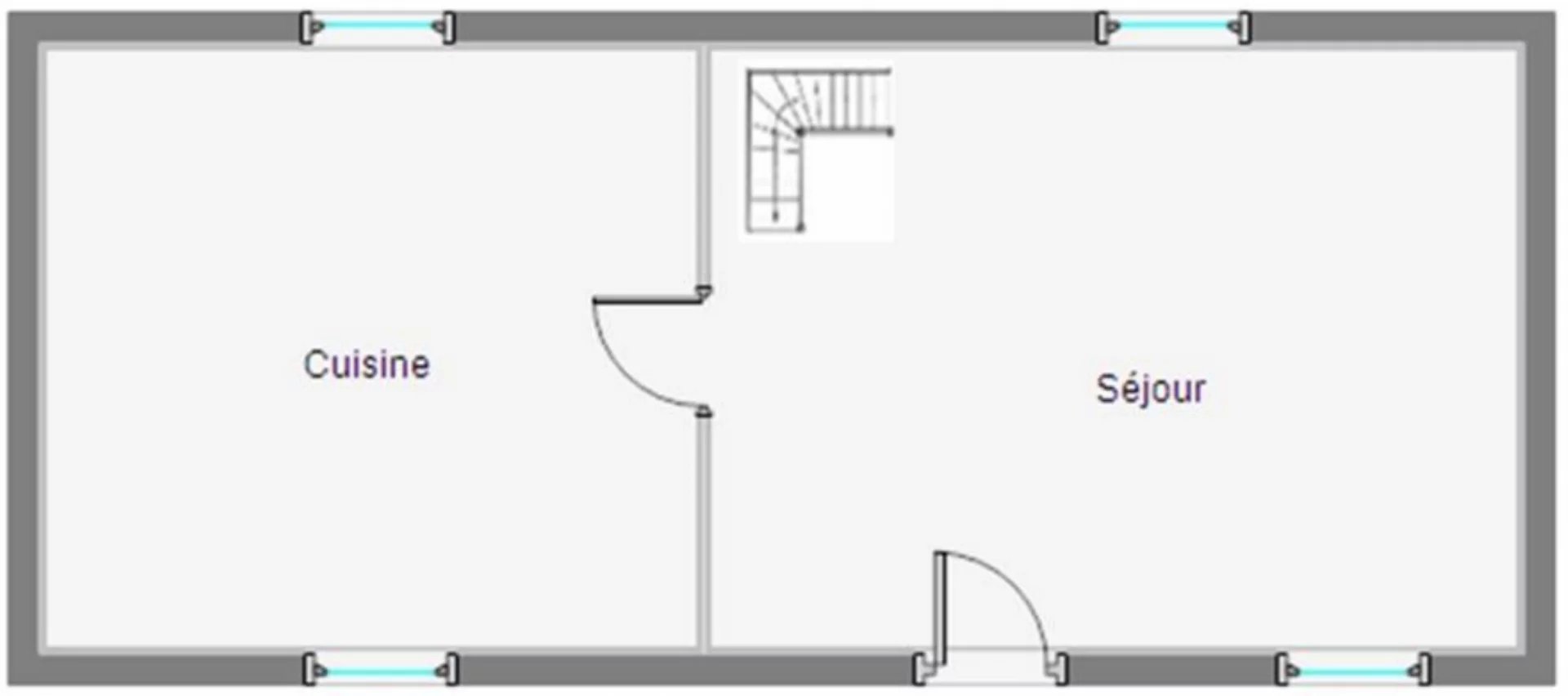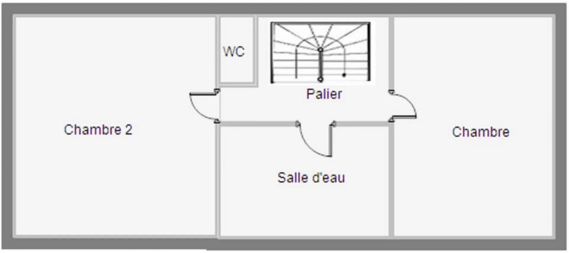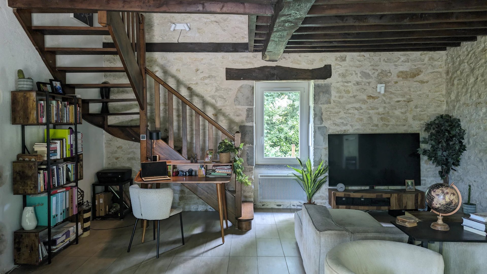 La partie habitation accueille au RDC un vaste séjour suivi d’une grande cuisine équipée avec salle à manger. A l’étage, un palier mène à deux grandes chambres, une salle d’eau et un WC.
