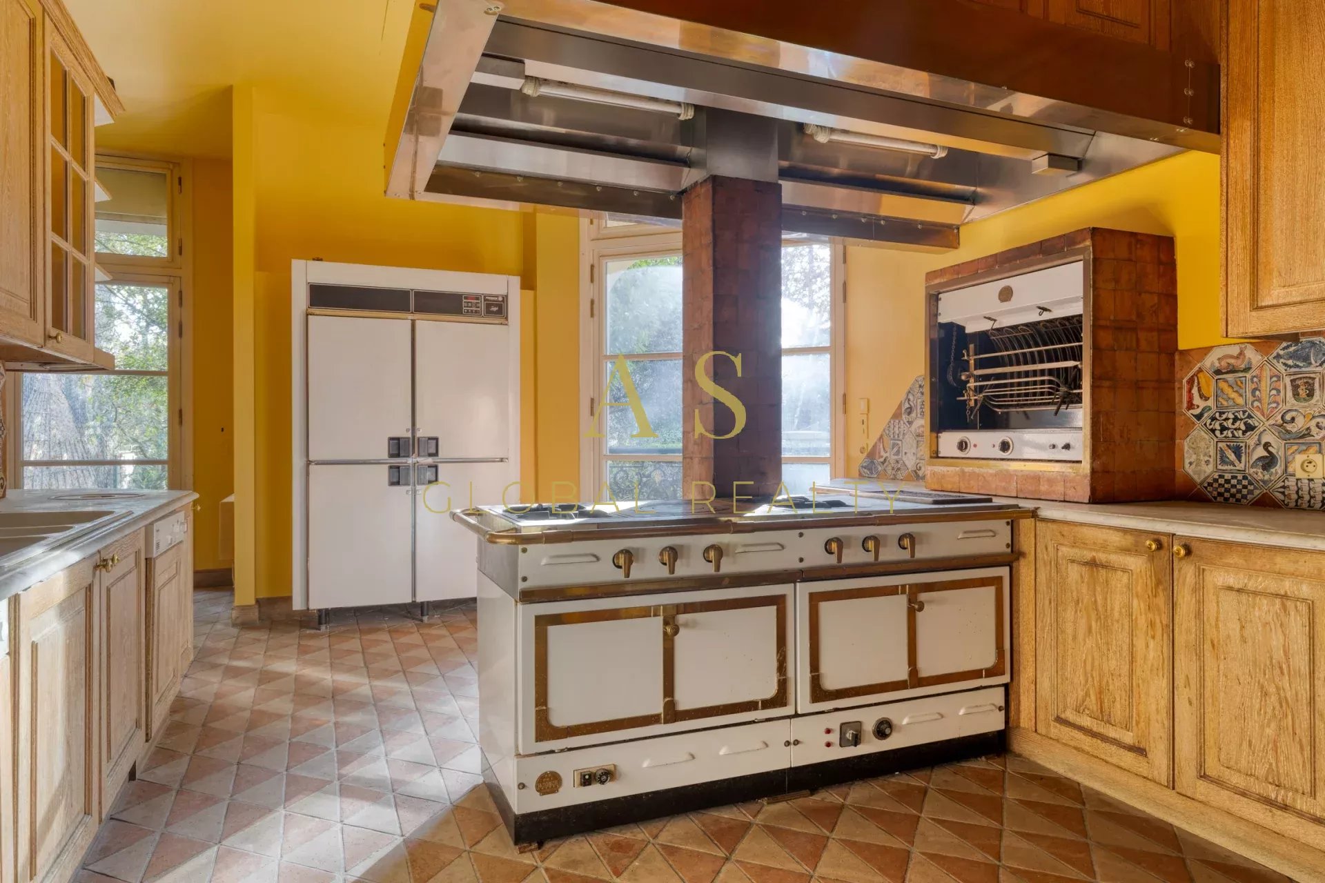 Au même niveau, se trouvent une salle à manger d'appoint, et une cuisine professionnelle (rôtisserie à la broche, monte-plat, etc) ouvrant sur une vaste terrasse digne des réceptions estivales les plus élégantes, facilitant la circulation pour le service.