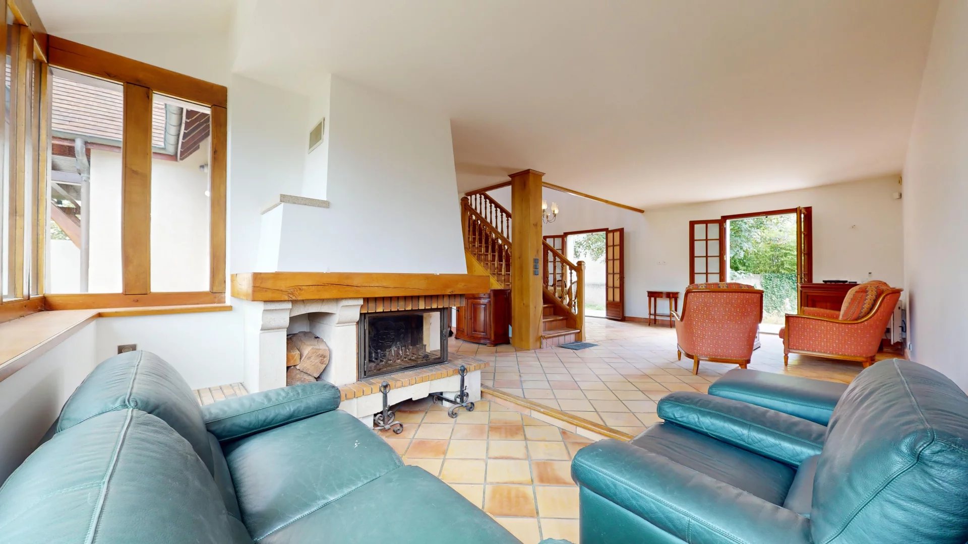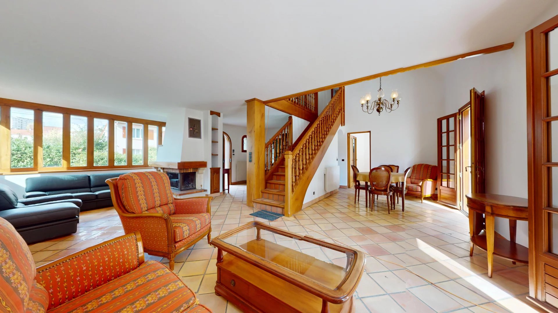 La GRANDE ENTRÉE dessert un TRIPLE SALON/SÉJOUR/SALLE-A-MANGER de 40 m² particulièrement CONVIVIAL avec sa GRANDE CHEMINÉE A INSERT et sa HAUTE VERRIÈRE procurant toute la LUMINOSITÉ nécessaire à ce bel espace qui donne directement sur la TERRASSE EXTÉRIEURE ARRIÈRE de 35 m² grâce à ses 2 portes fenêtres. Le PLAFOND CATHÉDRALE de près de 5 m de hauteur de la salle-à-manger apporte un VOLUME IMPRESSIONNANT et une SENSATION DE GRANDEUR à ce lieu.
