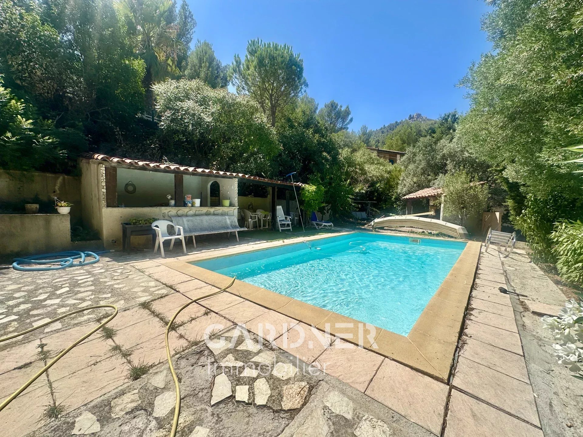 Sur une parcelle de 1150m2, vous pourrez profiter d'une piscine, d'une terrasse ensoleillée et d'une cuisine d'été pour des moments de détente en plein air face à la nature. Facilité de stationner au moins 5 véhicules sur la propriété.