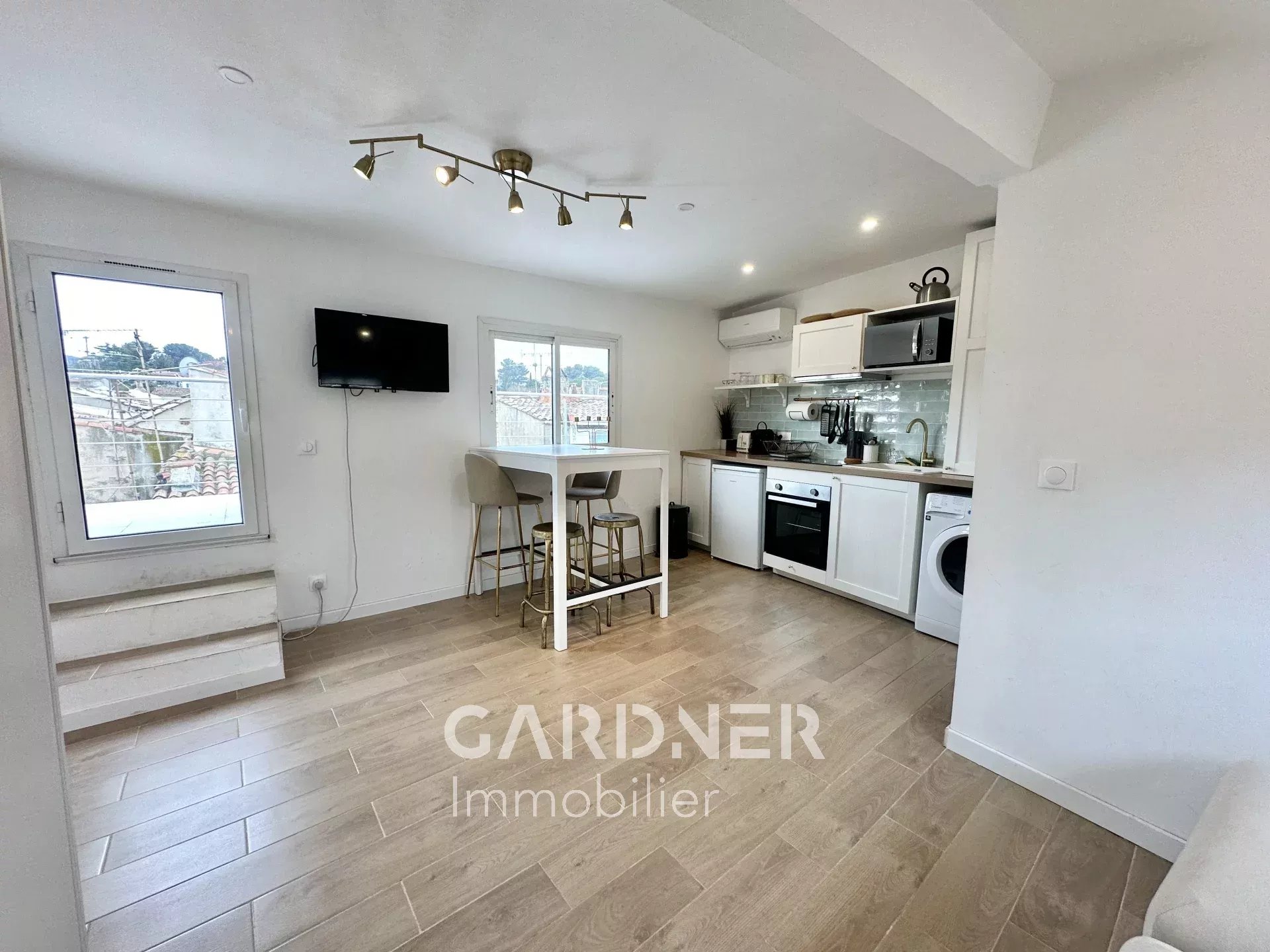 Appartement Type 1/2 de 26,03m2 + terrasse de 13,18 m2. Au 4eme et dernier étage sans ascenseur. Magnifique vue sur la ville et les toit Aubagnais. Au calme absolu. Faites l’acquisition de cet appartement meublée. Composé d’une entrée donnant sur le séjour avec cuisine ouverte équipée, un petite chambrette de 5,16m2, une salle d’eau avec toilette. Climatisation, isolation par le toit, chauffe eau électrique, exposition SUD. Travaux de copropriété prévu et seront payé par les vendeurs. Fibre disponible dans l’immeuble. Idéalement placé pour du airbnb. Très bon rendement locatif 9%. Charges environ 30€/mois.