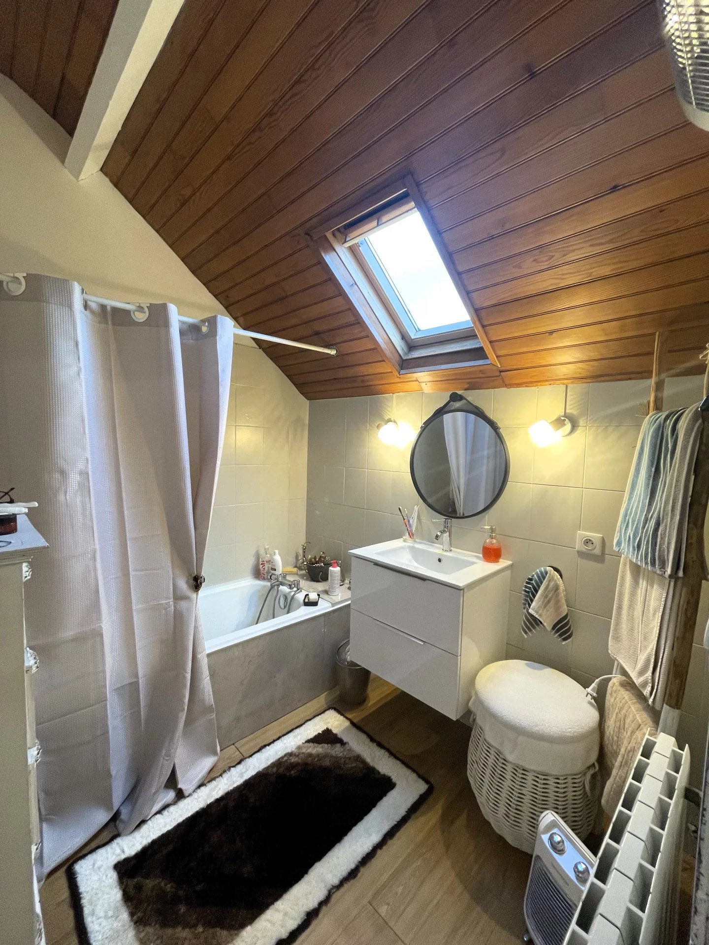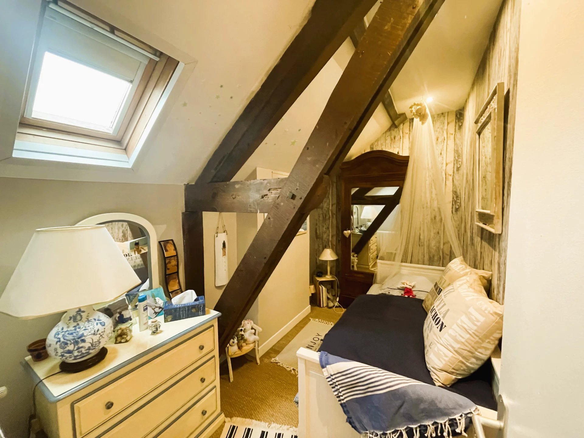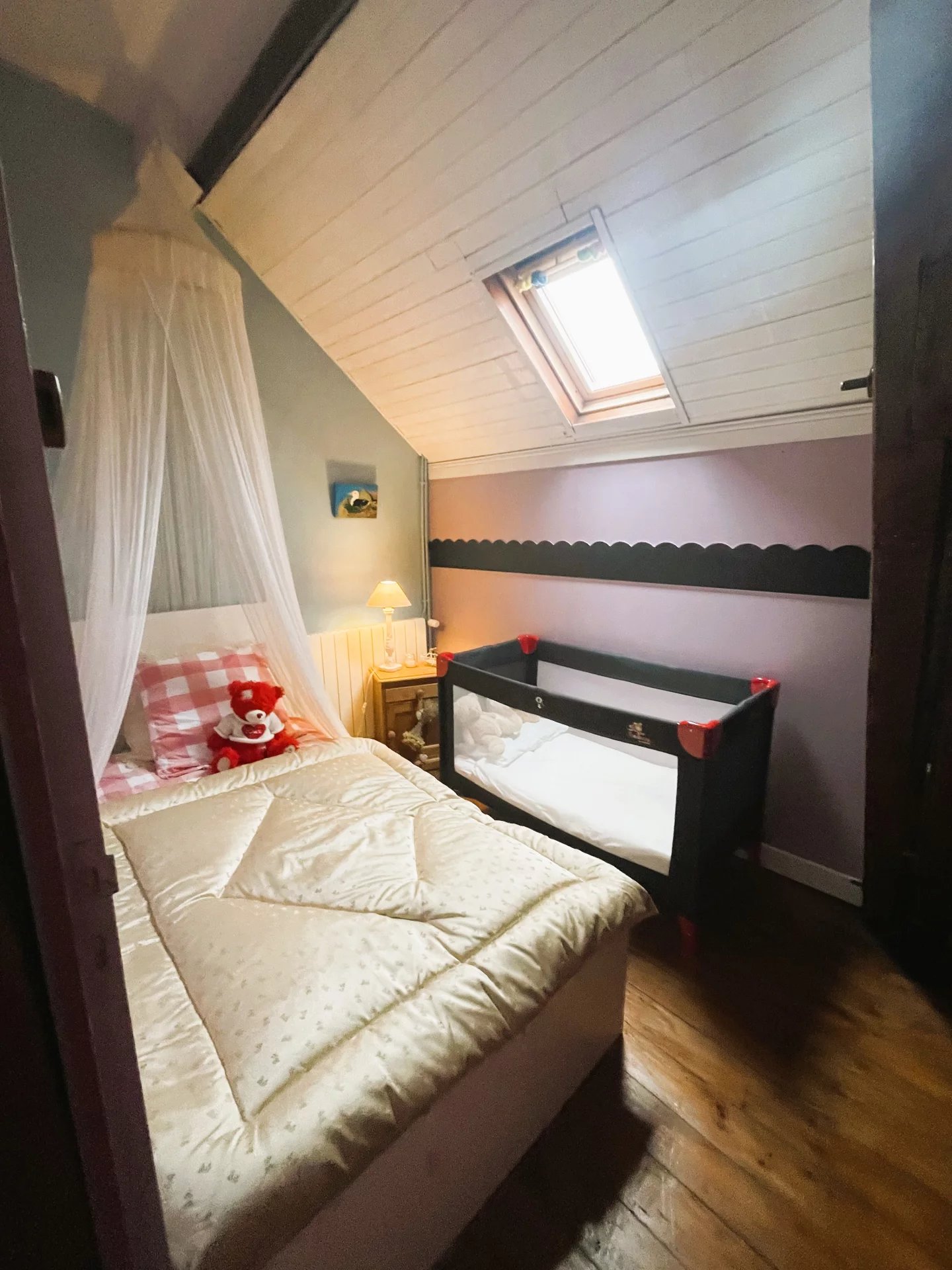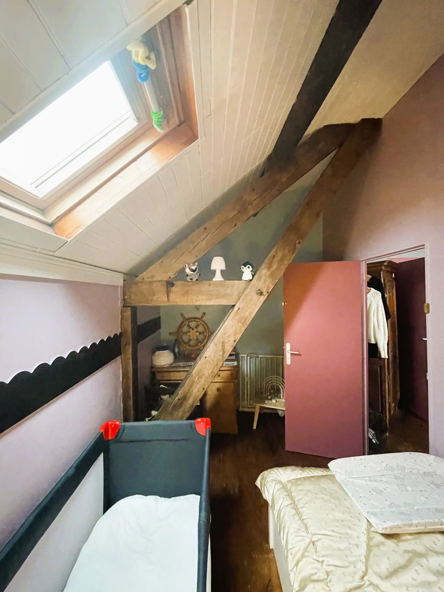 A l'étage : 3 chambres et une pièce de moins de 9m² faisant aujourd'hui office de chambre d'enfant, une salle de bain et un WC.