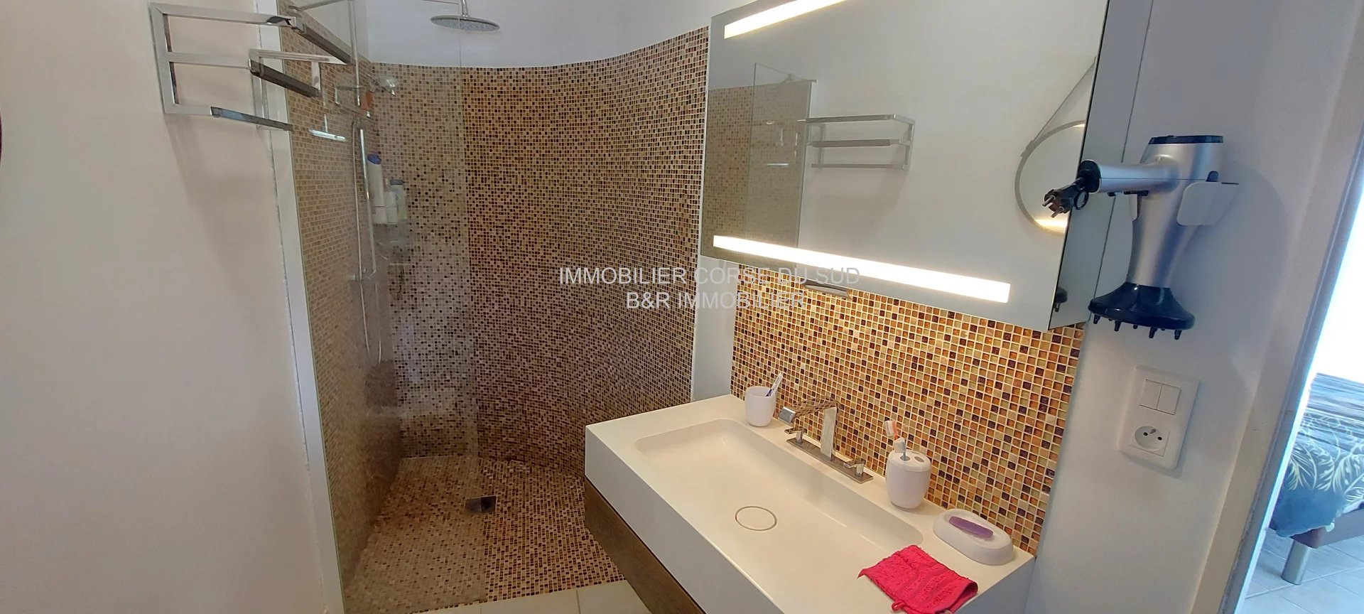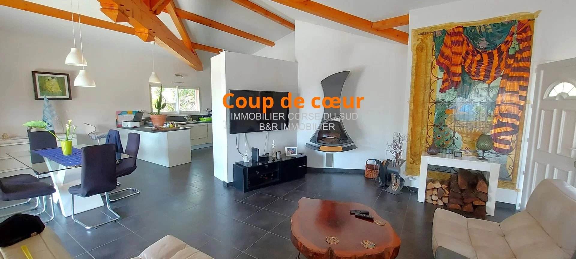 Belles prestations : Charpente traditionnelle dans le salon-séjour; cheminée insert design; des climatisations réversibles dans toutes les pièces; fenêtres en double vitrage; des baies coulissantes à galandage.