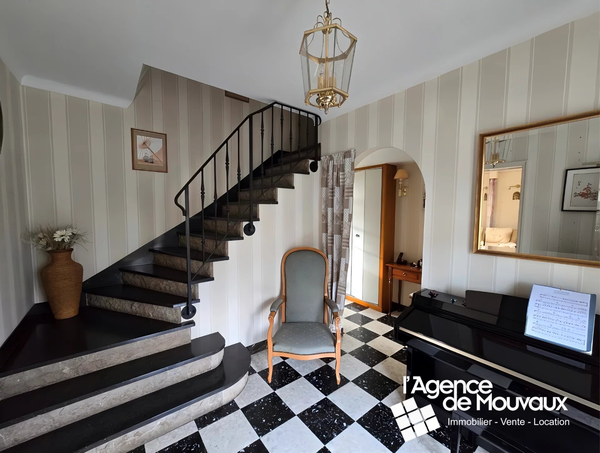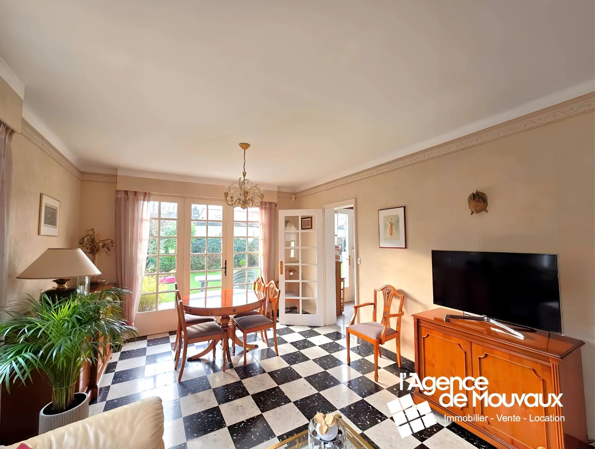 Cette maison de 94.2 m2 habitables se compose d'un vaste hall d'entrée avec un escalier en marbre, d'une cuisine équipée séparée, d'une belle pièce de vie lumineuse avec cheminée feu de bois, le tout donnant sur un superbe jardin exposé sud-ouest.