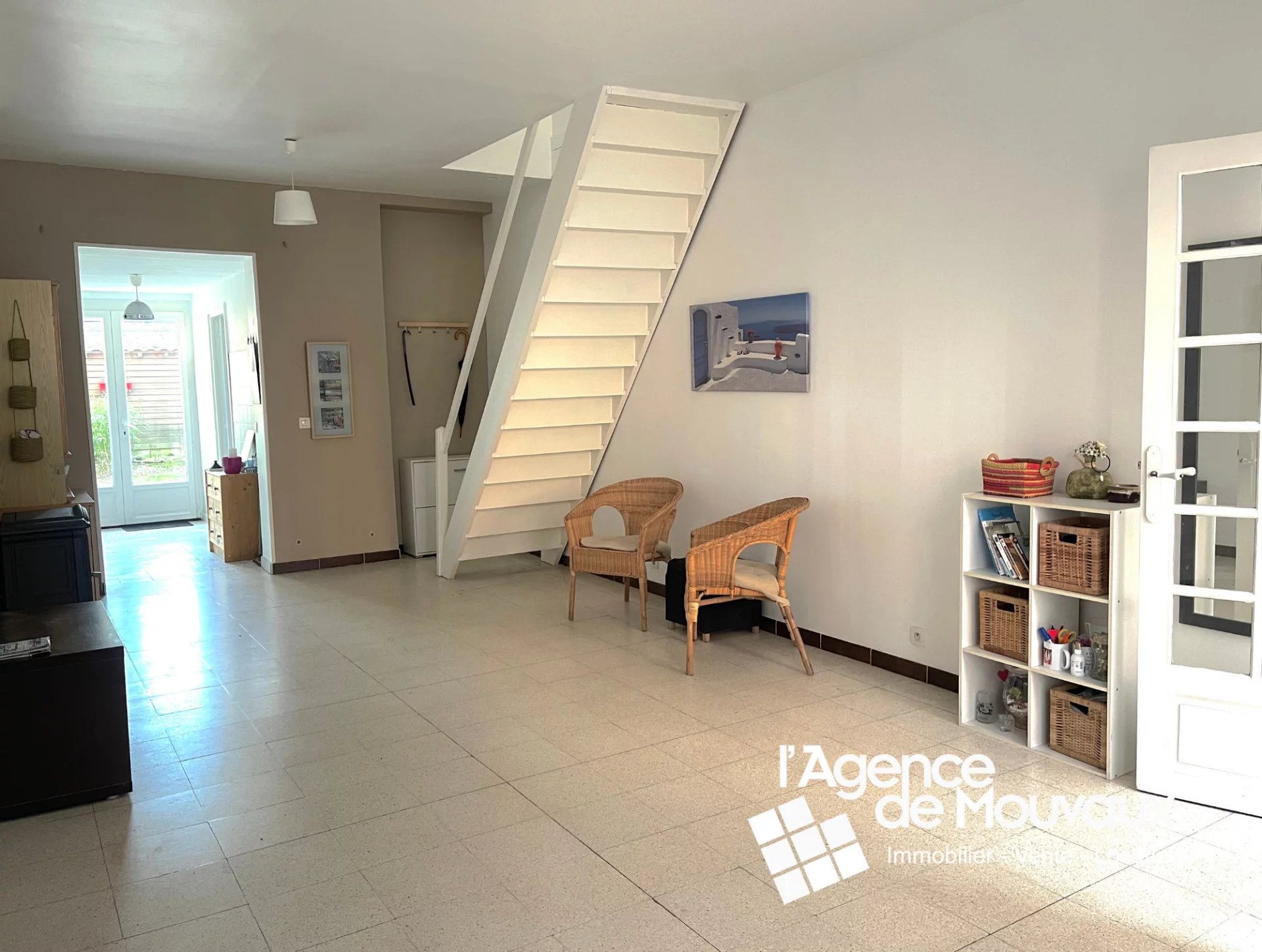 - Une entrée desservant un séjour lumineux de 27 m² agrémenté d’un poêle à gaz.