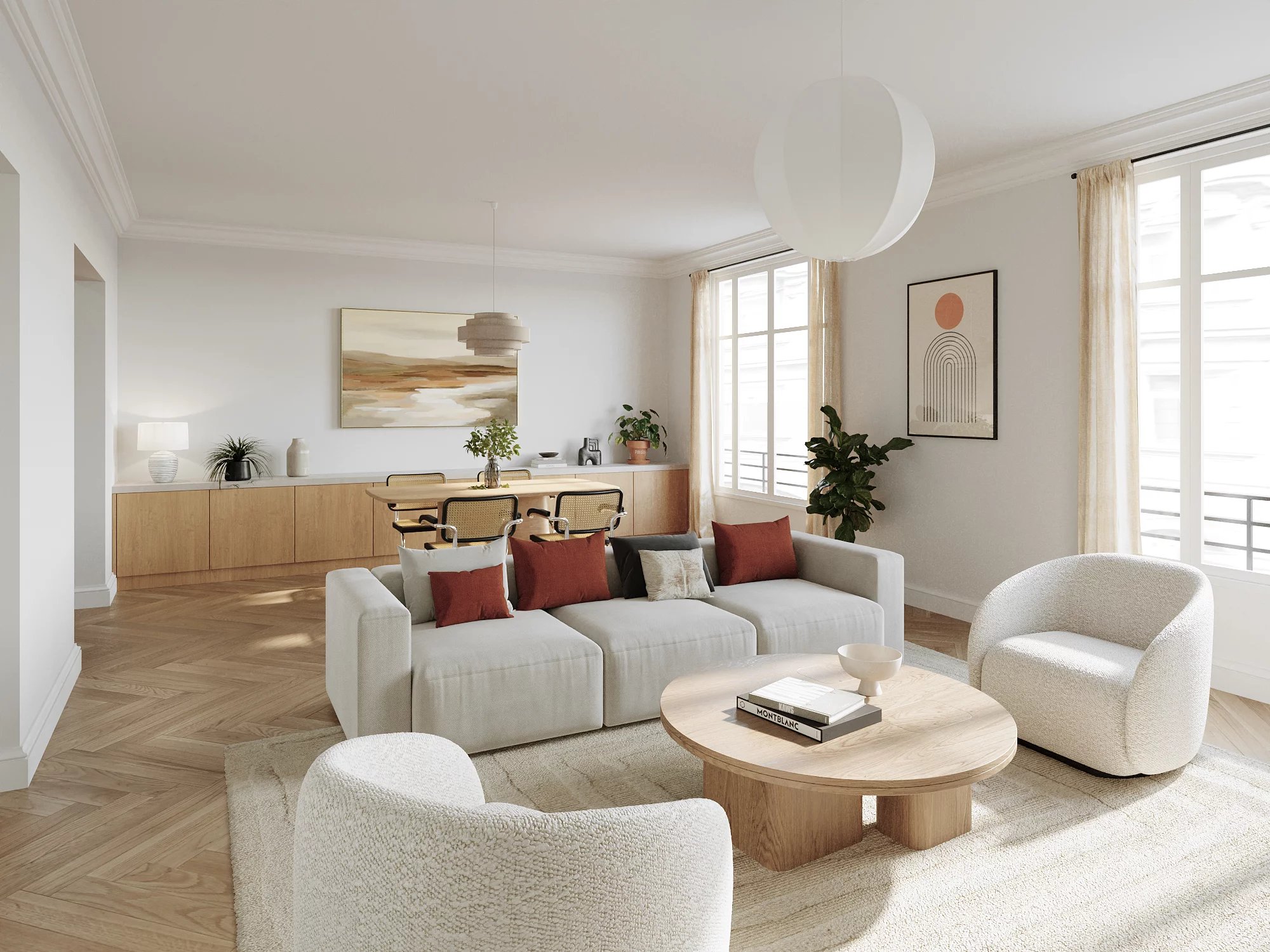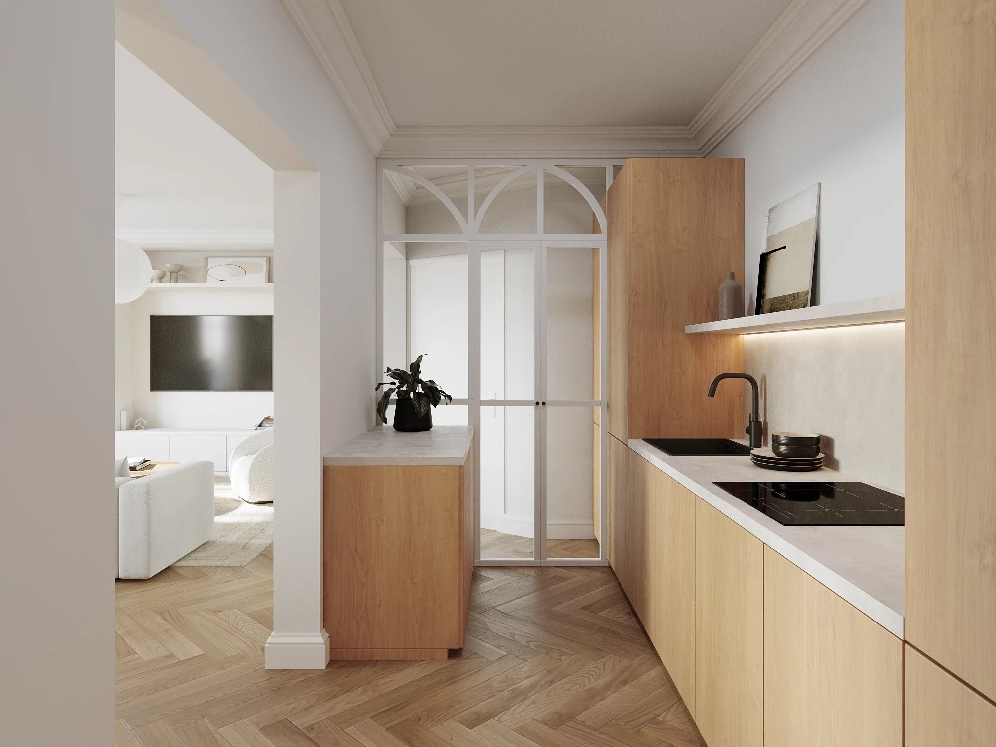 - Une grande pièce de vie de 34m2 avec une cuisine semi-ouverte de 9m2 bénéficiant de deux grandes fenêtres exposée sud-ouest.