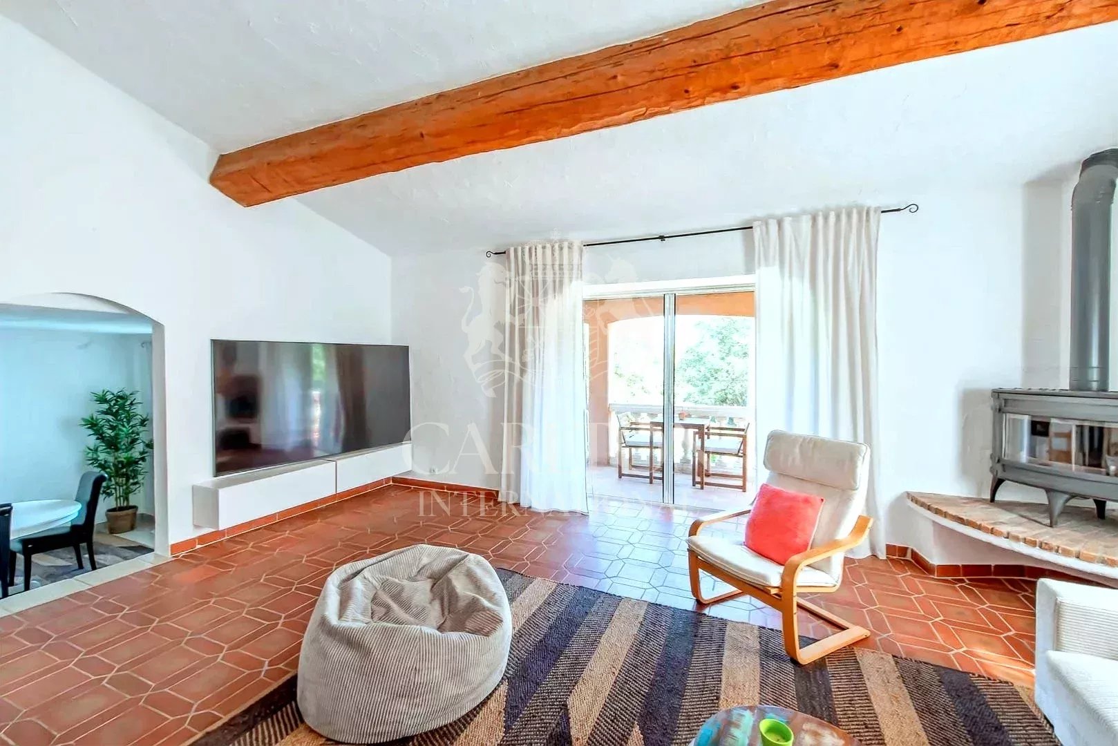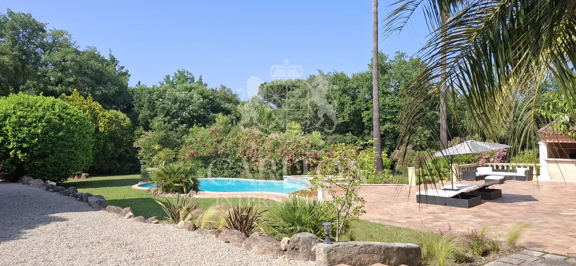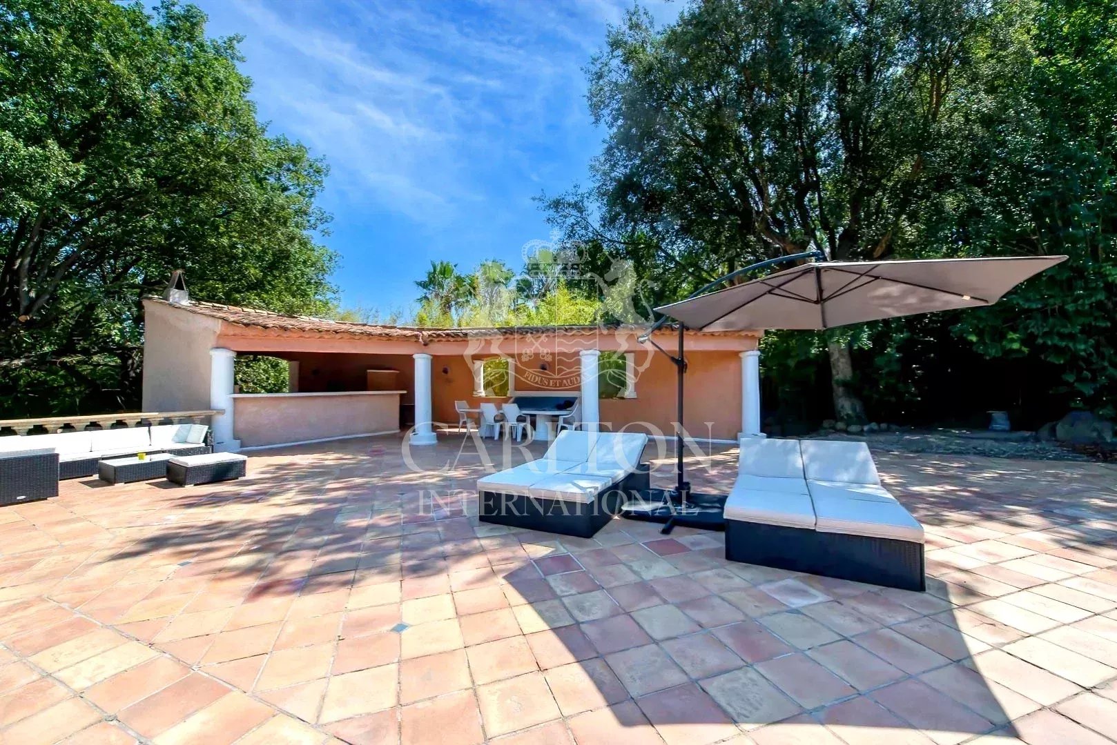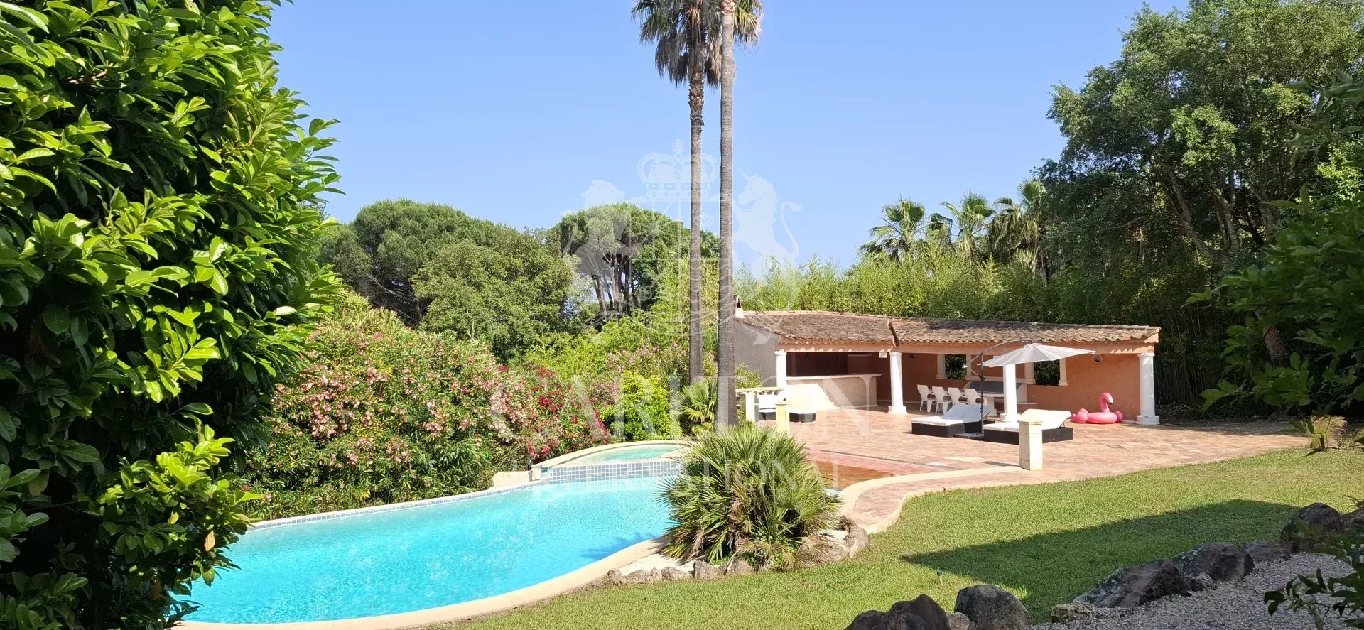 GRIMAUD : Charmante villa rénovée avec piscine et 5 chambres, près du village de Grimaud et de Saint-Tropez Entièrement rénovée en 2023, cette lumineuse villa de 5 chambres offre environ 220 m² habitables sur un terrain paysager de 3 212 m² avec grande piscine et cuisine d’été. Située dans un domaine privé avec courts de tennis, elle se trouve à seulement 1,4 km à pied du village de Grimaud et à 7 minutes en voiture des plages, de Port Grimaud et du Golf de Beauvallon. La célèbre “Place des Lices” à Saint-Tropez est accessible en 15 minutes. La villa dispose d’un vaste séjour avec cheminée, d’une cuisine moderne, de plusieurs terrasses, et d’un jardin arboré de plantes méditerranéennes. Chacune des 5 chambres bénéficie d’un accès direct au jardin ou aux terrasses. Équipements récents : internet fibre optique, système de sécurité avancé, portail électrique. Possibilité d’agrandissement. Une propriété clé en main avec 5 chambres, proche des plages et des commodités de Saint-Tropez.