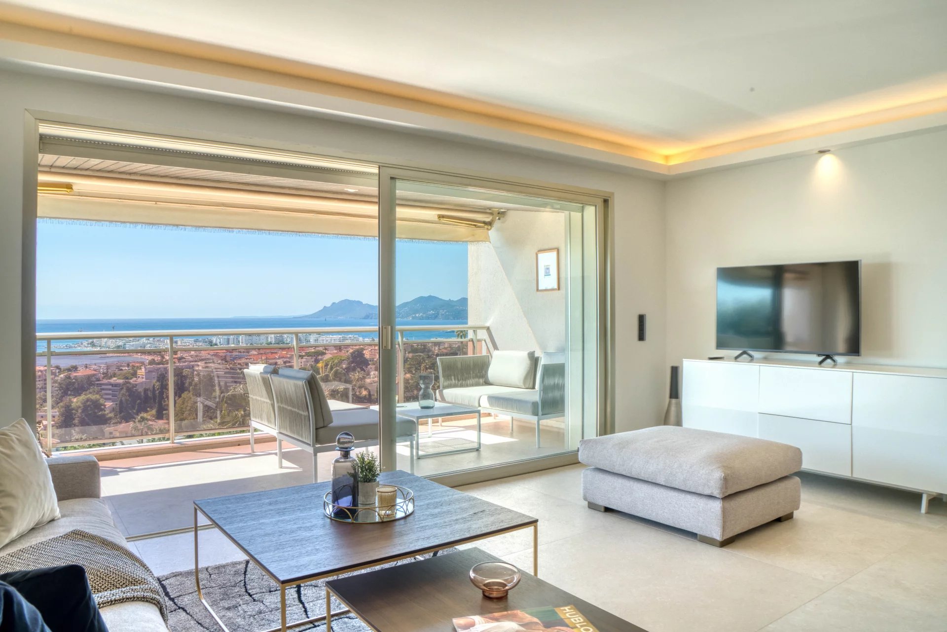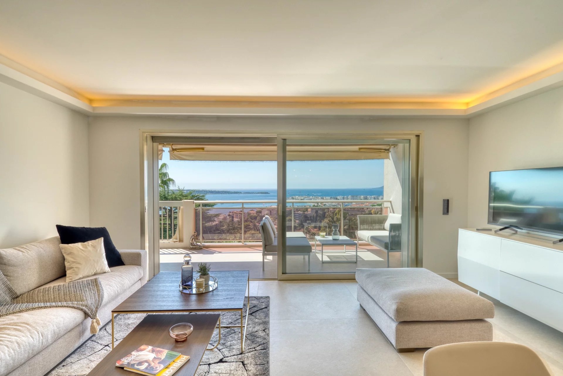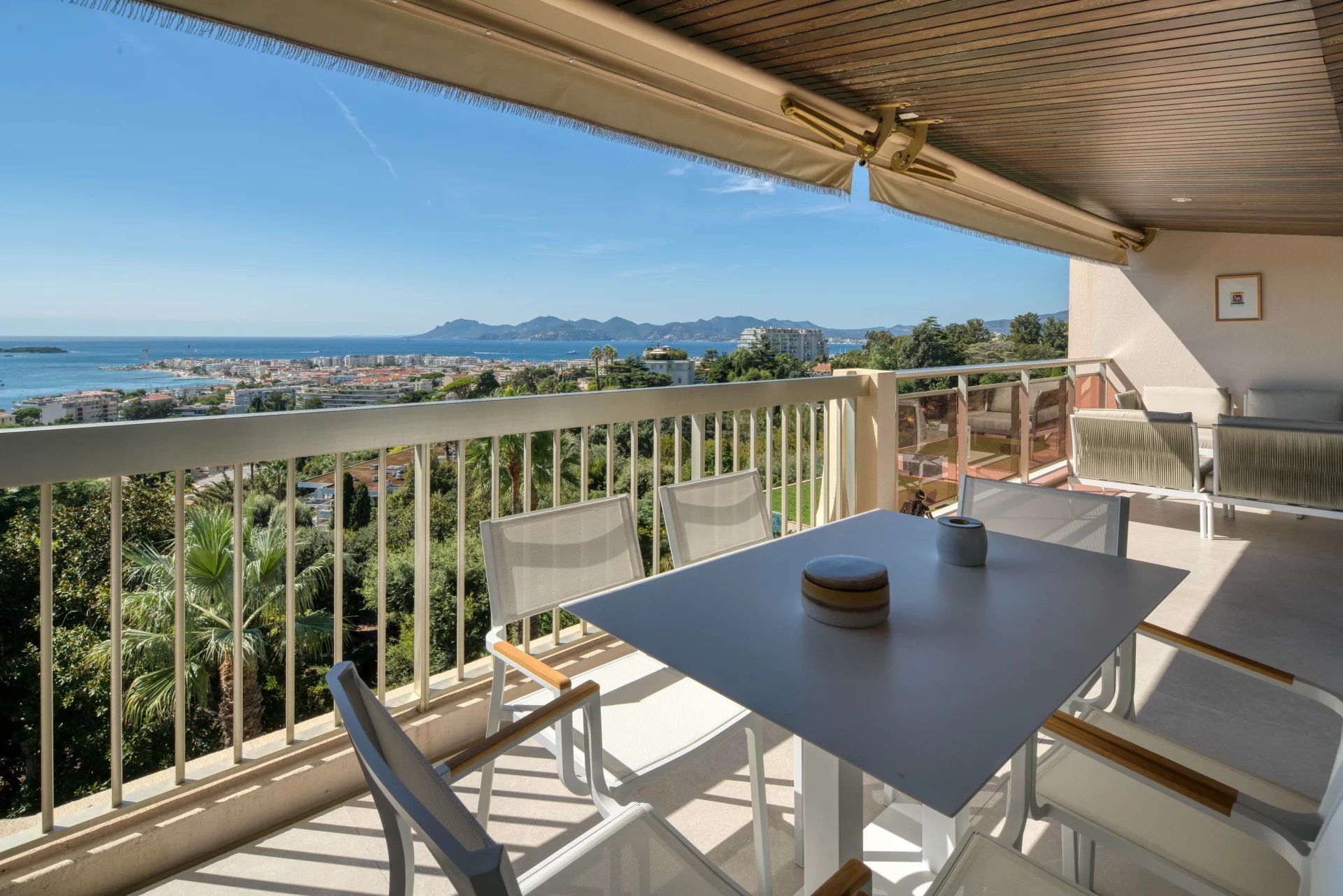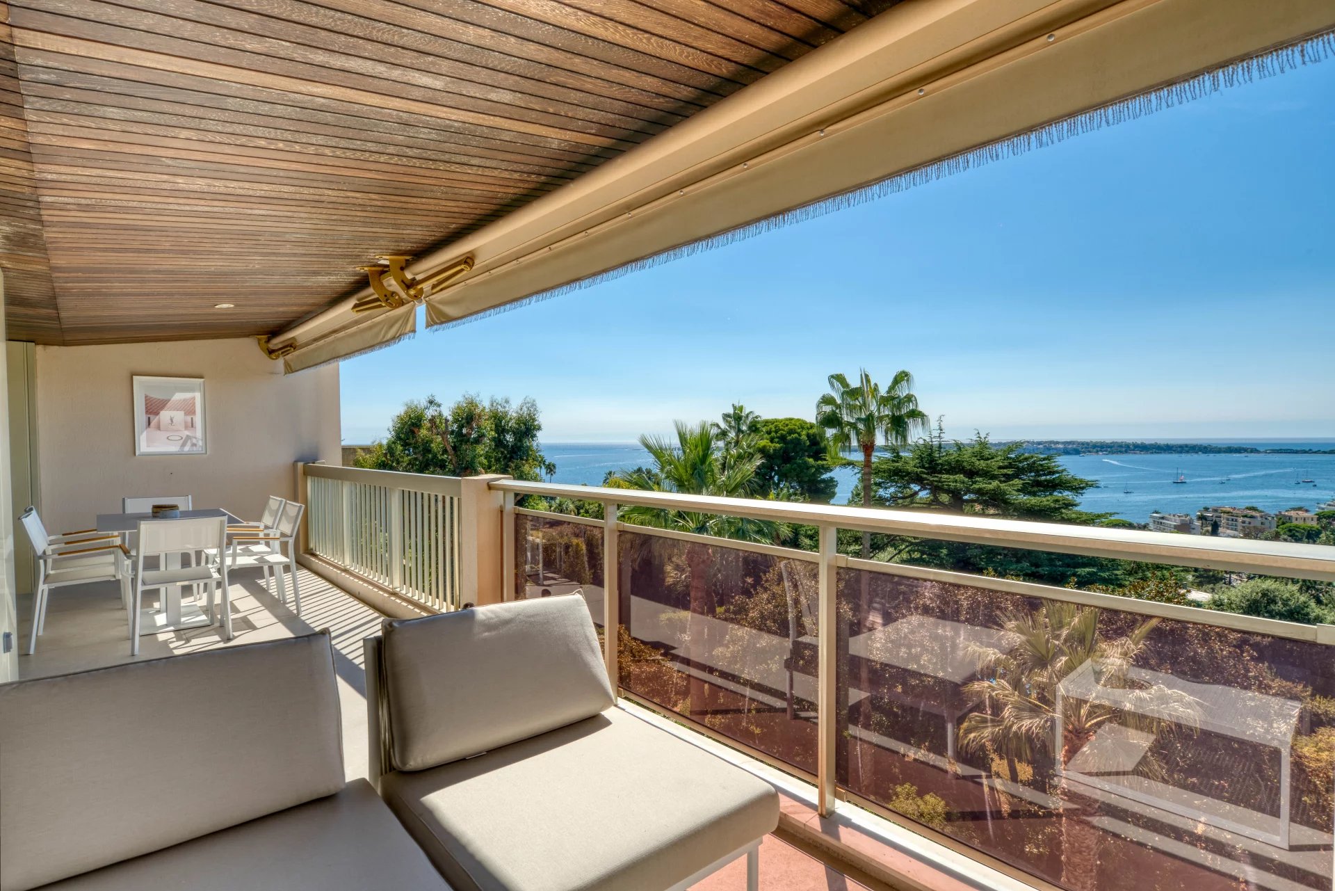 Dans l'un des secteurs les plus beaux et les plus prisés de Cannes, La Californie, au sein d'une résidence prestigieuse avec gardien et parc, ce sublime 4 pièces de 110 m2 en dernier étage se compose d'une entrée, d'un grand séjour avec cuisine ouverte, le tout donnant sur une terrasse de 18 m2 vue mer panoramique exposée sud, de 3 chambres dont une en suite avec penderies, salle de bains et WC, 2 autres salle de bains, un balcon au nord. Un grand garage double et une cave complètent ce bien.