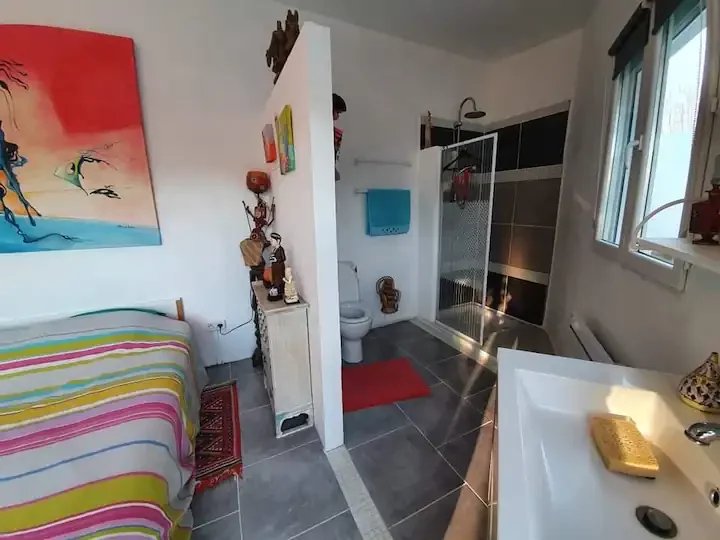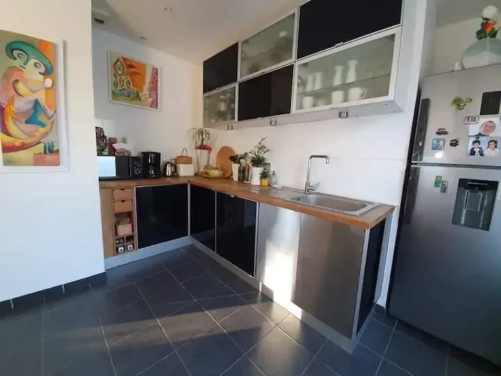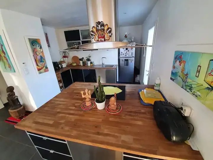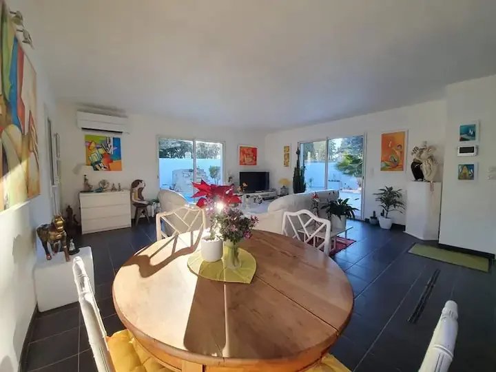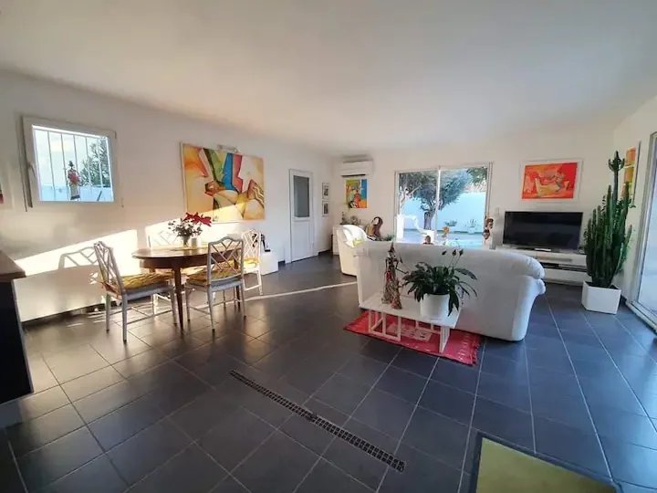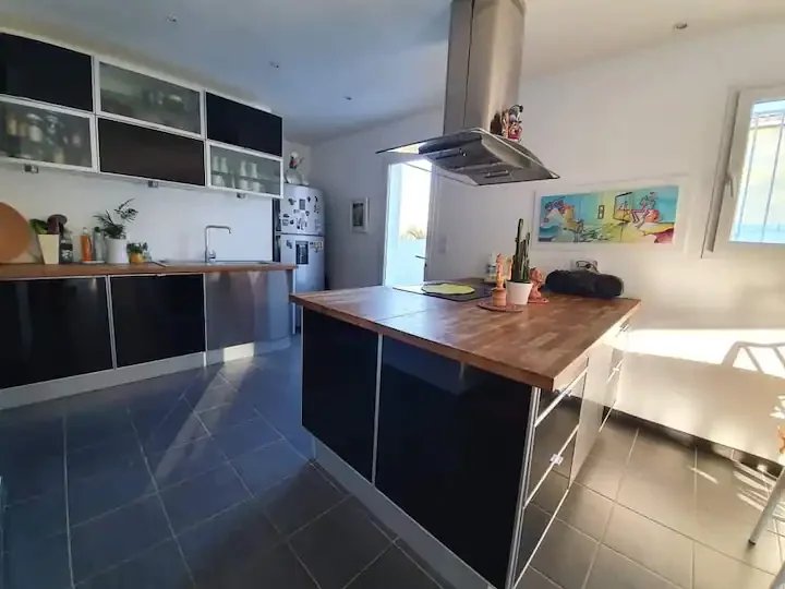 Cette villa, vous propose un grand séjour / cuisine tout équipé (lave vaisselle, four, microonde, congélateur, frigo, cafetière, …