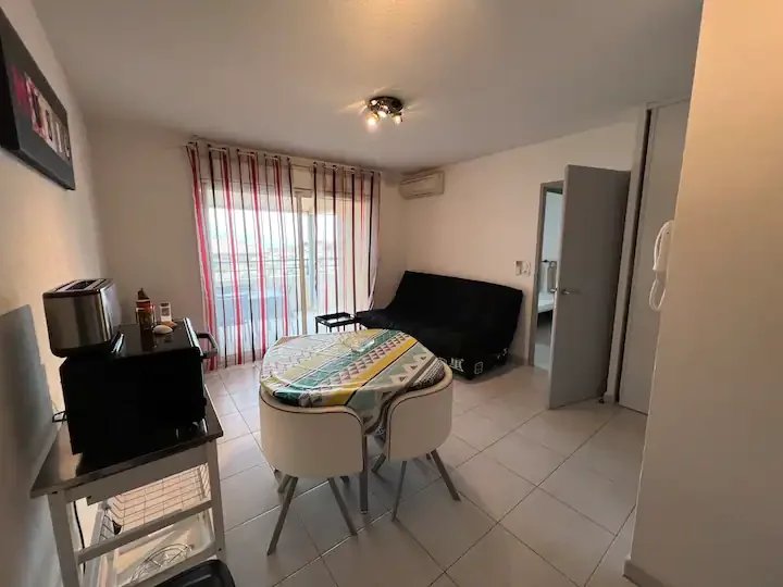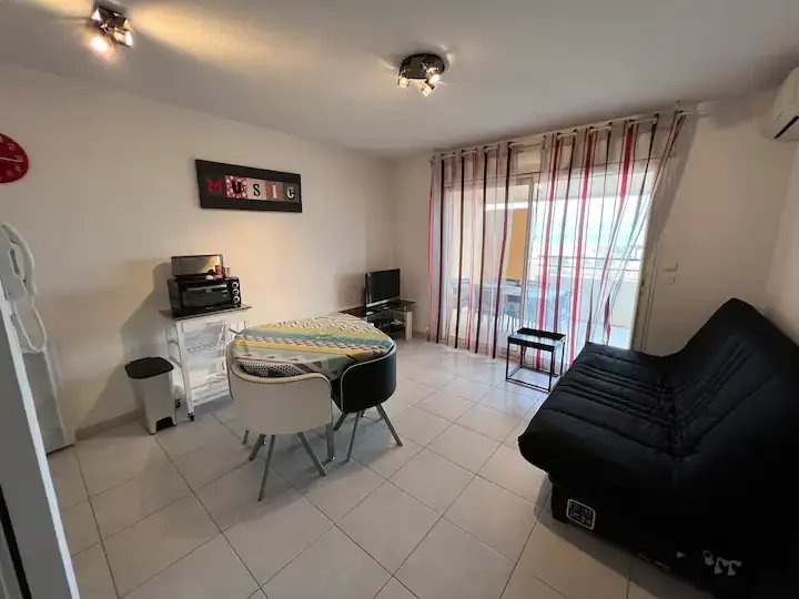 Séjour climatisé composé d'un canapé convertible ainsi qu'un espace repas.
