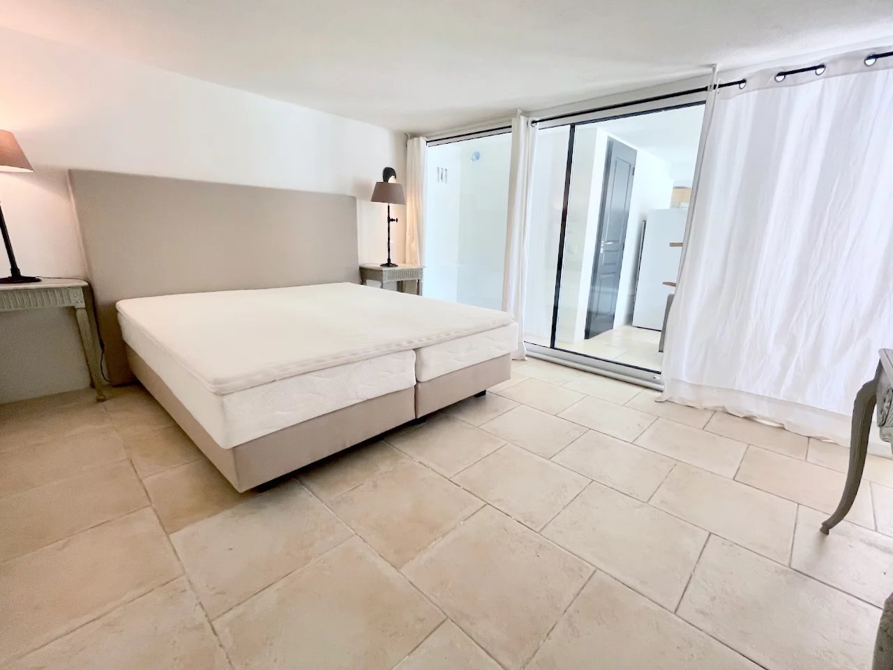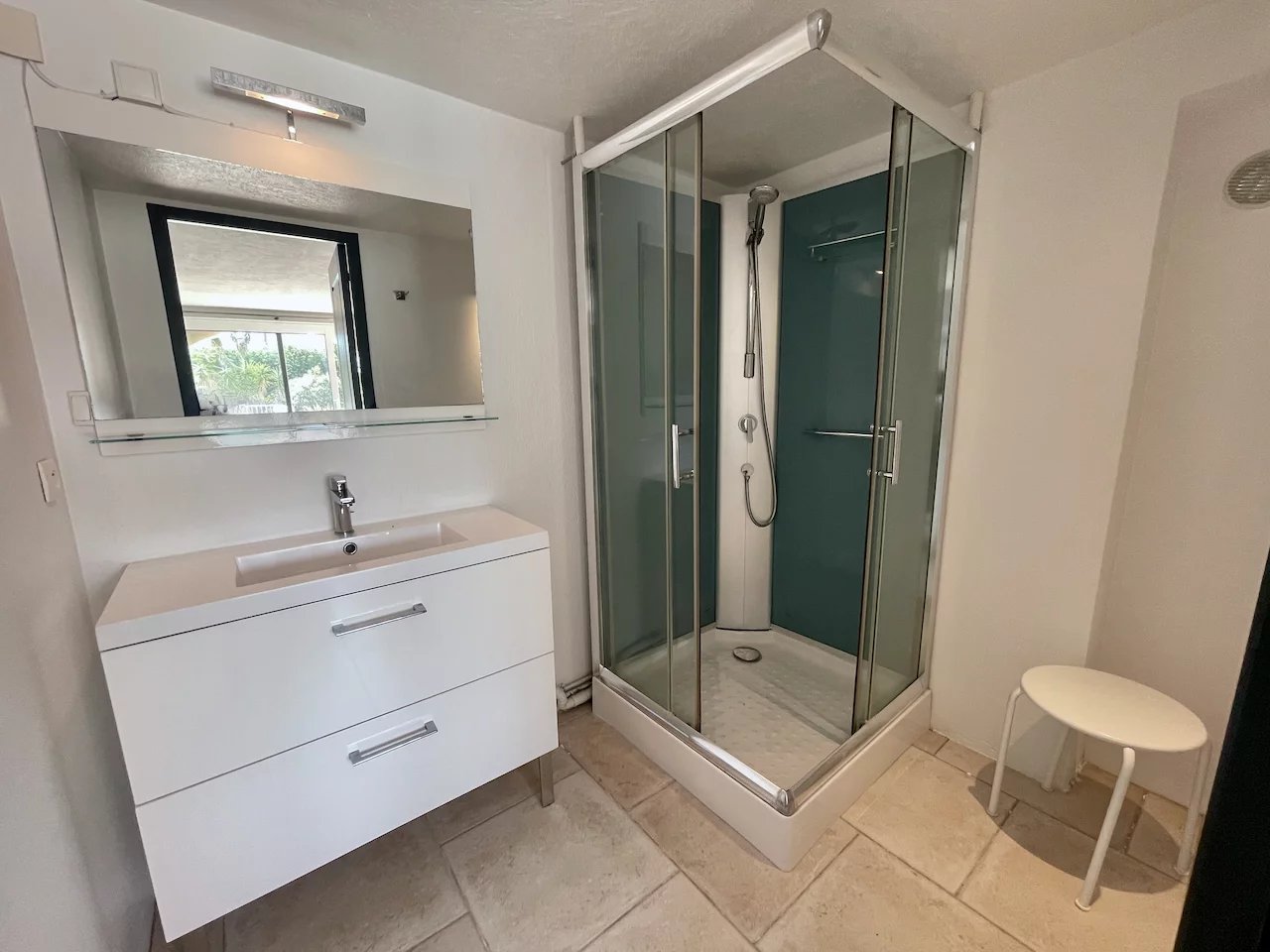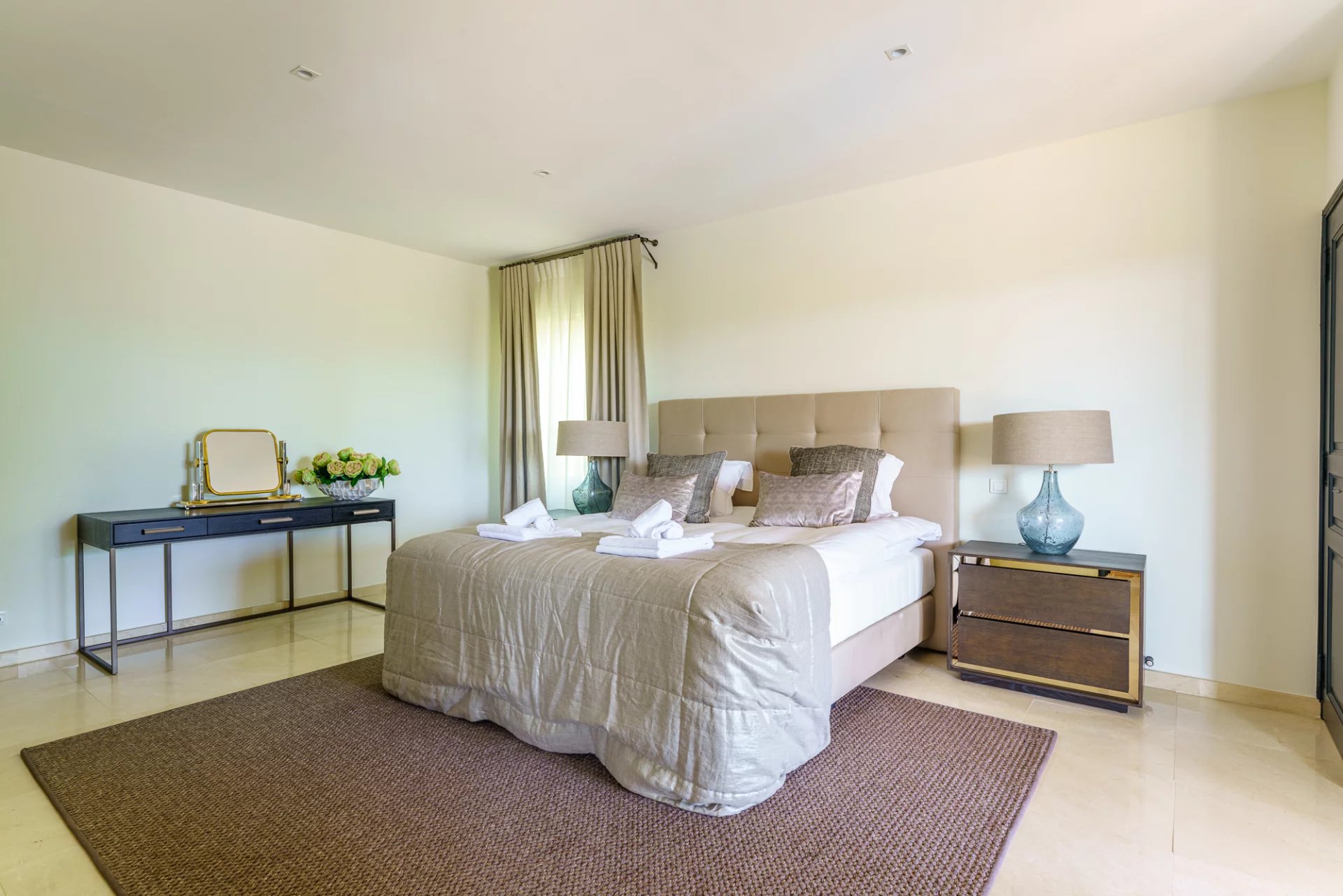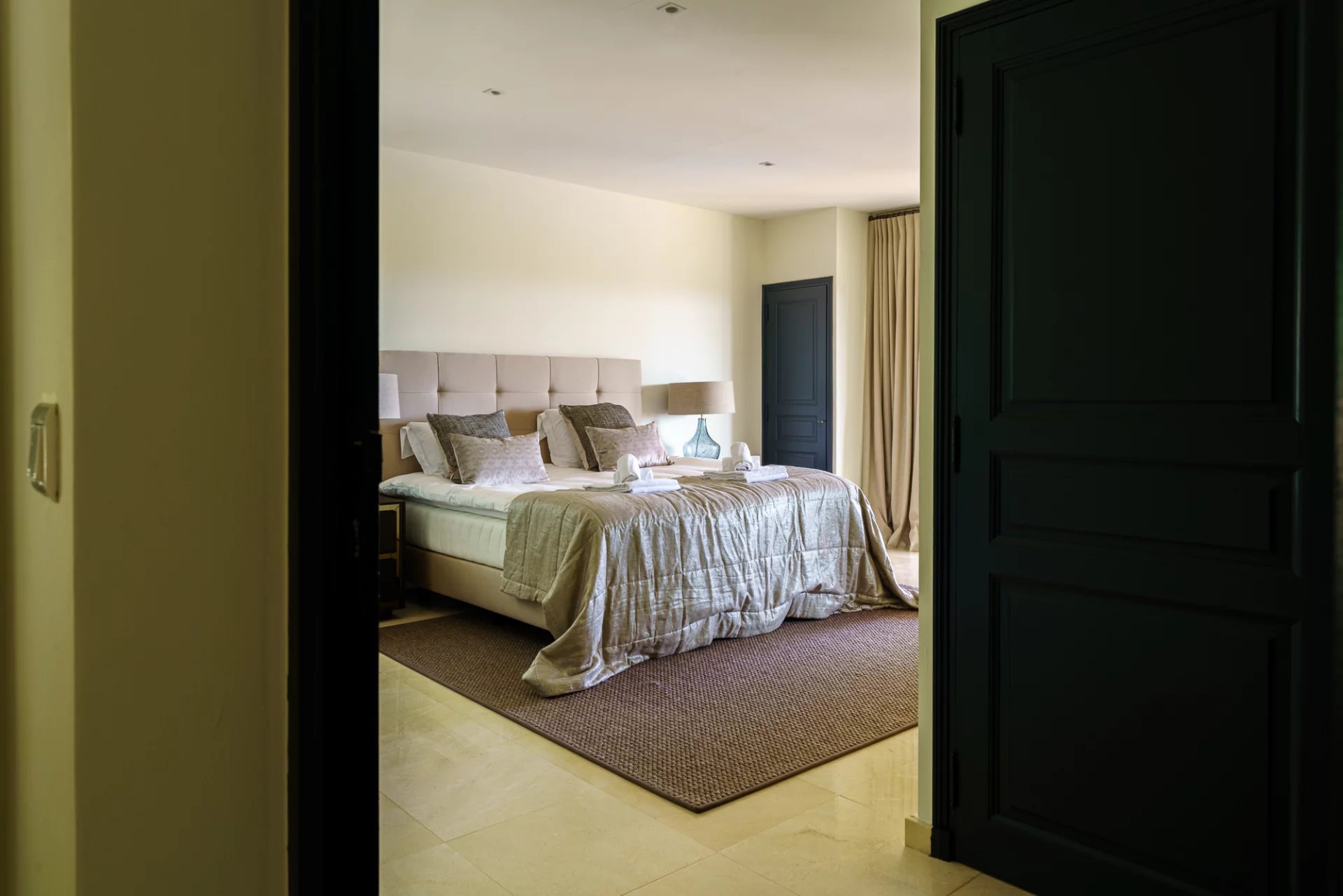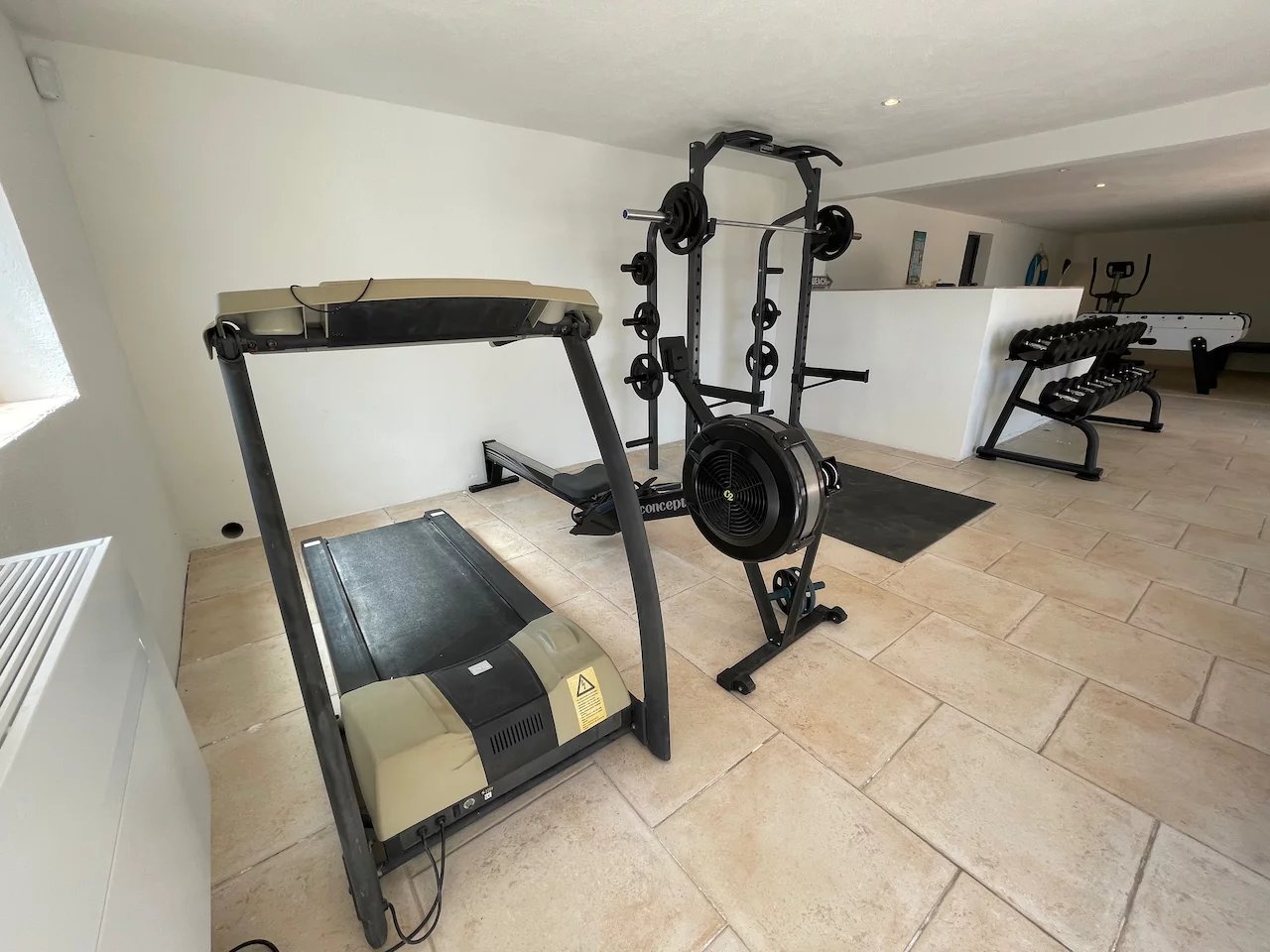Ici on trouve un lit double et la 5ème salle de bain privée avec douche, double lavabo et toilette. La 6ème chambre est située au niveau du sousterrain / piscine, idéale pour les plus jeunes, et également équipée d'une salle de bain privée. A ce niveau se trouve également une 2ème cuisine, une salle TV taille XXL, une salle de sport avec divers équipements de fitness et encore une fois la climatisation.