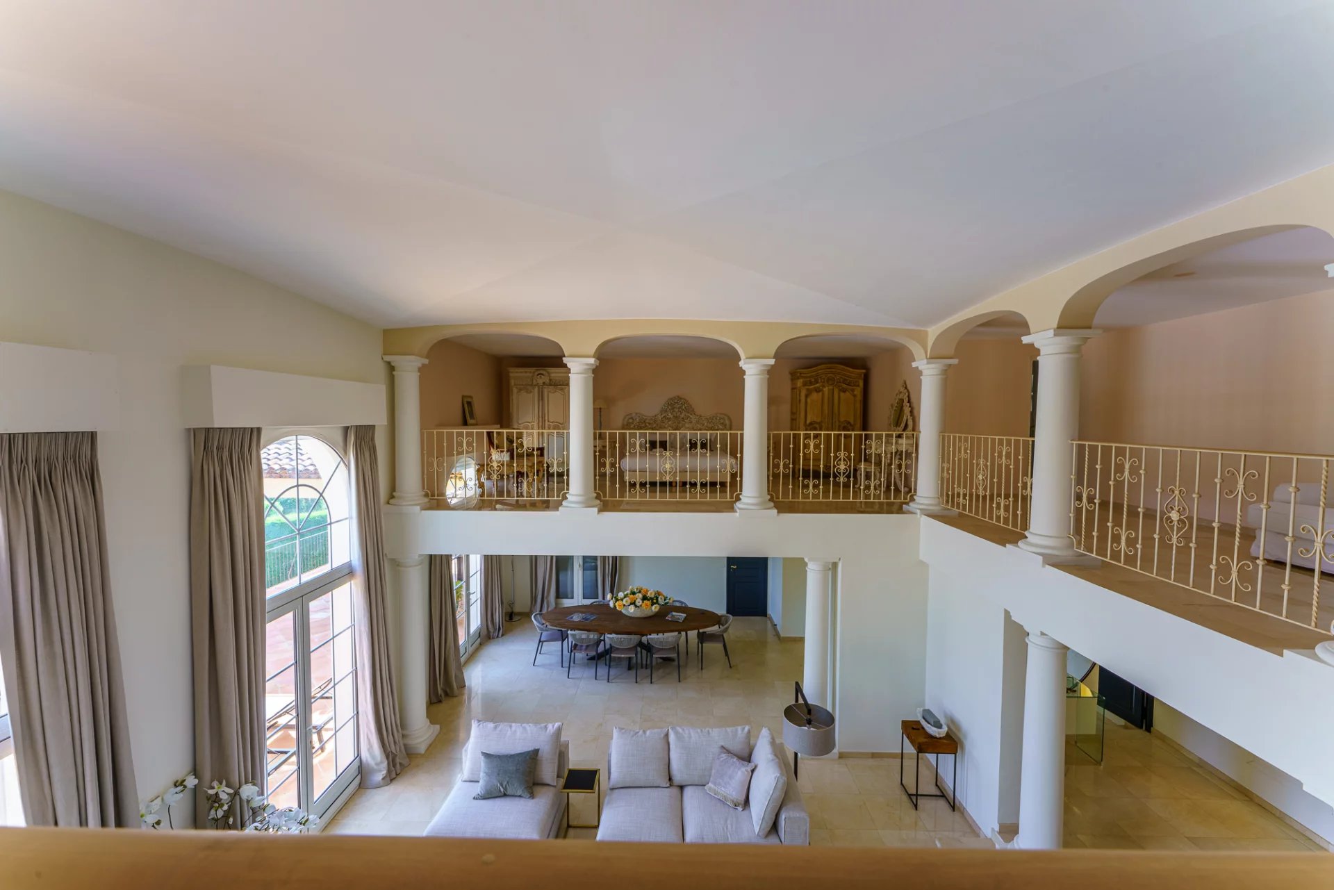 Par le hall d'entrée, l'escalier mène à la grande et haute mezzanine, en forme de U au-dessus du salon.