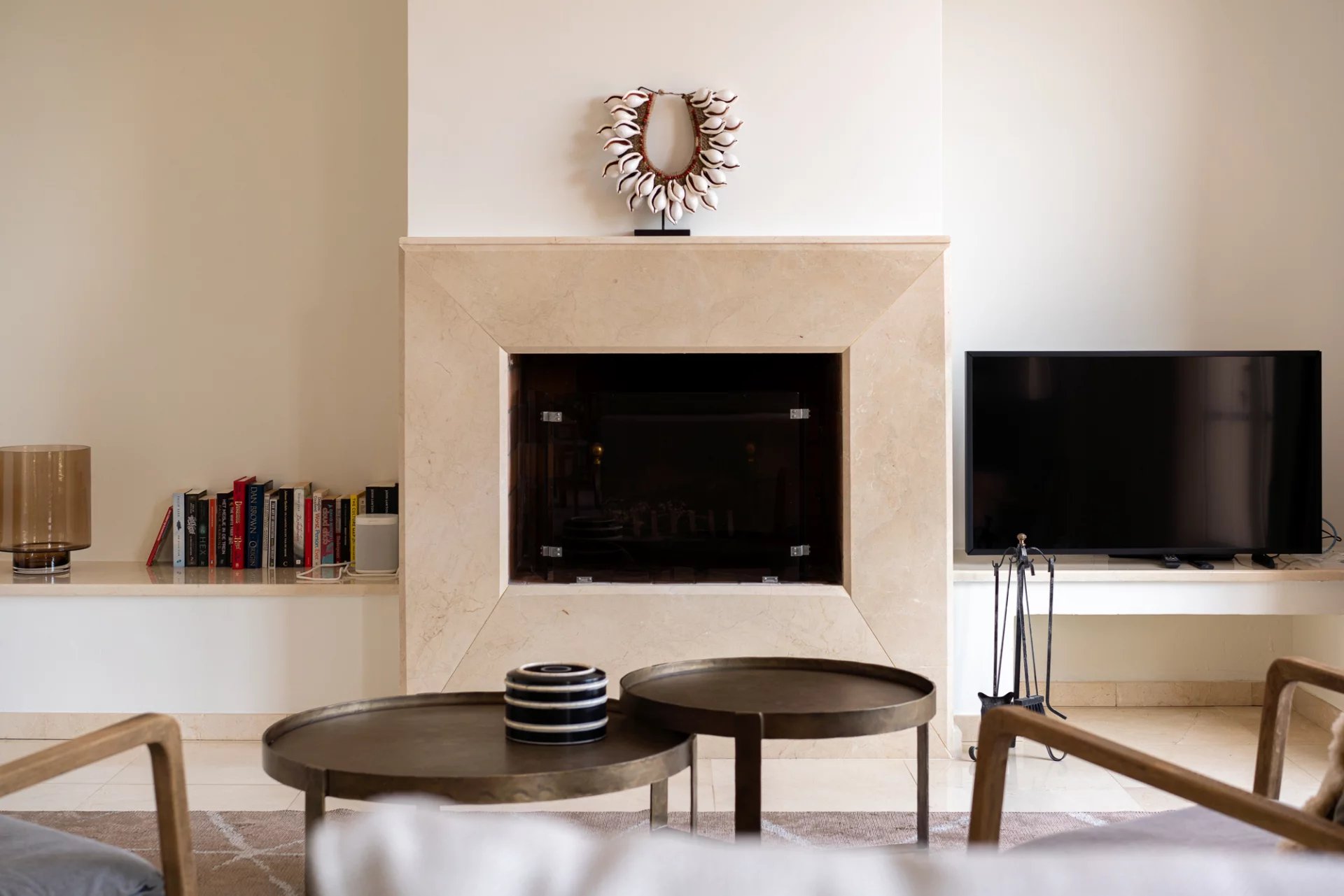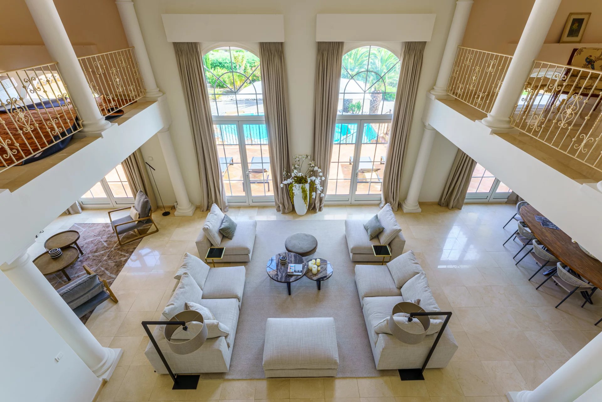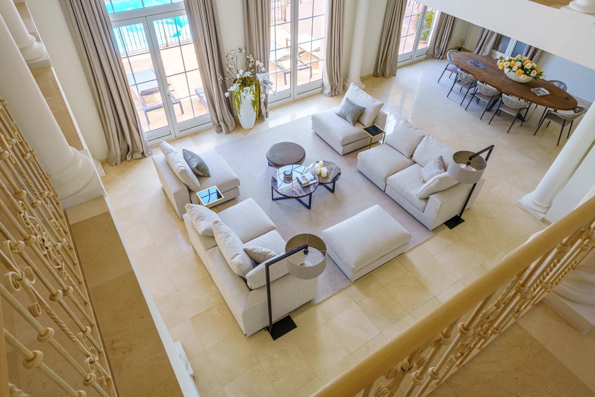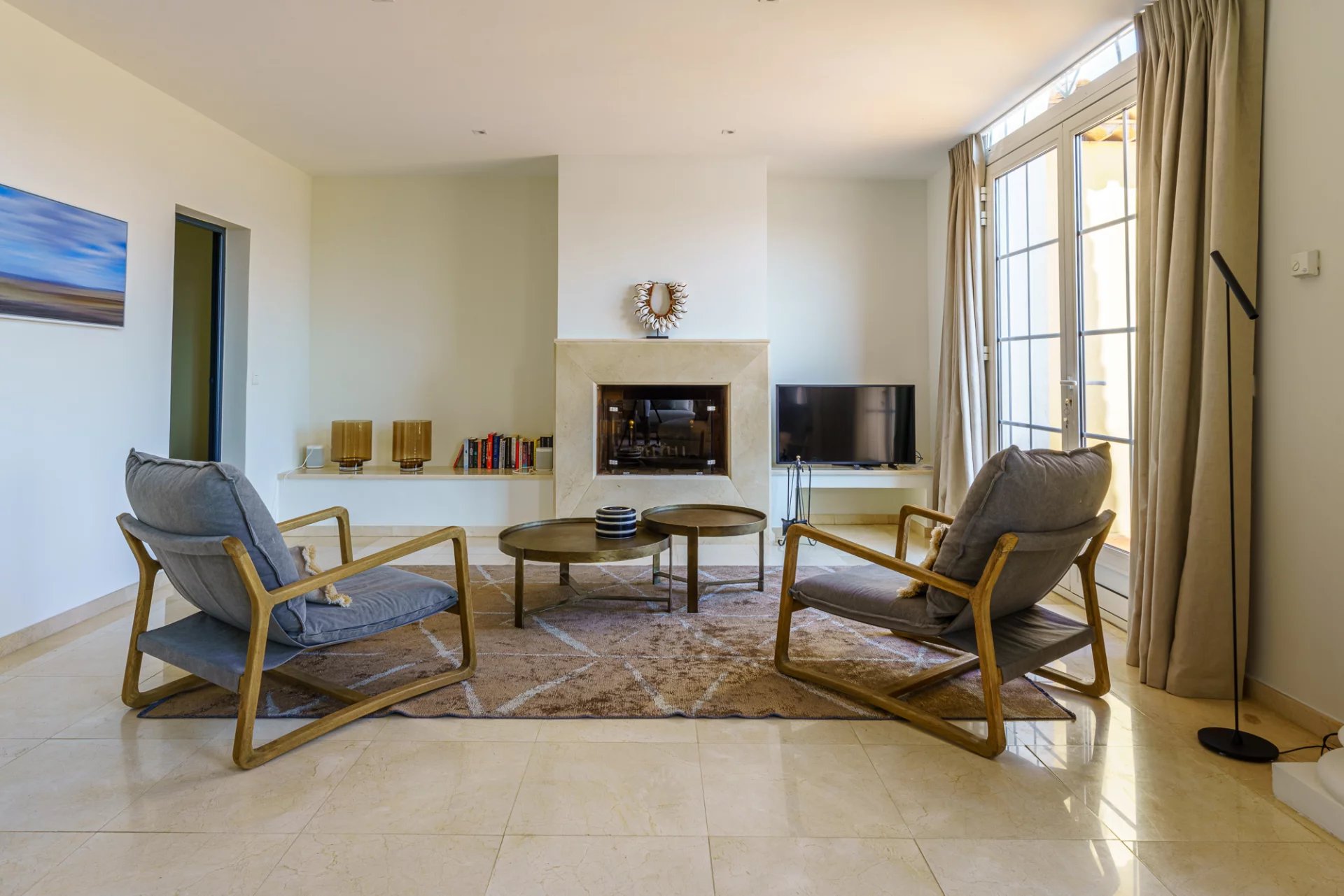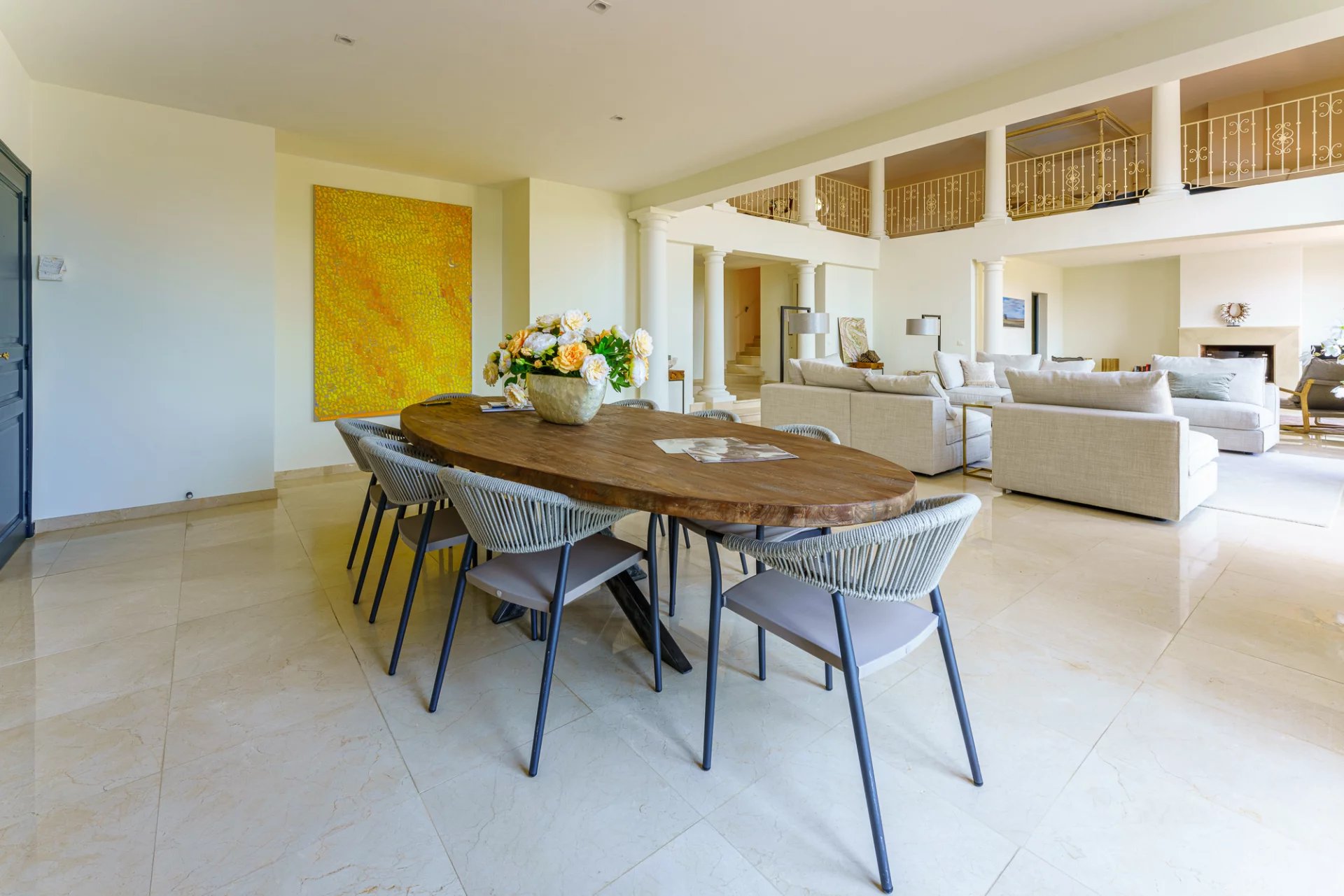 Des marches mènent au grand salon ouvert et très lumineux avec un sol en marbre, un plafond très haut et un mur de verre sur toute la largeur de la pièce. Ici on peut aussi profiter de la belle vue sur la mer ! Il y a une cheminée ouverte, un salon et une salle à manger et une connexion à la cuisine à manger. La cuisine est équipée de tous les appareils électroménagers et a des portes à la grande terrasse couverte à manger sur le côté de la villa. À côté de la cuisine, il y a un espace supplémentaire avec un réfrigérateur et un congélateur.