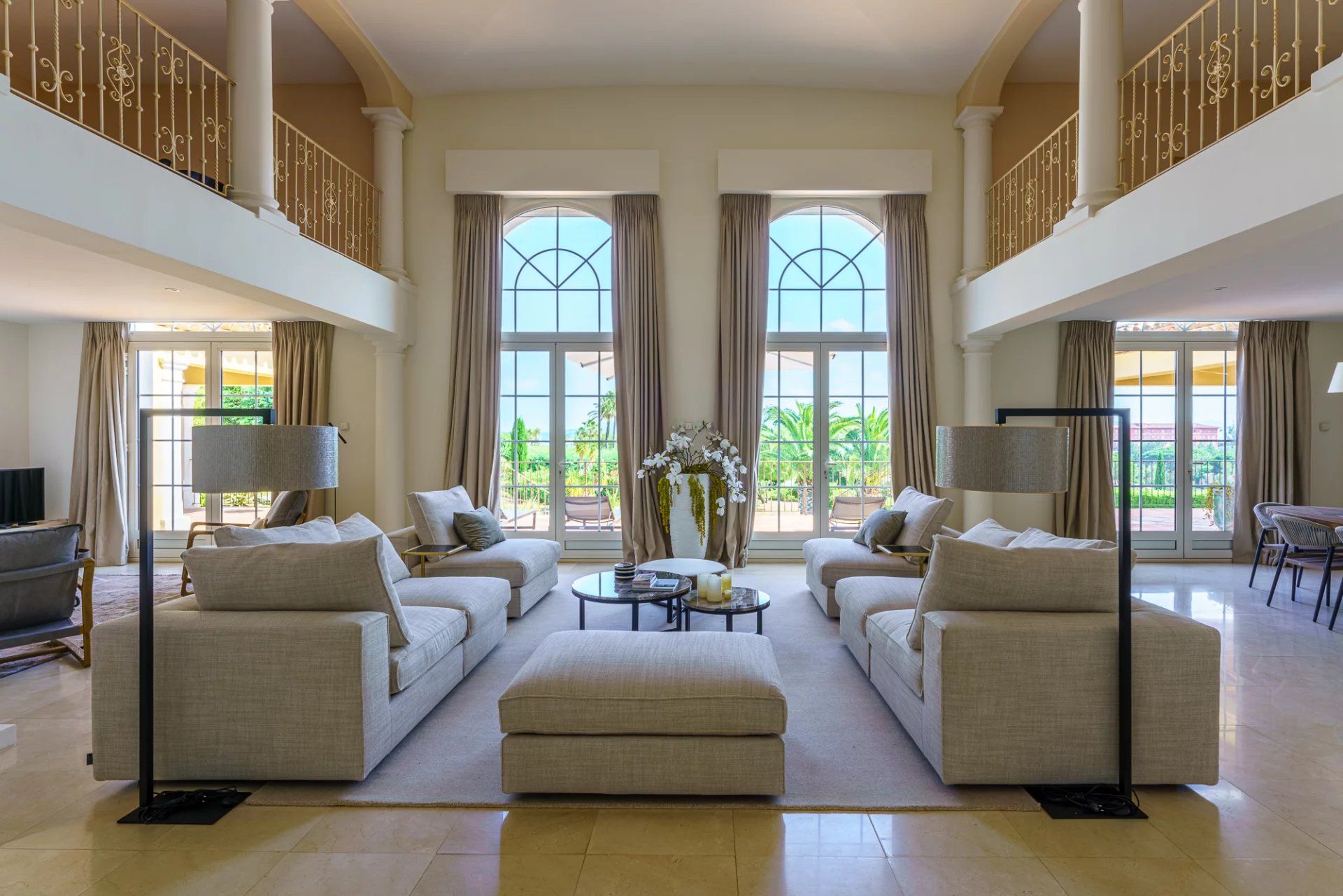 La villa est entièrement équipée de l'air conditionné, a un grand salon avec un haut plafond, 2 salons, une salle à manger, une cuisine moderne et entièrement équipée et toutes les zones à ce niveau ont une connexion à la grande terrasse partiellement couverte avec salle à manger, détente et salon.