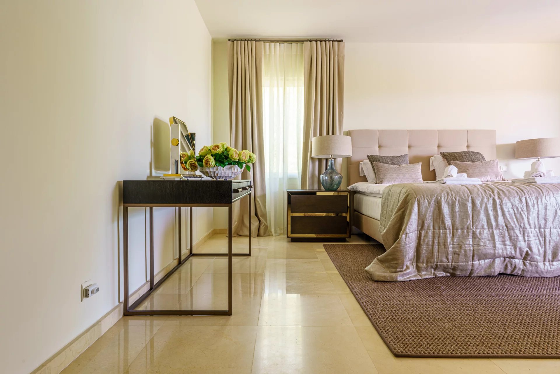 Entrée de la villa avec un grand couloir, 1er WC invités et ascenseur vers le garage. Première chambre à coucher sur le côté avec portes vers le jardin, lit double, placard intégré, climatisation et salle de bain privée avec douche et toilettes.