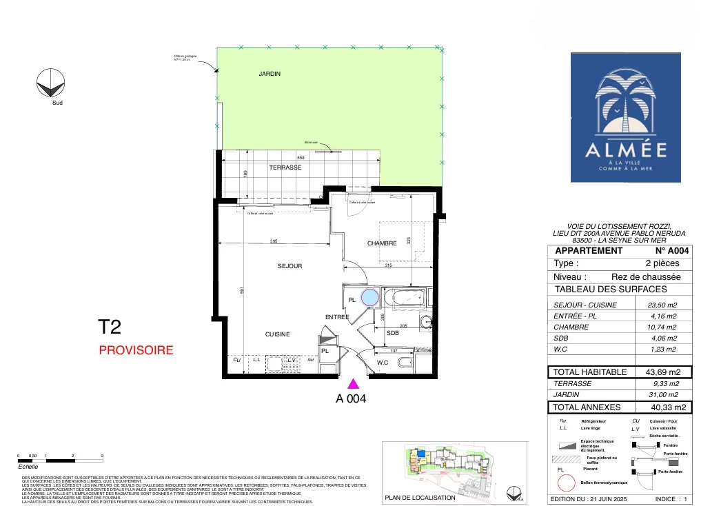 Au coeur de Mar Vivo, dans programme neuf en rez-de-jardin, un séjour/cuisine de 23.50m², une chambre de 10.74m², salle de bain, wc indépendant, une terrasse de 9.33m² et un jardin de 31m². Certification confort acoustique et thermique. livraison prévue 3ème trimestre 2027
