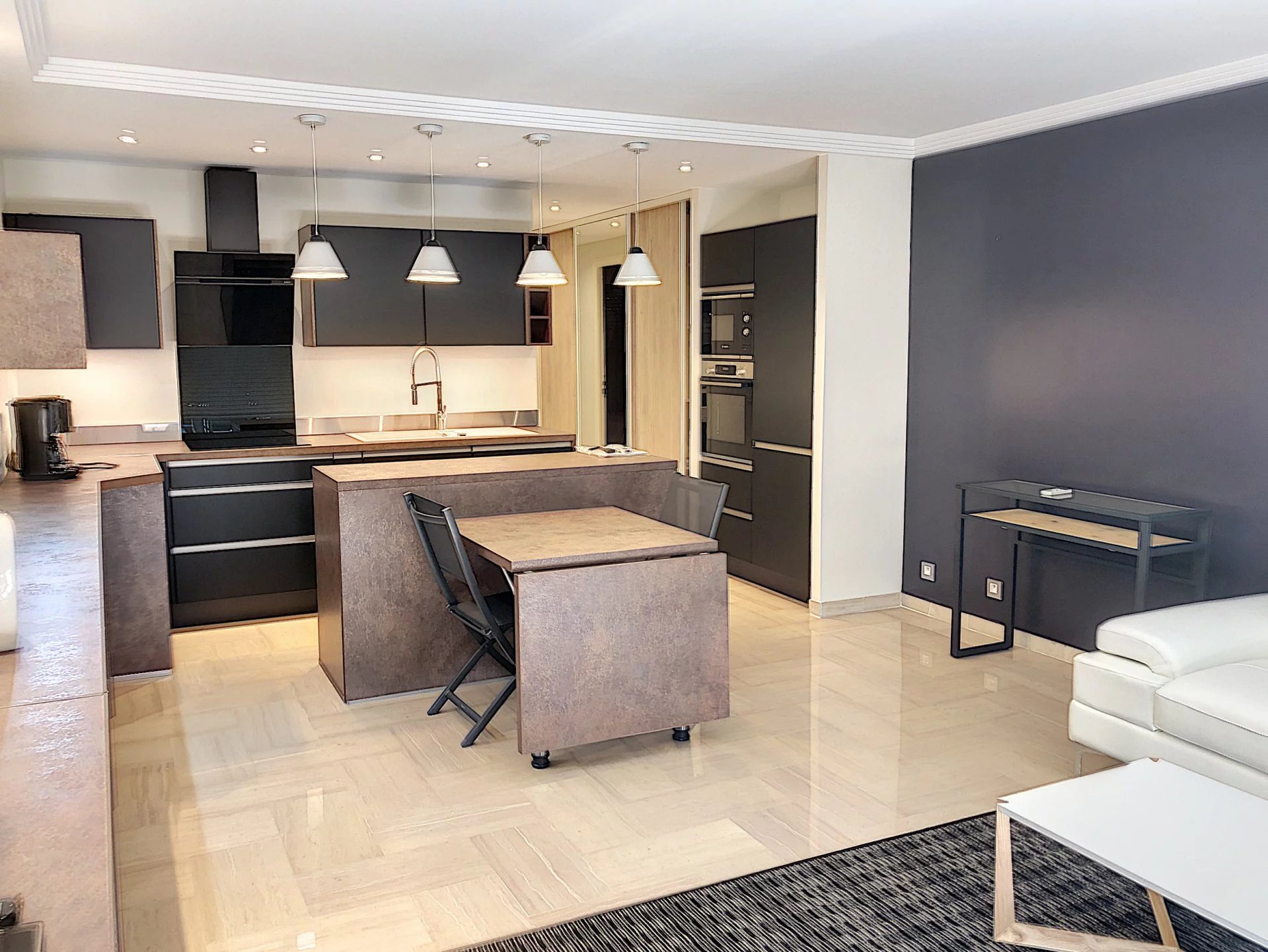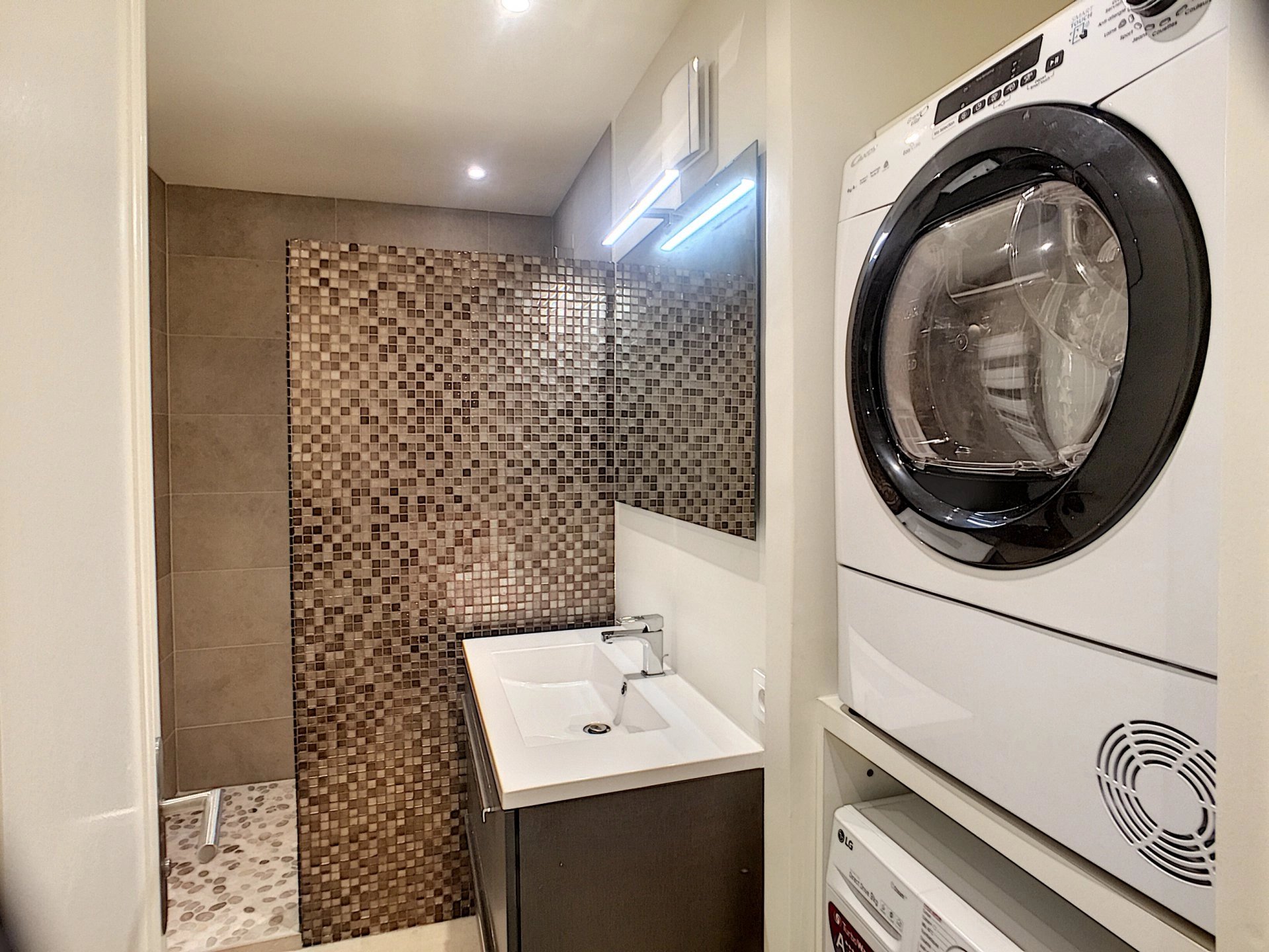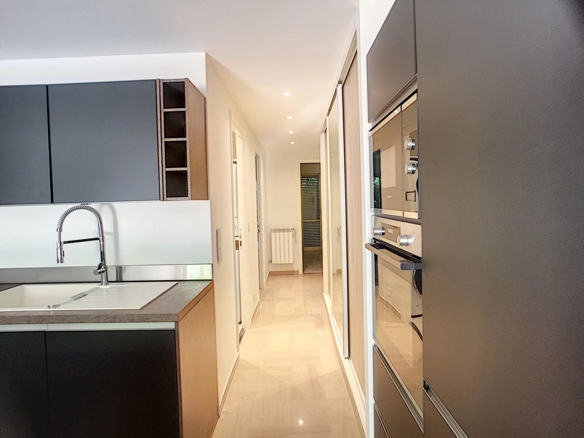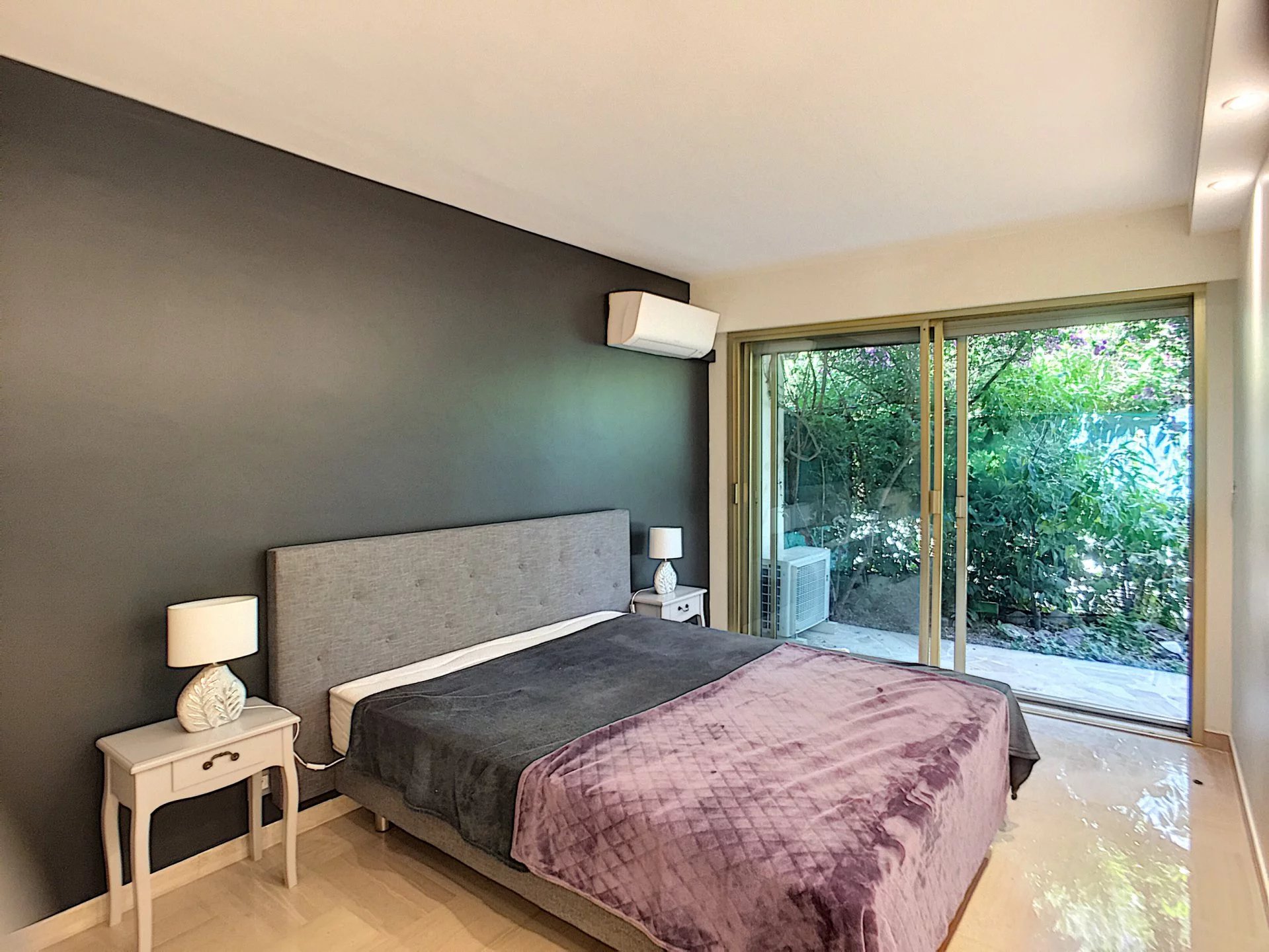 Cannes, Midi, bord de mer, dans un havre de paix, environnement verdoyant, à deux pas des plages, proche du centre, dans résidence sécurisée avec gardien parc et piscine, appartement villa climatisé de 3 pièces de 60m² et 21m² de jardinet, très belles prestations neuves contemporaines, comprenant un séjour avec cuisine américaine, 2 chambres donnant sur une 2ème terrasse, une salle d'eau avec toilettes, Couchage 2/4 personnes Accès Internet, wifi