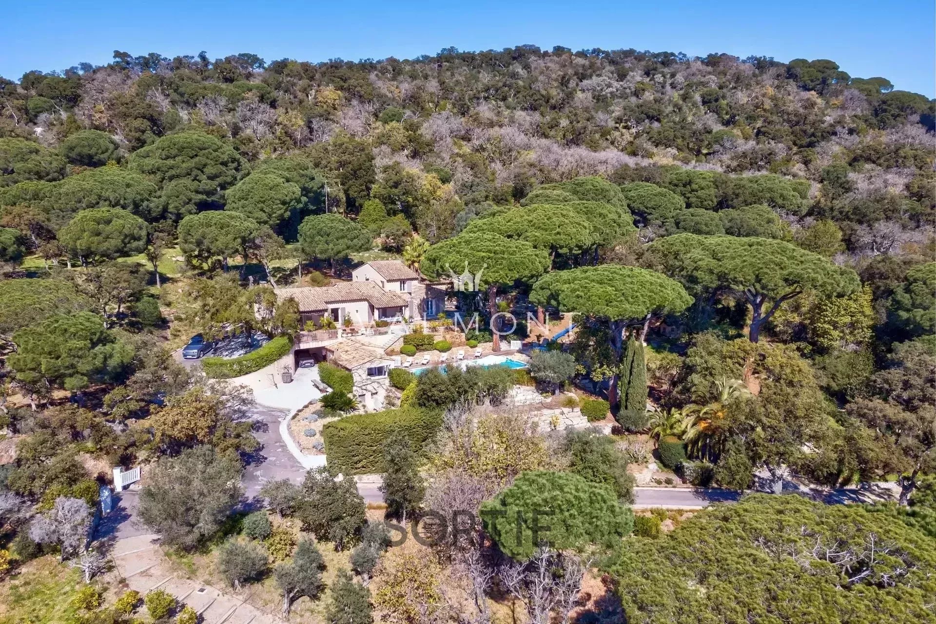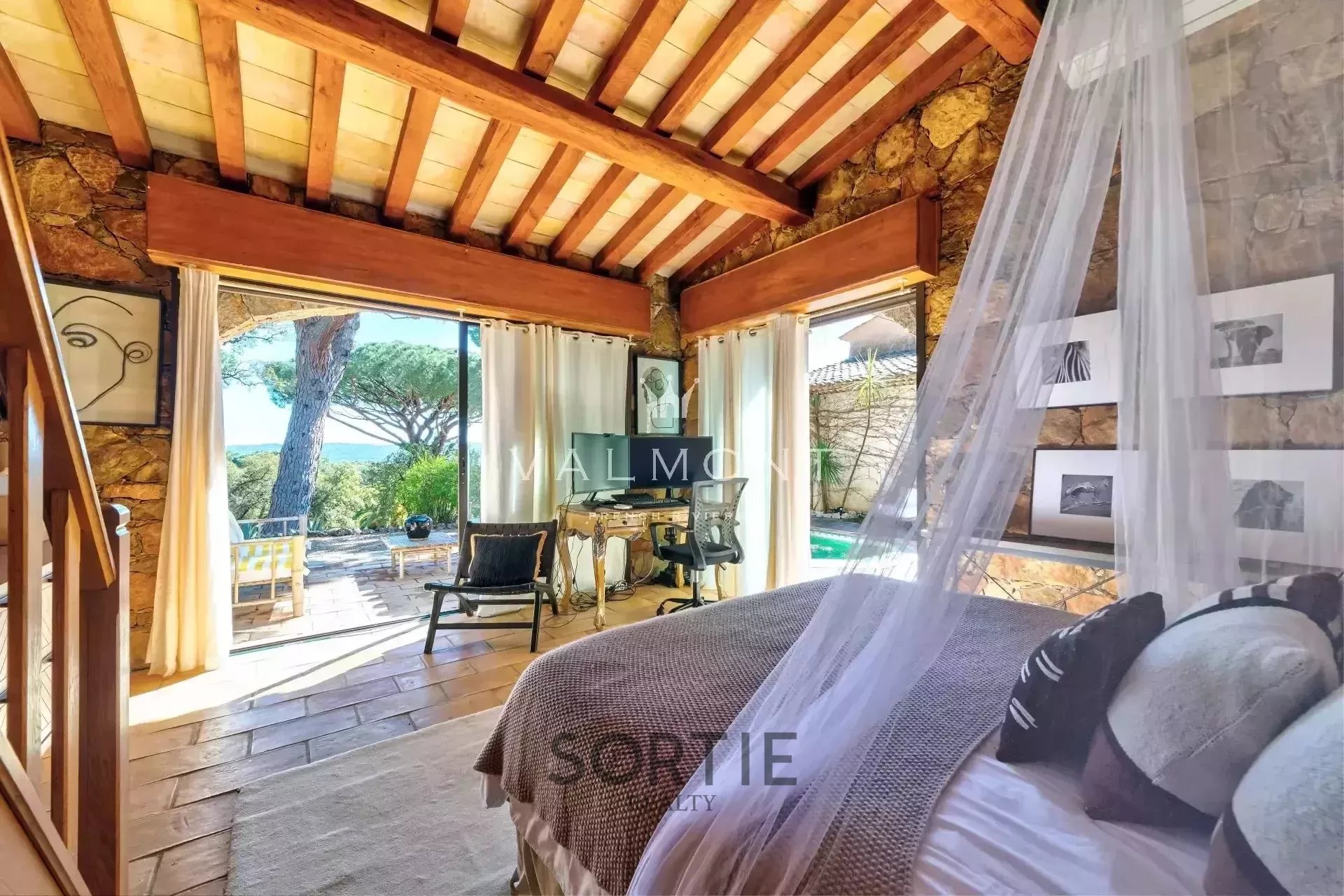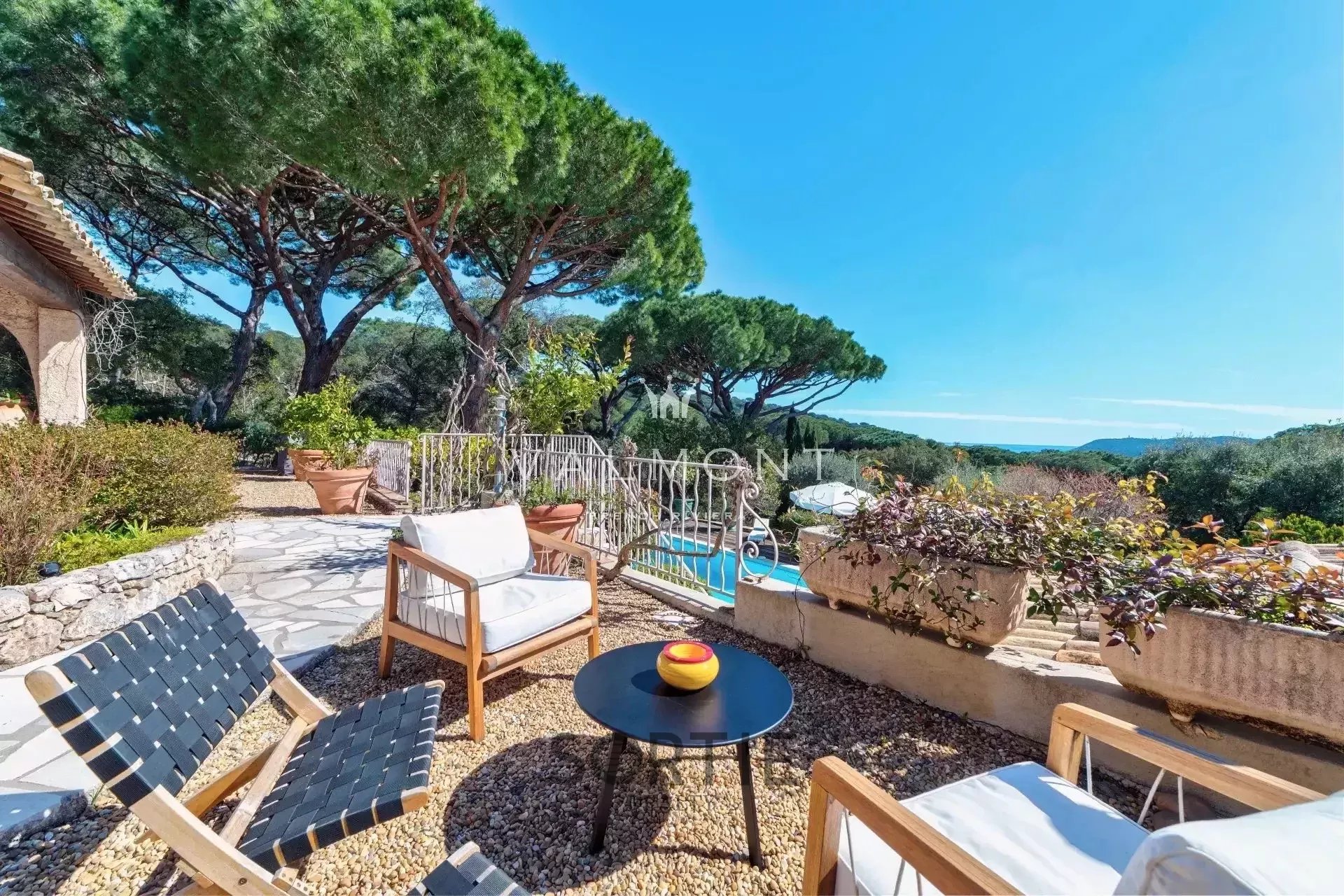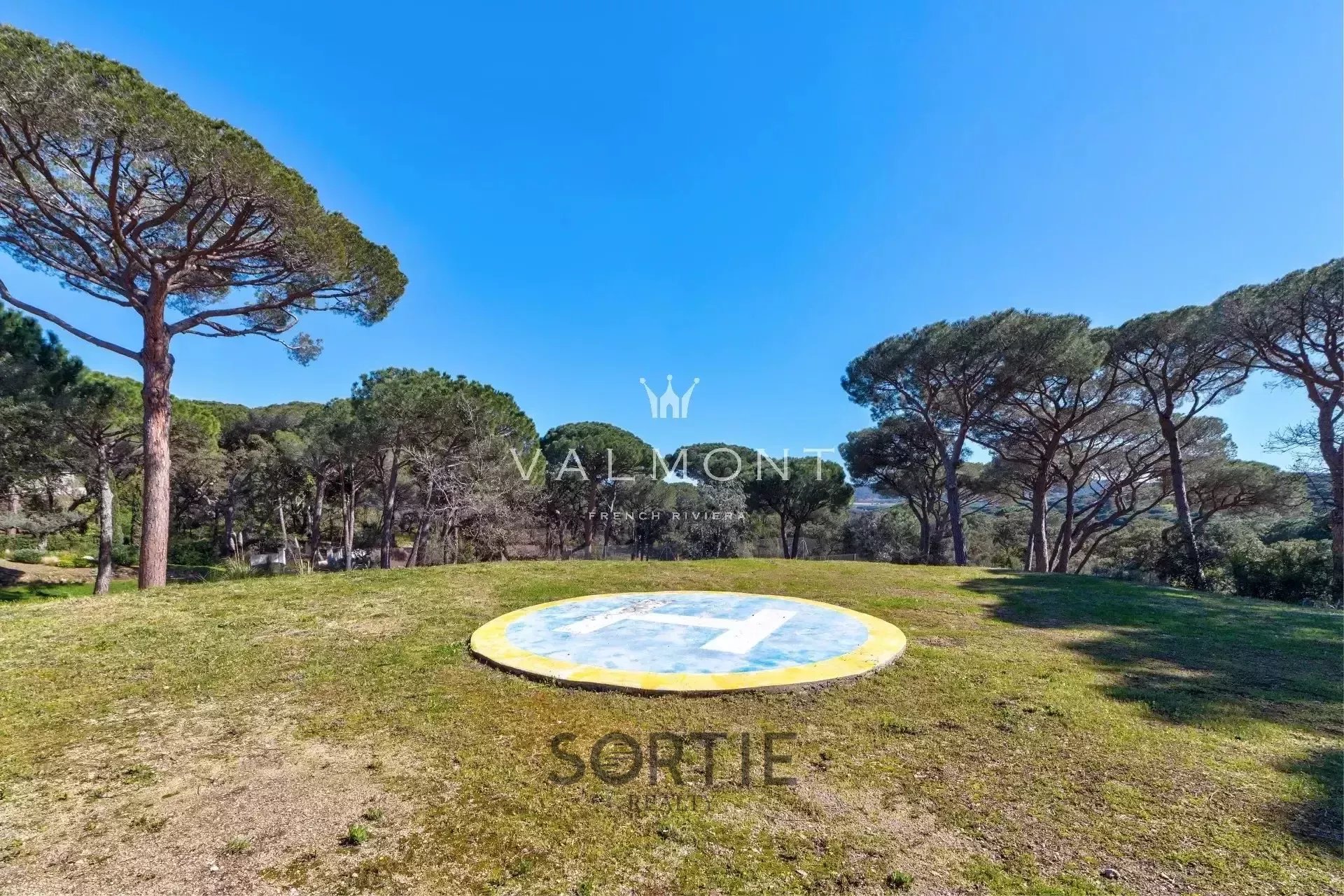 Idéalement située à Ramatuelle, cette magnifique villa offre une vue imprenable sur la campagne et la mer au loin. La maison principale dispose d’un vaste salon et d’une salle à manger s’ouvrant sur une grande terrasse, offrant une parfaite harmonie entre intérieur et extérieur. Elle comprend **quatre spacieuses chambres** et **trois salles de bains**, dont une somptueuse suite parentale à l’étage. Une maison d’amis indépendante garantit intimité et confort supplémentaire, avec **deux chambres supplémentaires** et **une salle de bains**, ainsi qu’un élégant pool house. Érigée sur un **terrain de 1,5 hectare**, la propriété bénéficie d’équipements d’exception, incluant **un court de tennis et un héliport privé**, tout en profitant d’un panorama à couper le souffle. Une opportunité rare d’allier luxe et sérénité dans l’un des lieux les plus prisés de la Côte d’Azur.