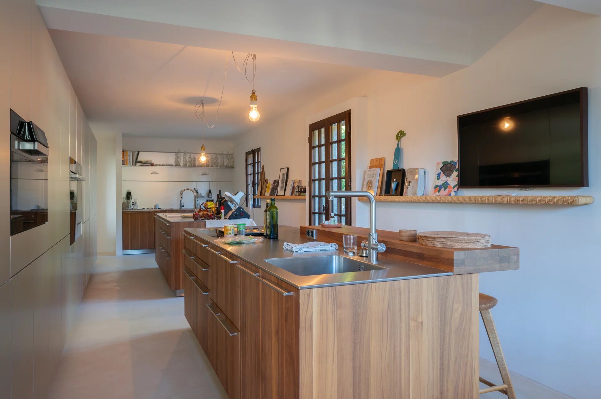Une buanderie, cellier et garage terminent le niveau avec une cuisine d’été surplombant la piscine.