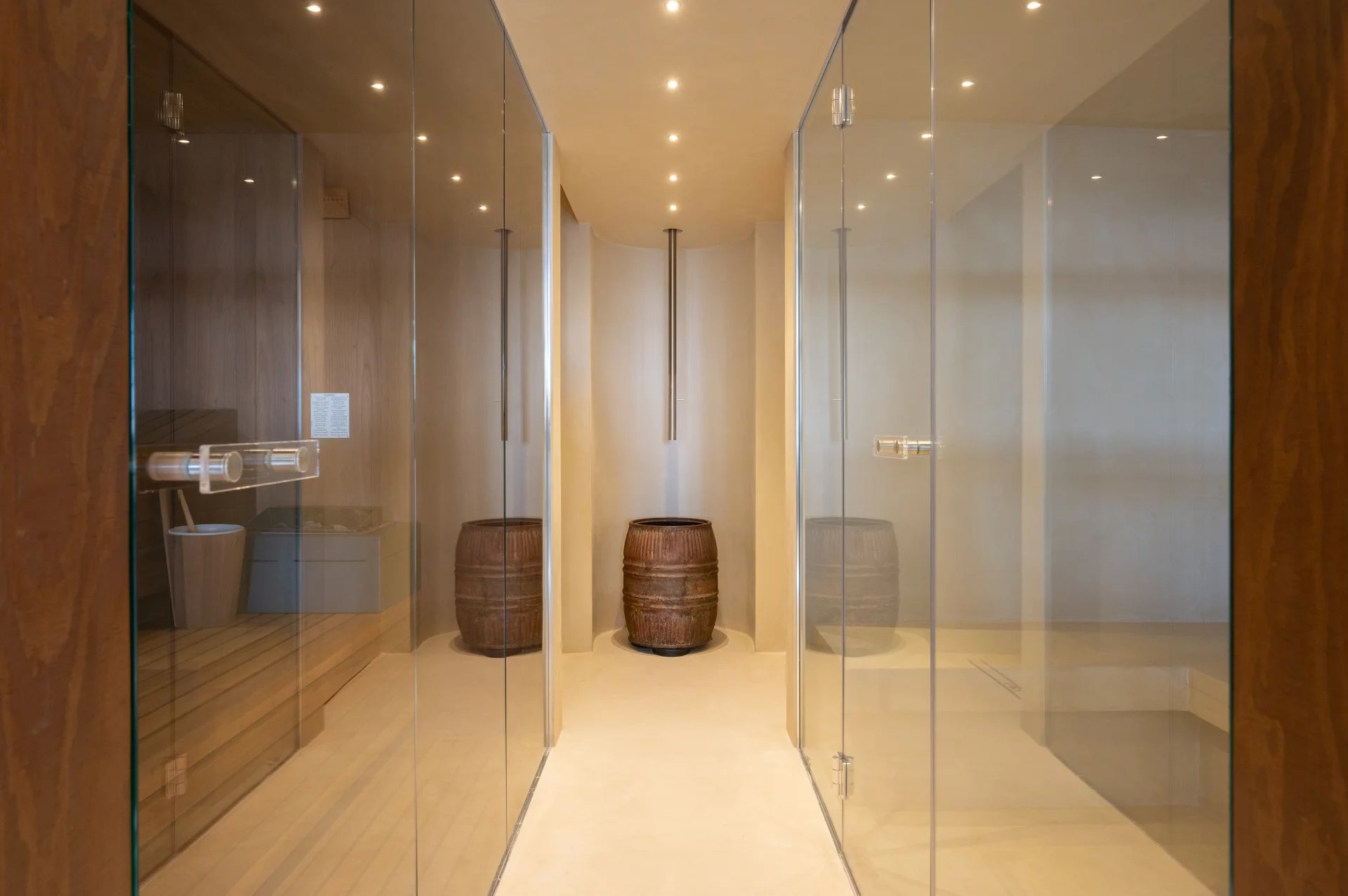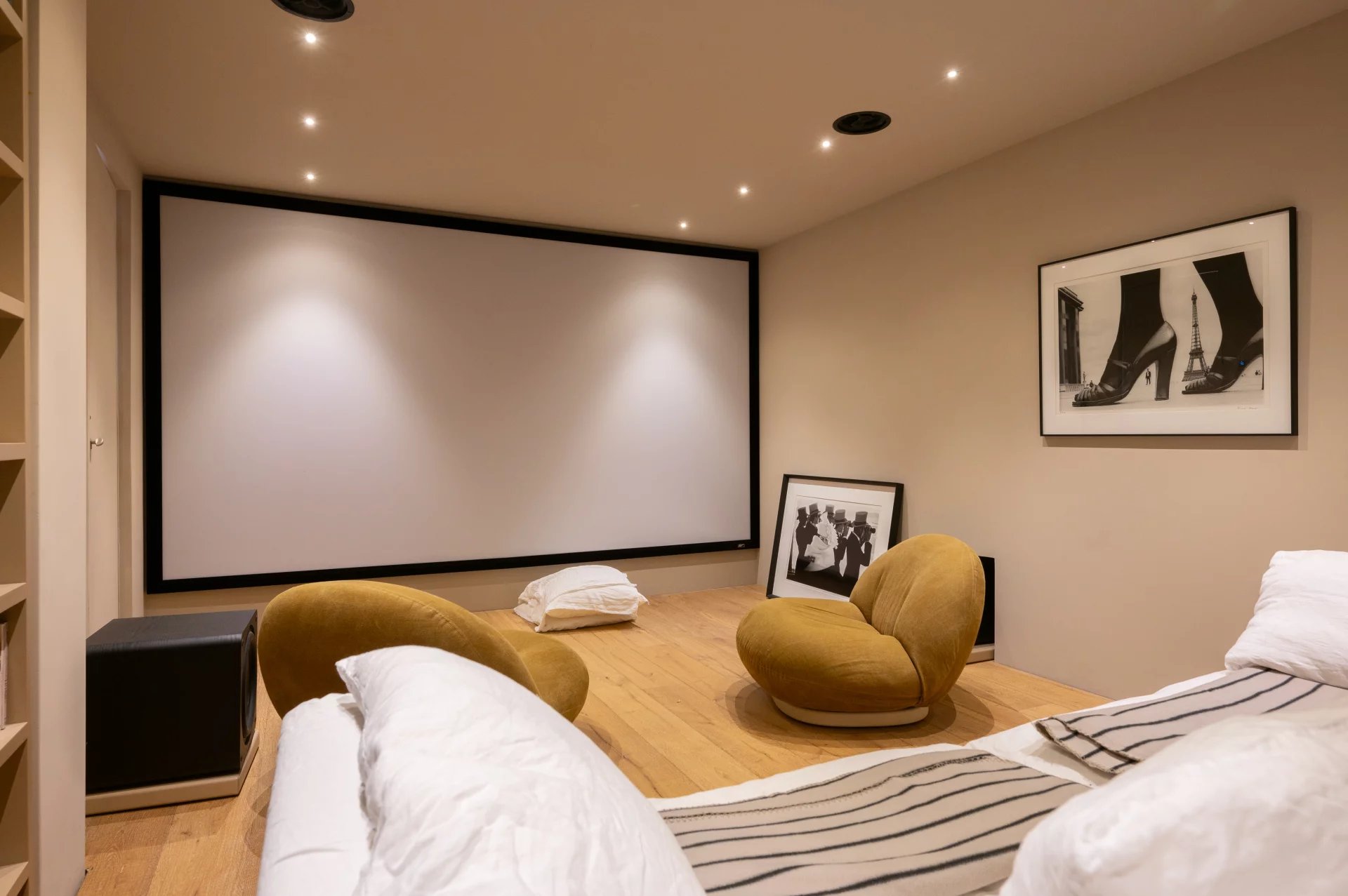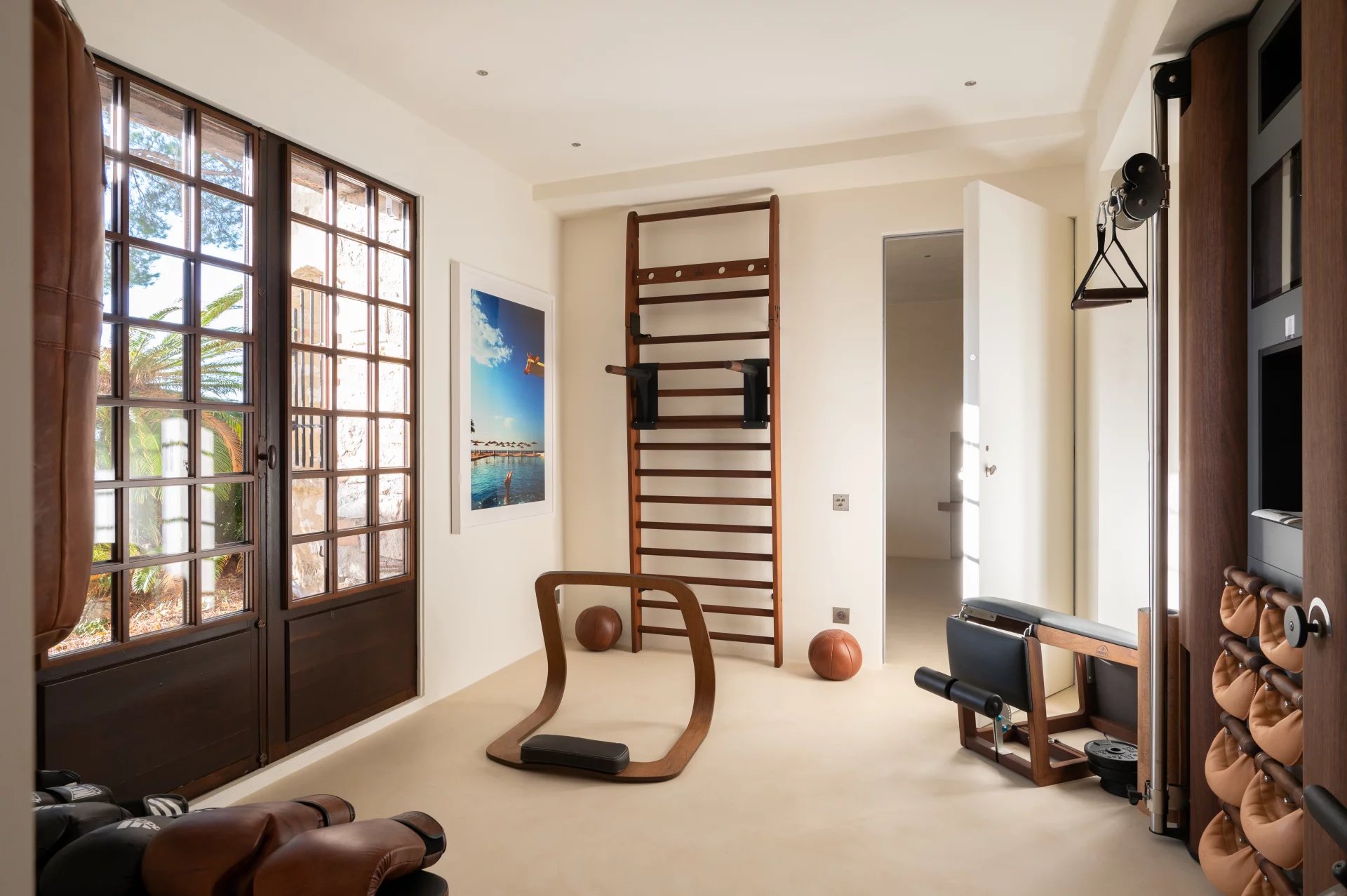 Le rez-de-jardin quant à lui se compose d’une dernière suite avec salle d’eau et dressing, d’un salon bibliothèque, d’une salle de projection d’un espace spa avec hammam, sauna, Jacuzzi, salle de massage et salle de sport.