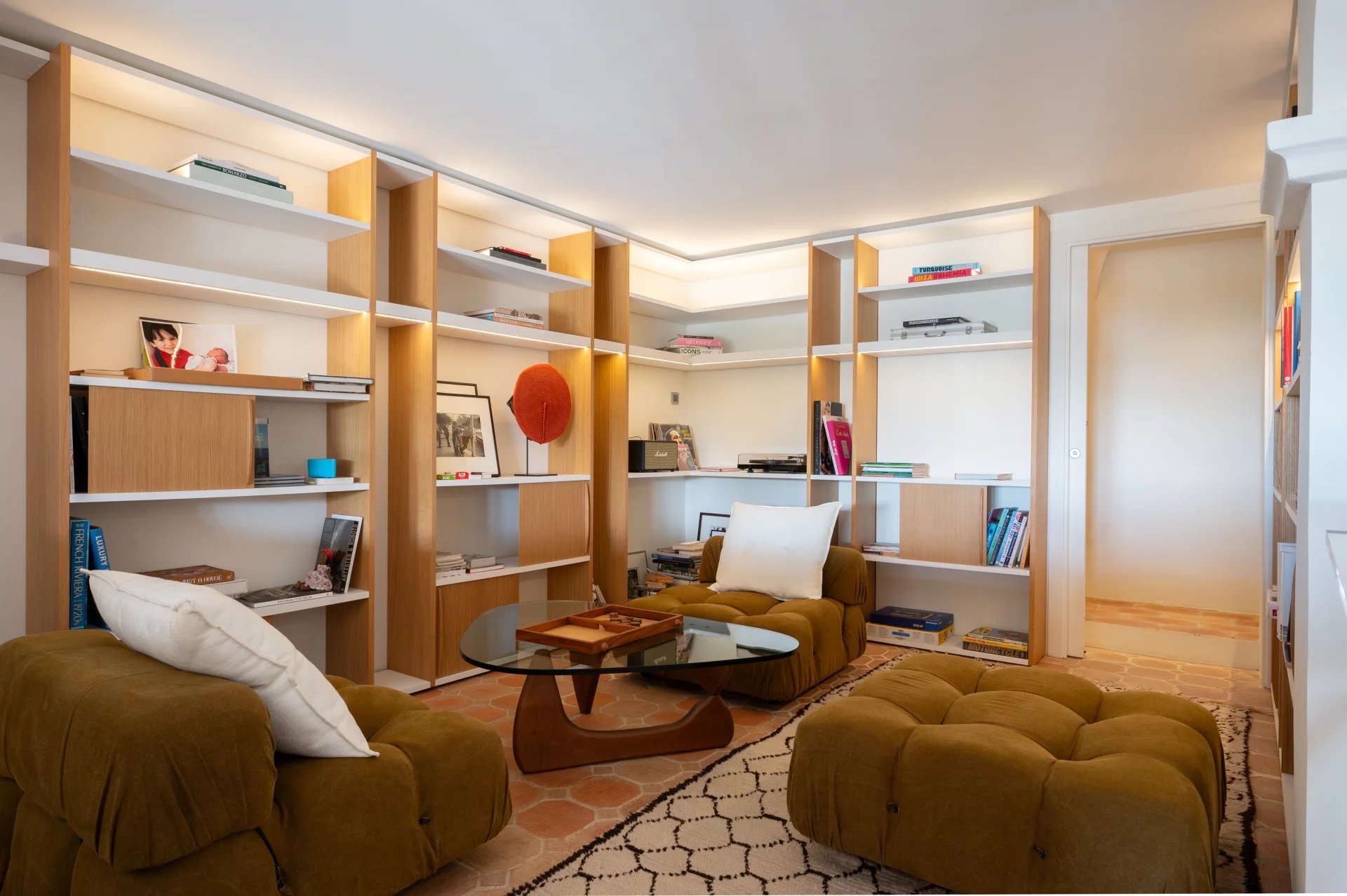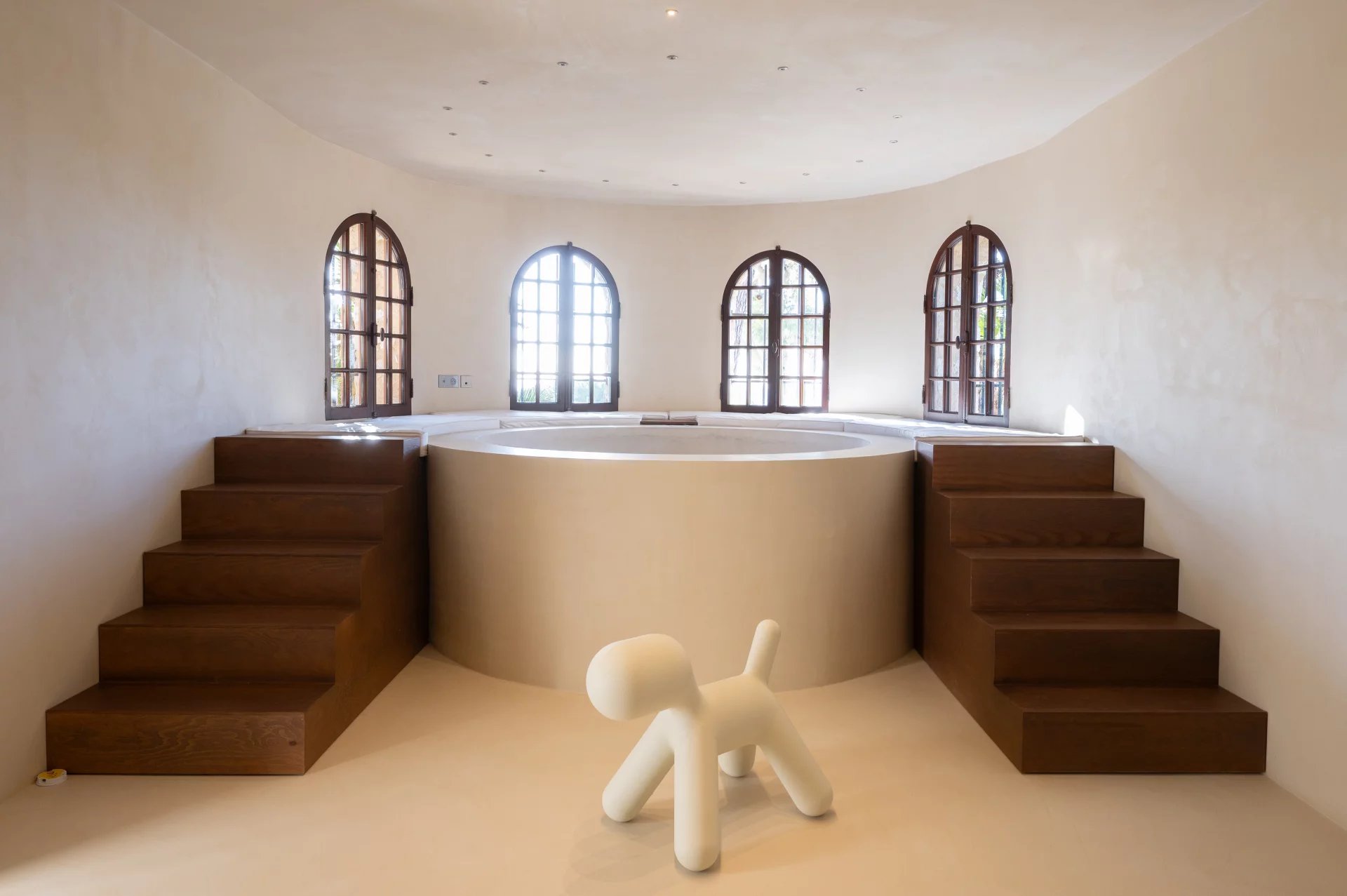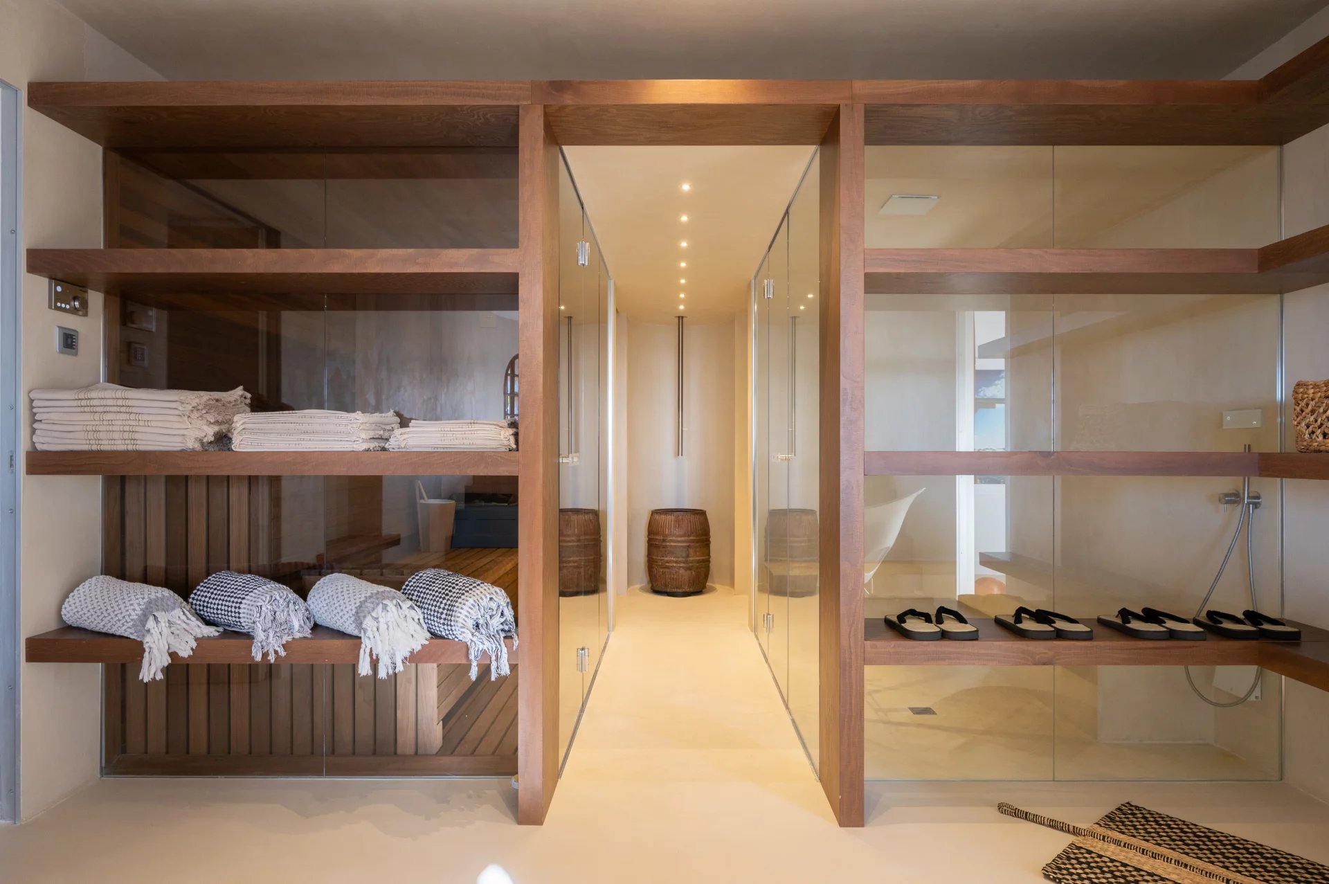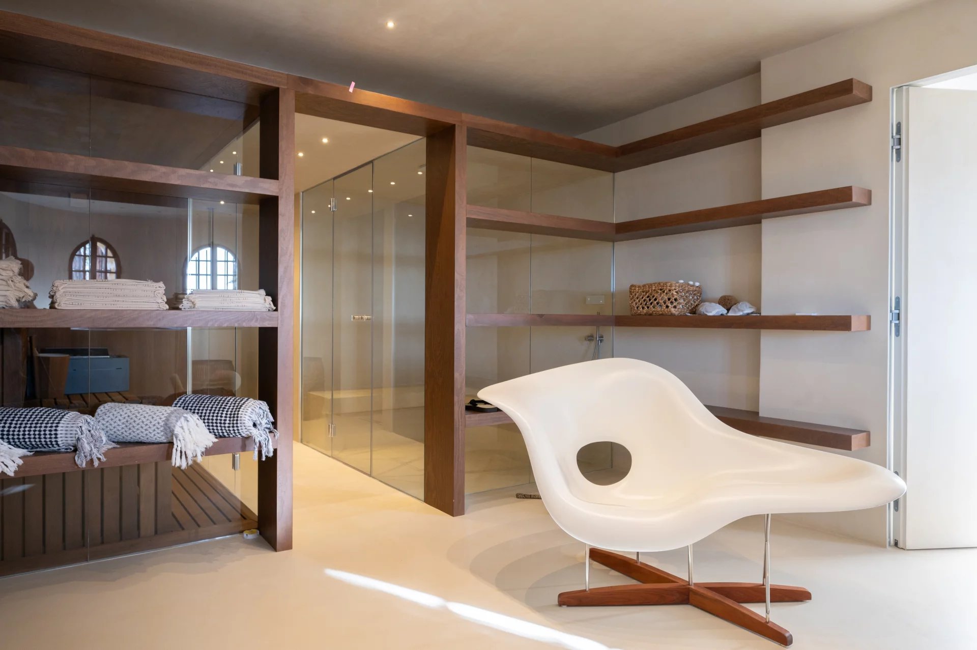 Le rez-de-jardin quant à lui se compose d’une dernière suite avec salle d’eau et dressing, d’un salon bibliothèque, d’une salle de projection d’un espace spa avec hammam, sauna, Jacuzzi, salle de massage et salle de sport.