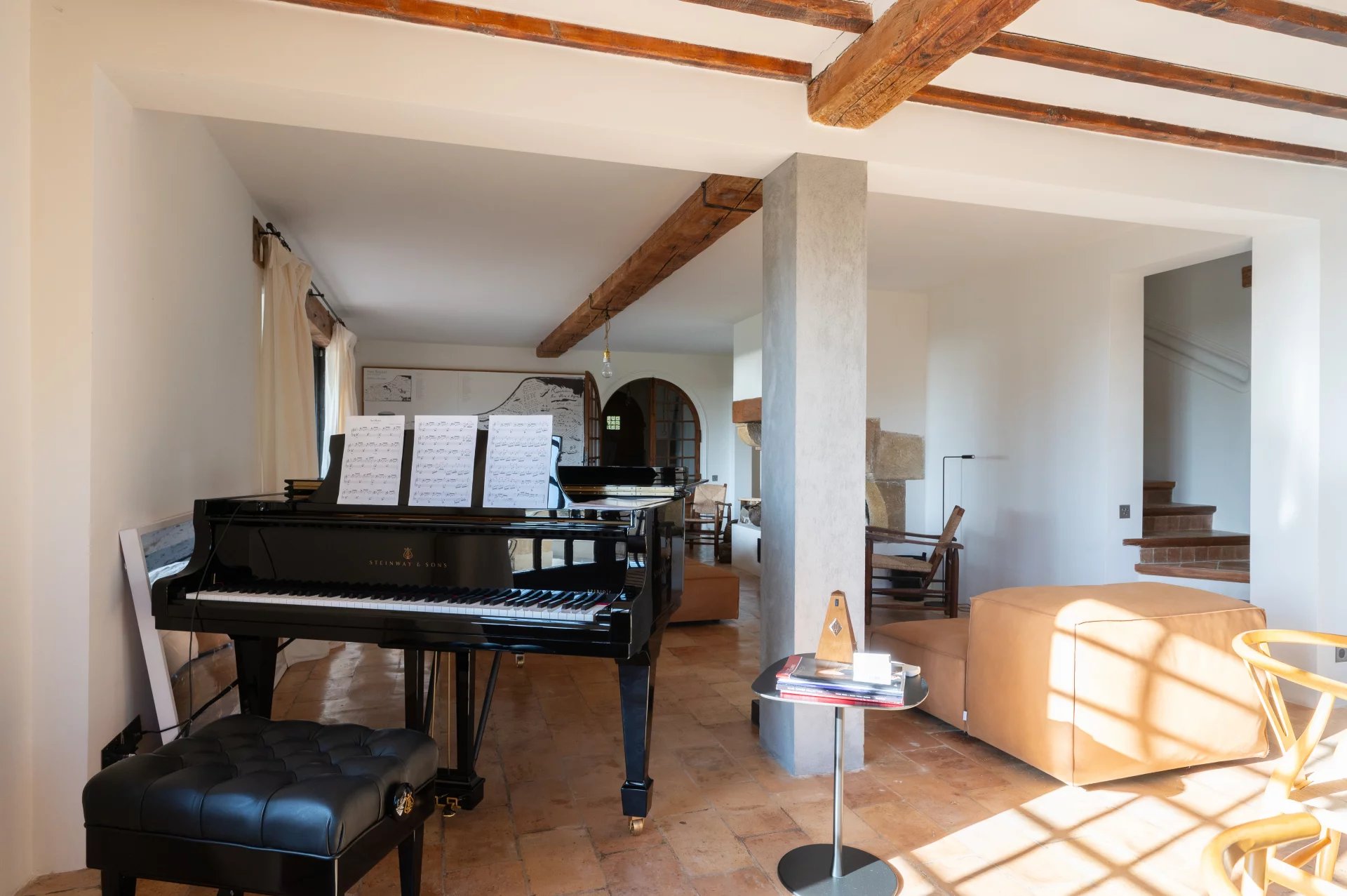 La visite commence au rez-de-chaussée supérieur par un hall d’entrée ouvrant sur un grand séjour avec cheminée et piano à queue formant le salon et la salle à manger. La pièce s’ouvre vers l’extérieur par une grande baie à galandage donnant sur une terrasse faisant face aux remparts de Saint Paul de Vence. A l’arrière, une très grande cuisine équipée. Une chambre d’invités avec salle d’eau et wc et une chambre/bureau avec salle de bains et wc terminent le niveau.
