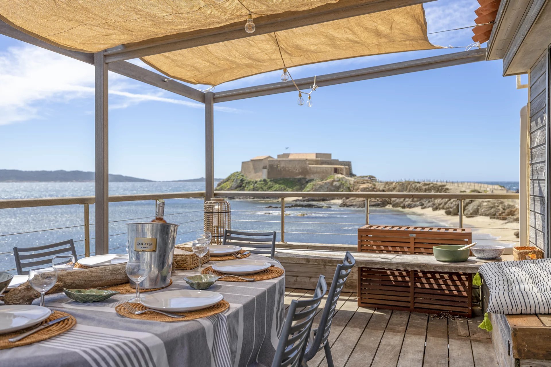 Location les pieds dans l’eau face à Porquerolles : C’est au bout de la presqu’île de Giens en façade Sud que l’on découvre cette petite maison front de mer faisant face à Porquerolles et au fortin de la Tour Fondue. Cette propriété, pieds dans l’eau, d’une surface de 144 m2 habitables agrémentée d’une vaste terrasse Sud surplombant la mer.
