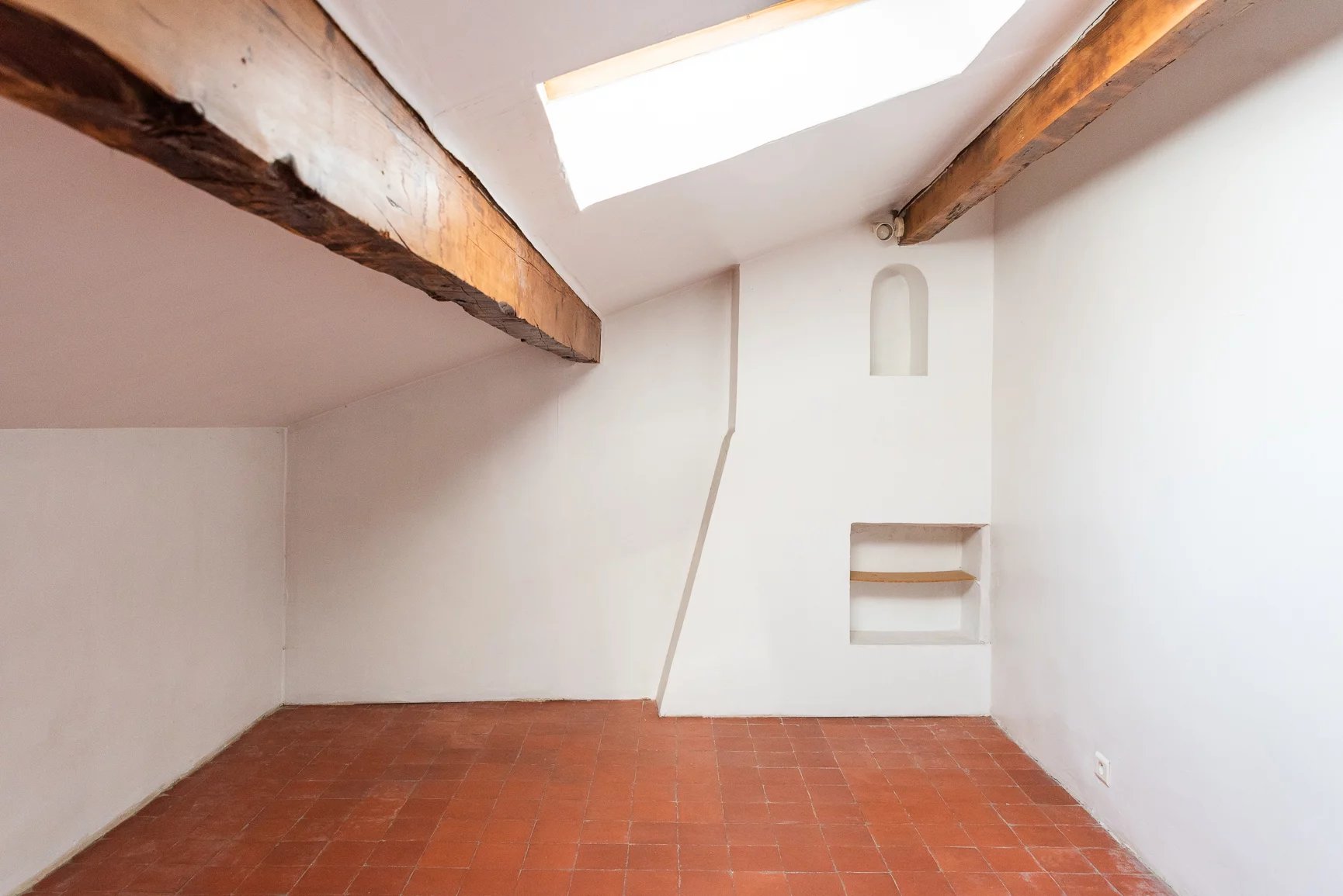 Le dernier étage mansardé s'articule autour d'une grande et une petite chambre, une salle de douche +WC et un débarras.