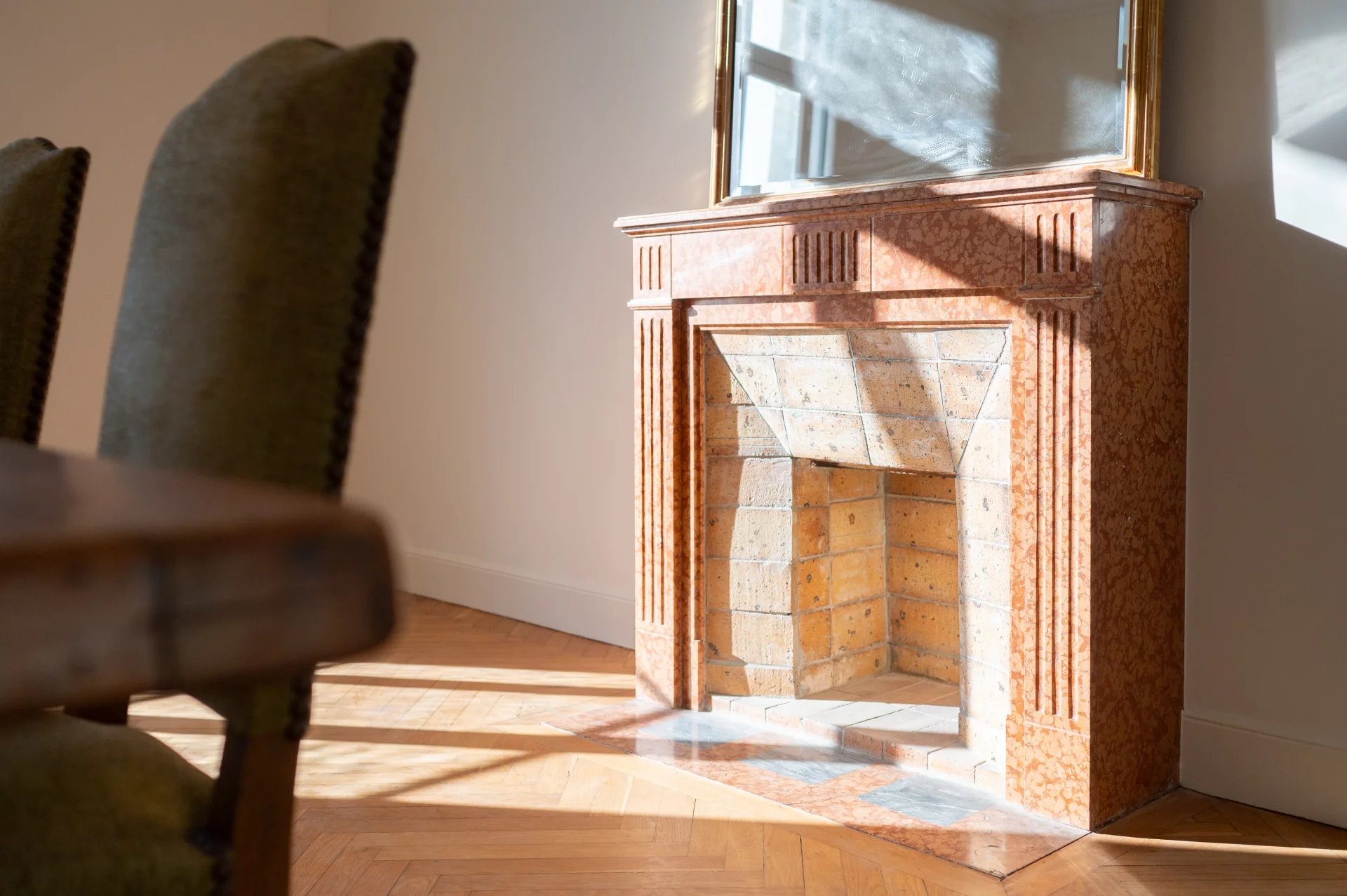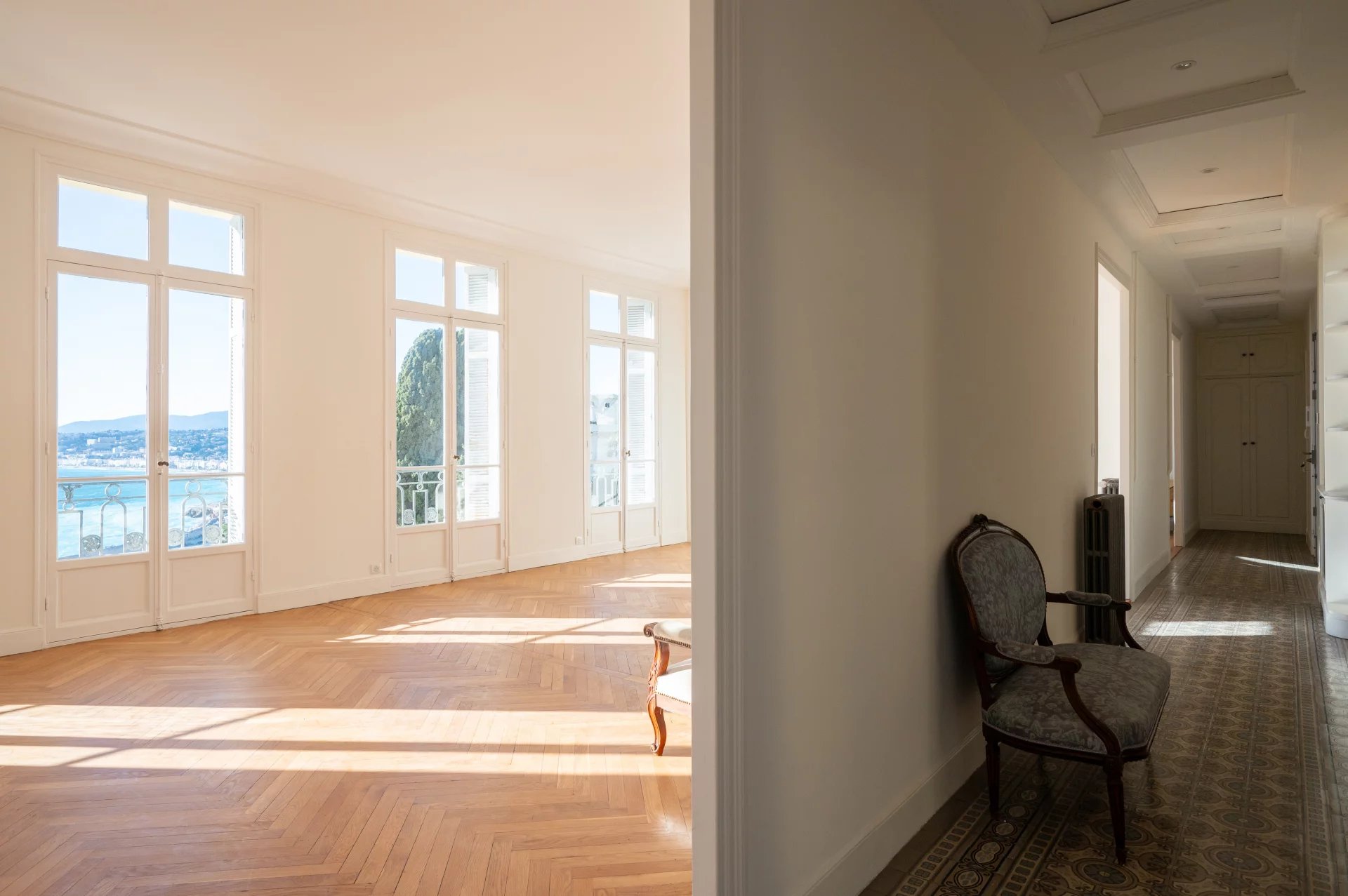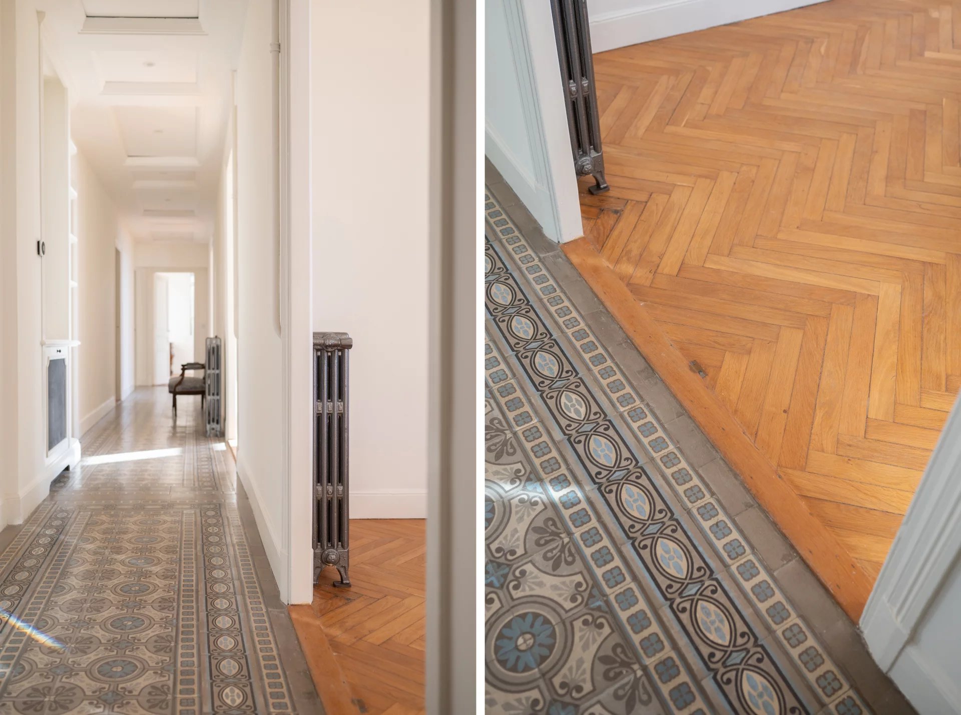 Un grand couloir, aux carreaux ciment d’origine, dessert les différents espaces de l’appartement, une cuisine équipée, une salle à manger avec cheminée, un grand séjour, une chambre de maître avec salle de bains, une chambre avec salle de douche, une troisième chambre, avec salle d’eau indépendante.