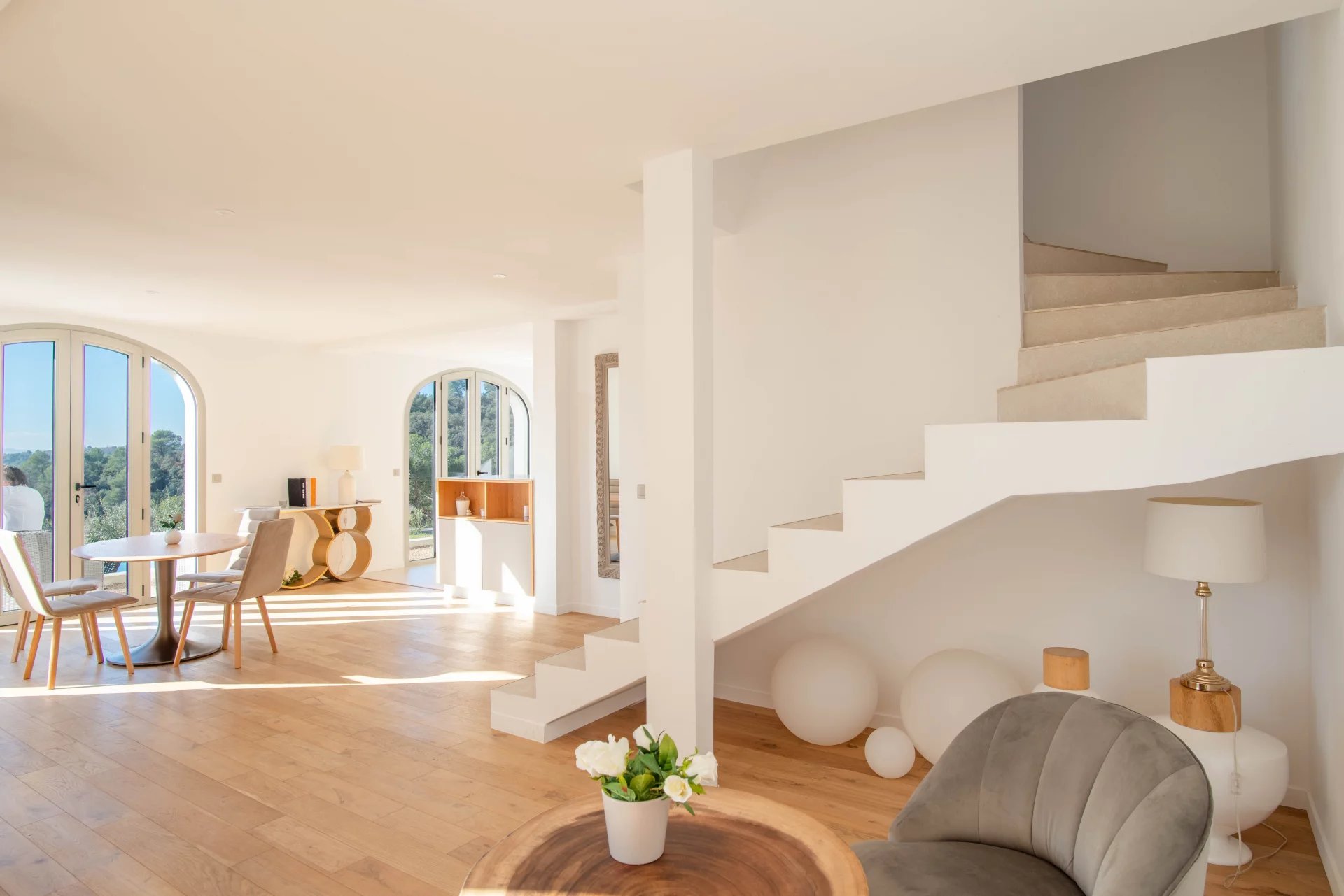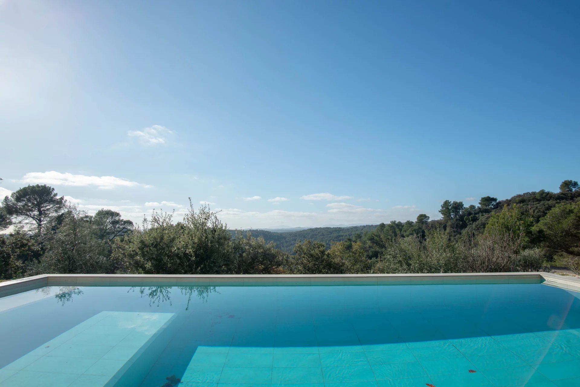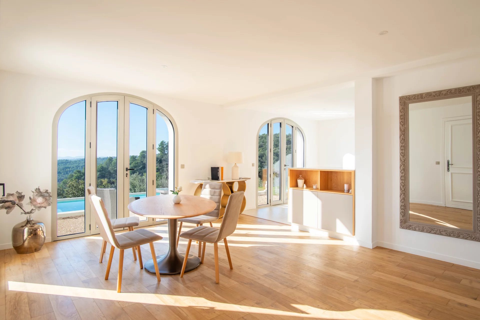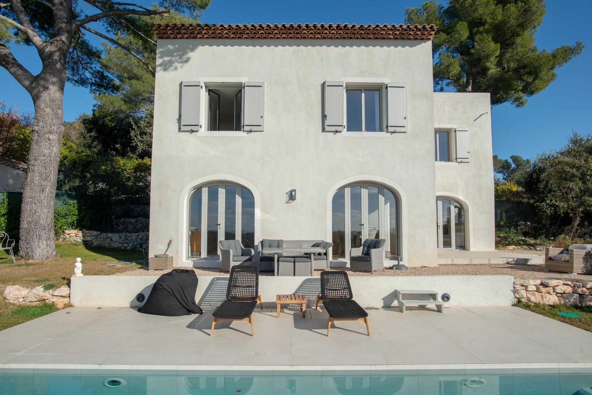 Sur la commune de Tourrettes-sur-Loup, en position dominante dans un quartier résidentiel calme, non loin du village, cette maison de 2021 bénéficie d'une vue panoramique sur les collines environnantes et l'horizon méditerranéen. Accompagnée d'une piscine, elle prend place sur un terrain de 1232m2.