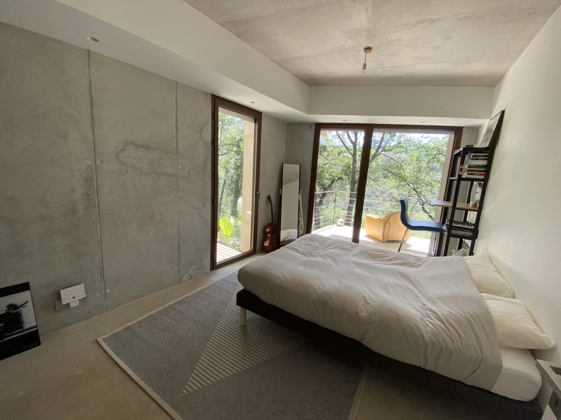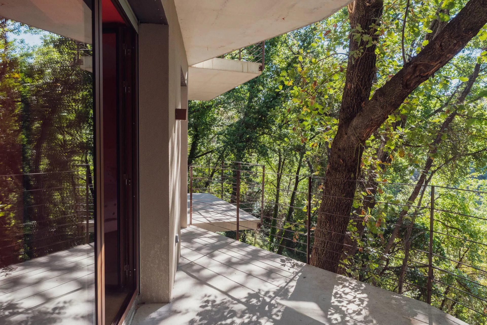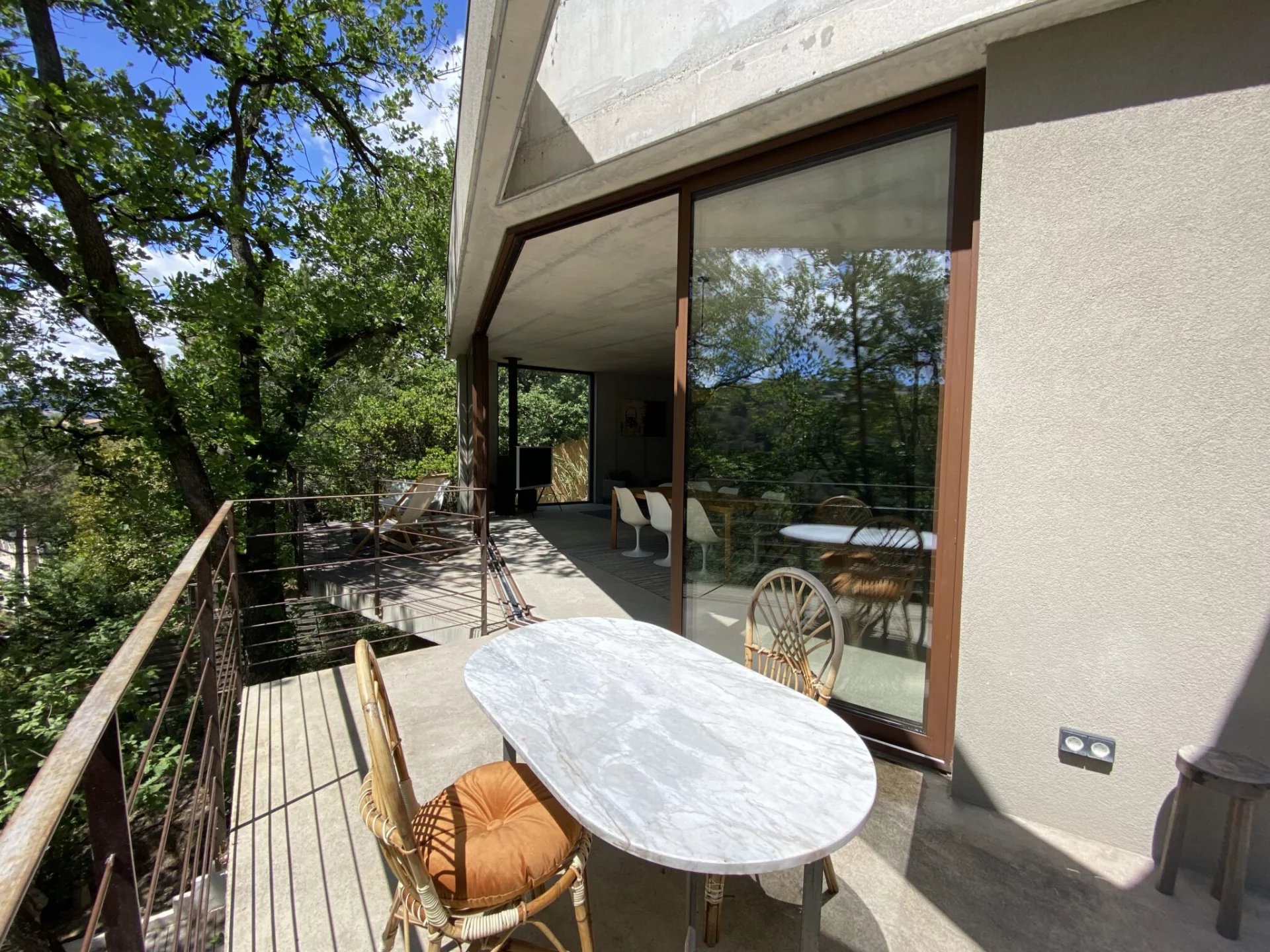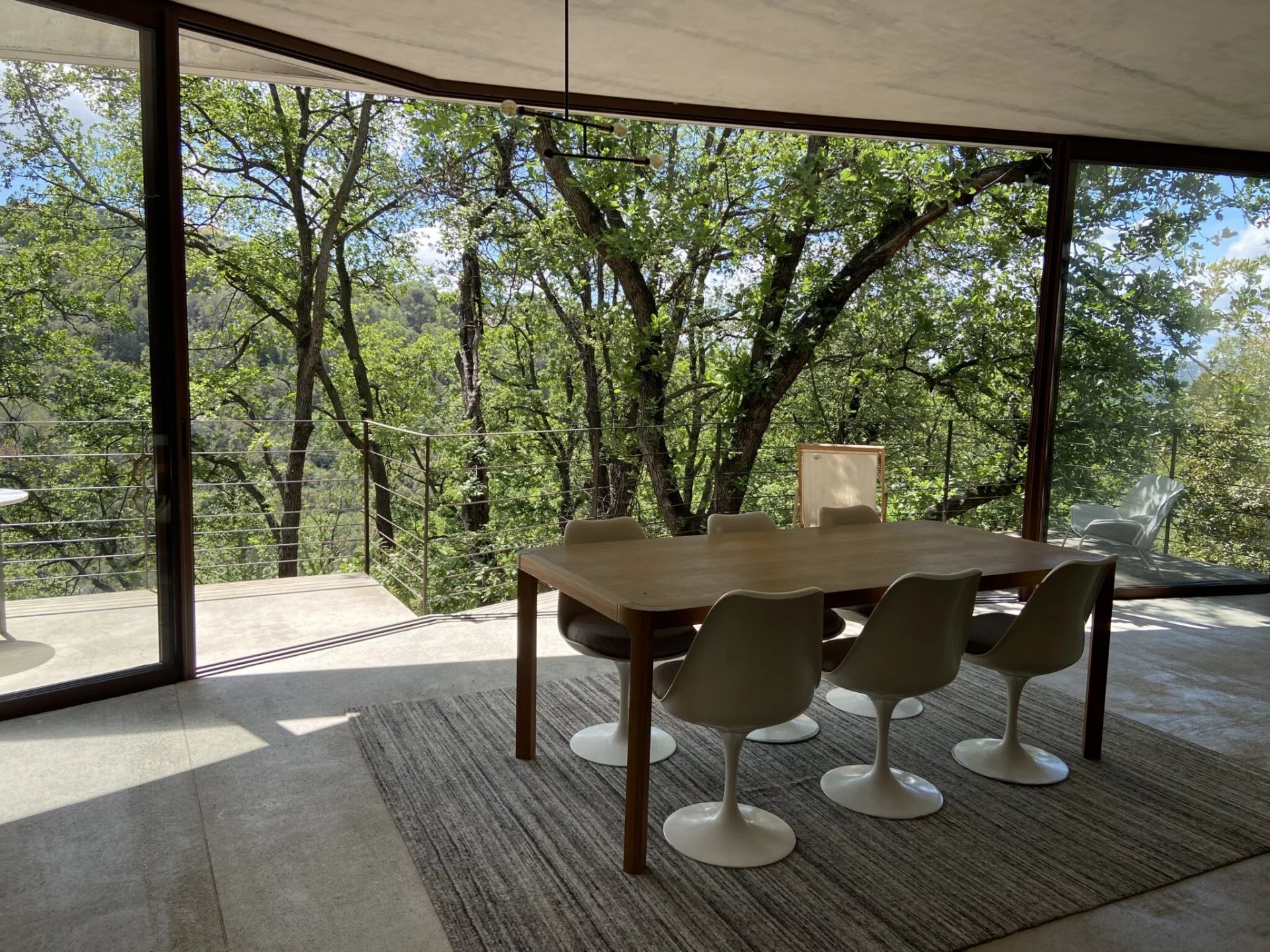 La maison de béton, de verre et d’acier, épousant parfaitement la nature environnante, est exposée au Sud. Elle se compose au premier niveau d’une pièce de vie de 75 m² avec une cuisine équipée, le tout ouvert sur deux terrasses, et un wc invités ; au niveau inférieur, trois chambres, dont une suite parentale avec dressing et salle de douche, une salle de bains avec toilettes complètent le niveau. Toutes les chambres s'ouvrent par de larges baies vitrées vers des terrasses et la nature. La parcelle est Piscinable
