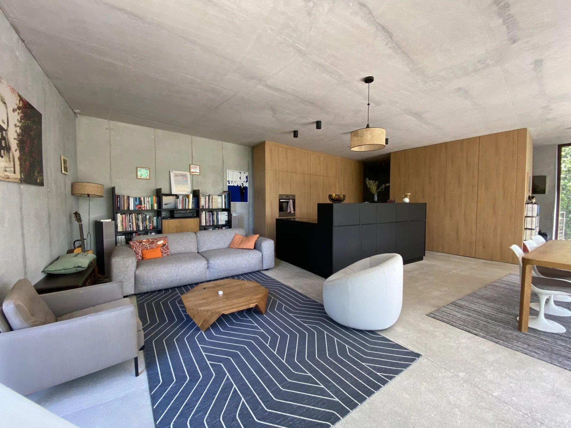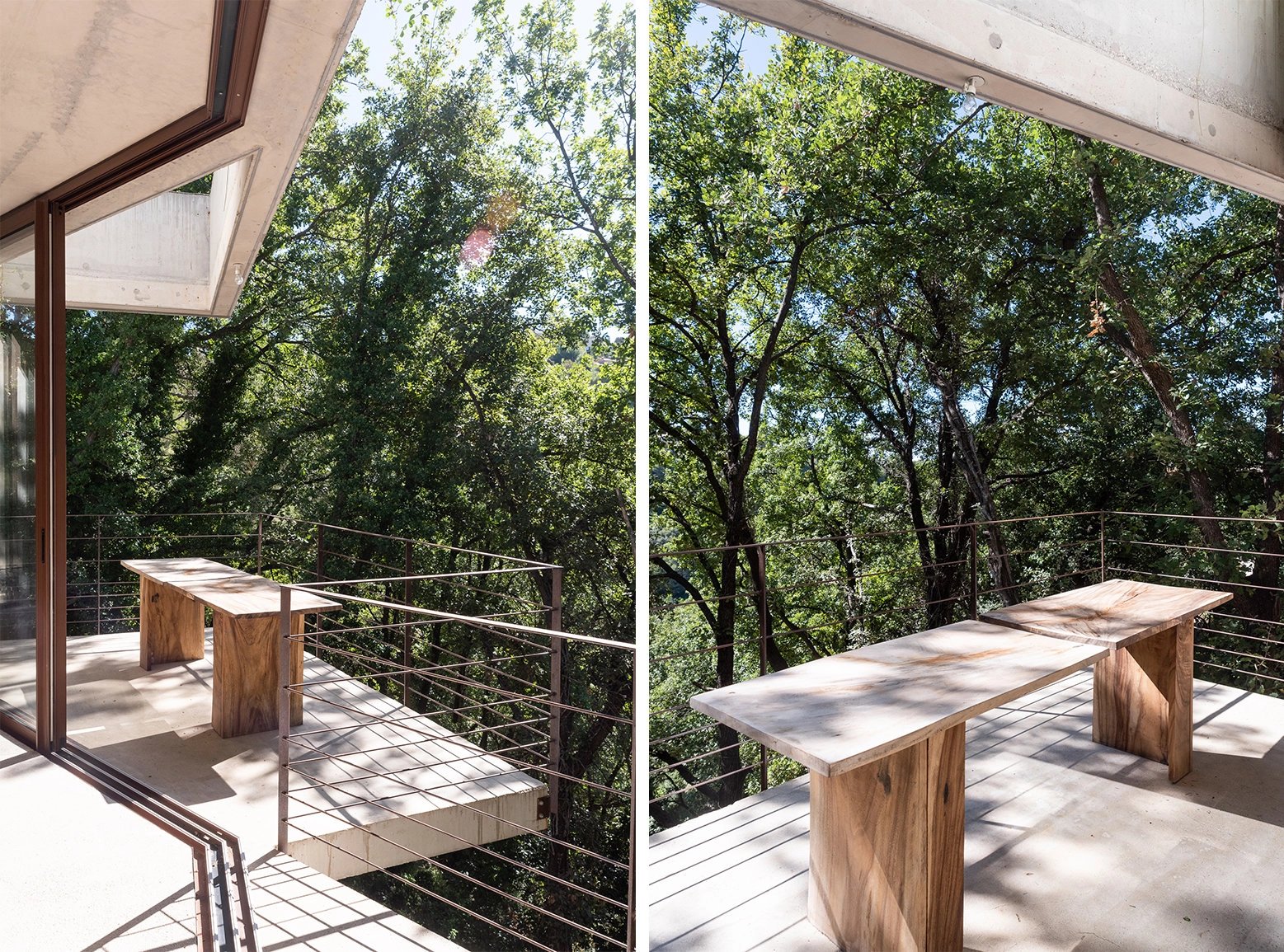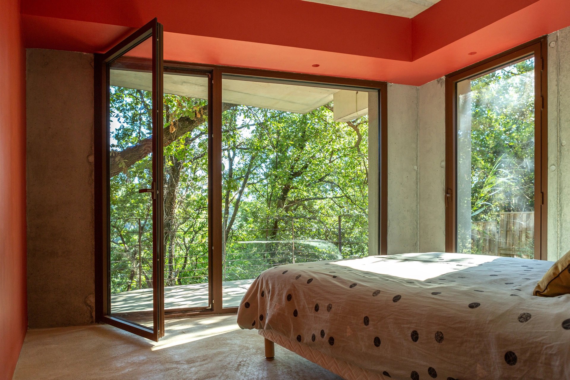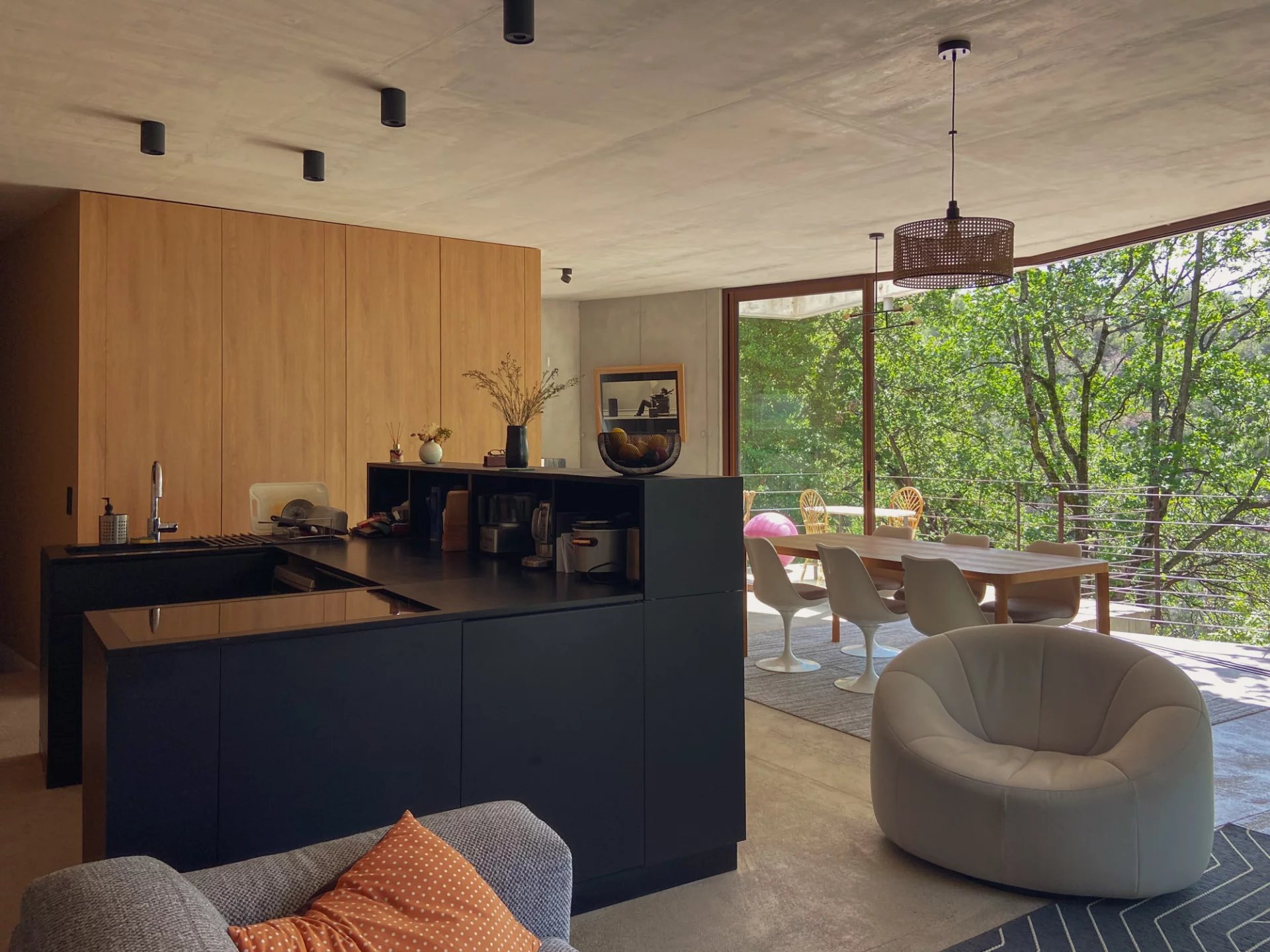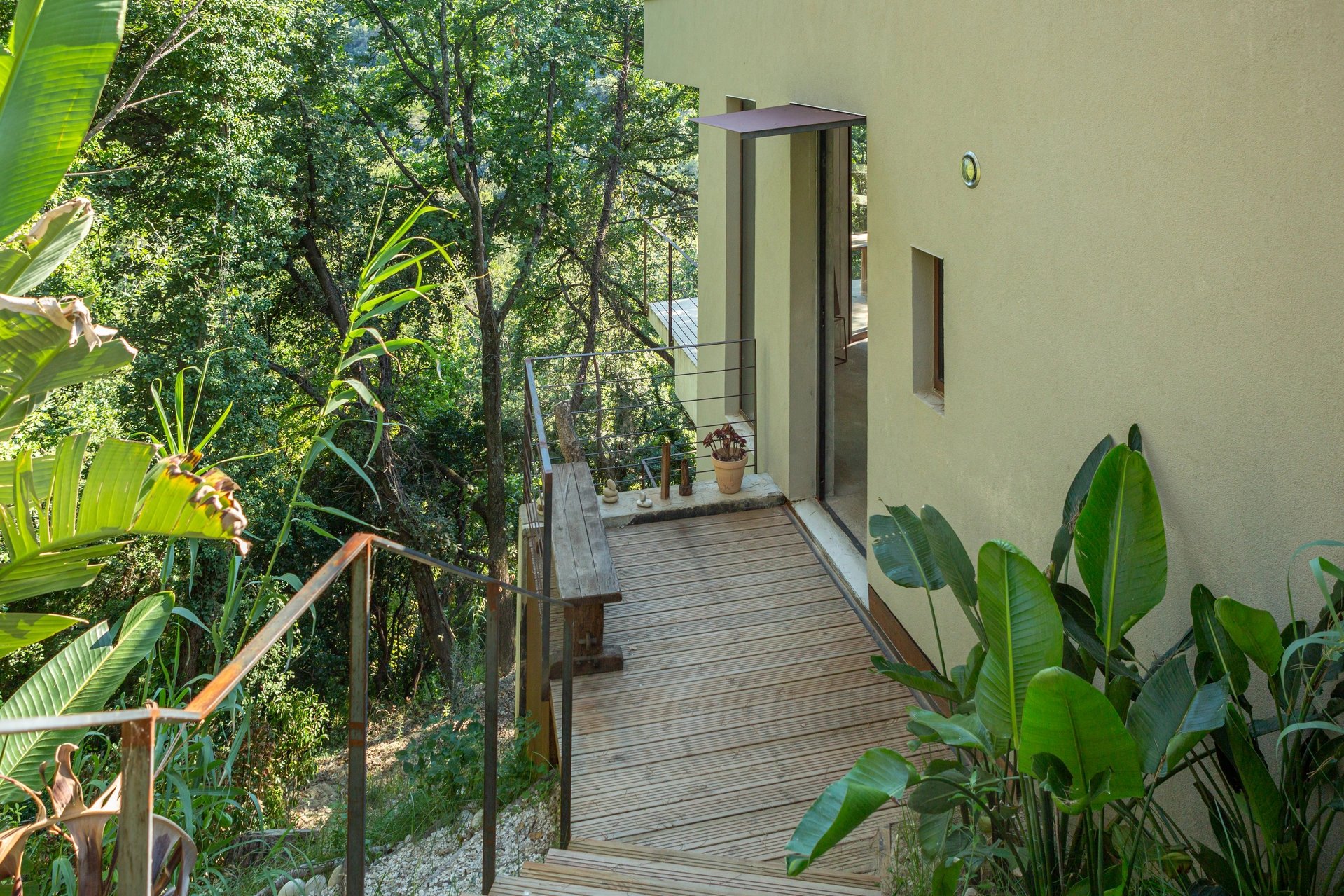 La maison de béton, de verre et d’acier, épousant parfaitement la nature environnante, est exposée au Sud. Elle se compose au premier niveau d’une pièce de vie de 75 m² avec une cuisine équipée, le tout ouvert sur deux terrasses, et un wc invités ; au niveau inférieur, trois chambres, dont une suite parentale avec dressing et salle de douche, une salle de bains avec toilettes complètent le niveau. Toutes les chambres s'ouvrent par de larges baies vitrées vers des terrasses et la nature. La parcelle est Piscinable