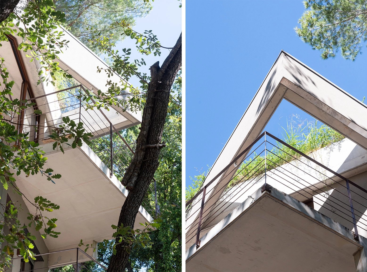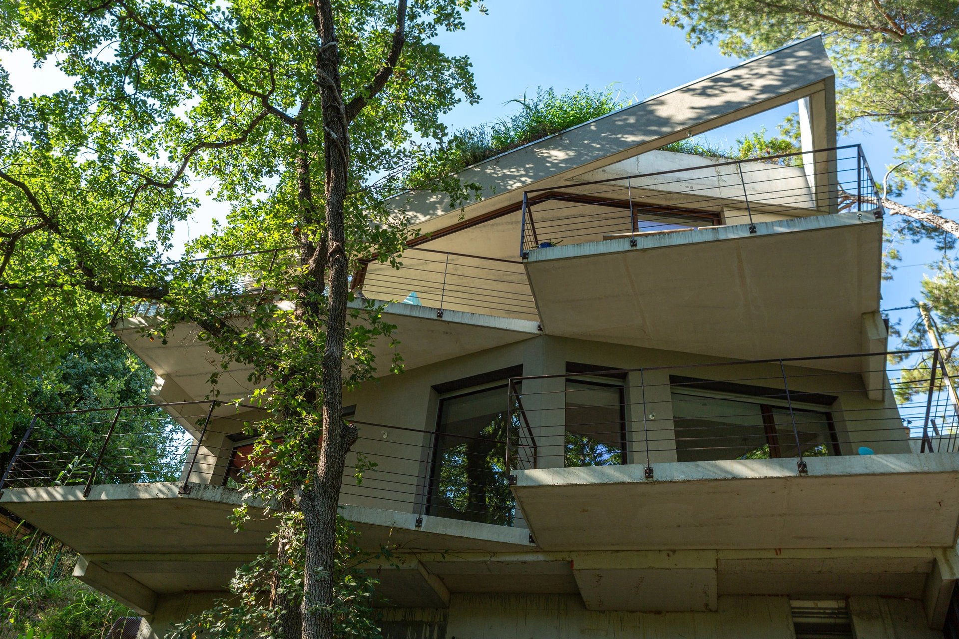 Une jolie réalisation aux formes géométriques et anguleuses accrochée aux arbres, en parfaite symbiose avec la nature. Une architecture intégrée d’inspiration brutaliste sur les collines Niçoises, à seulement une volée de feuille de la capitale azuréenne.