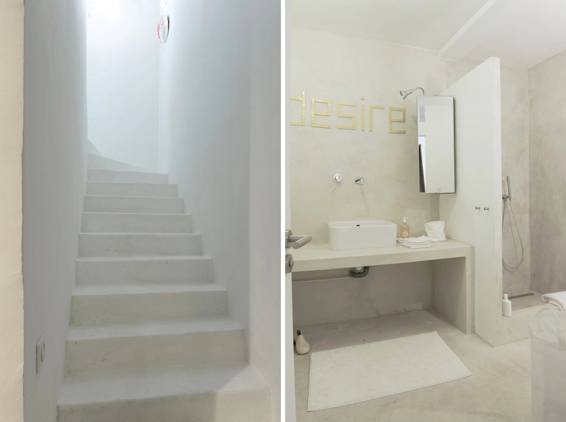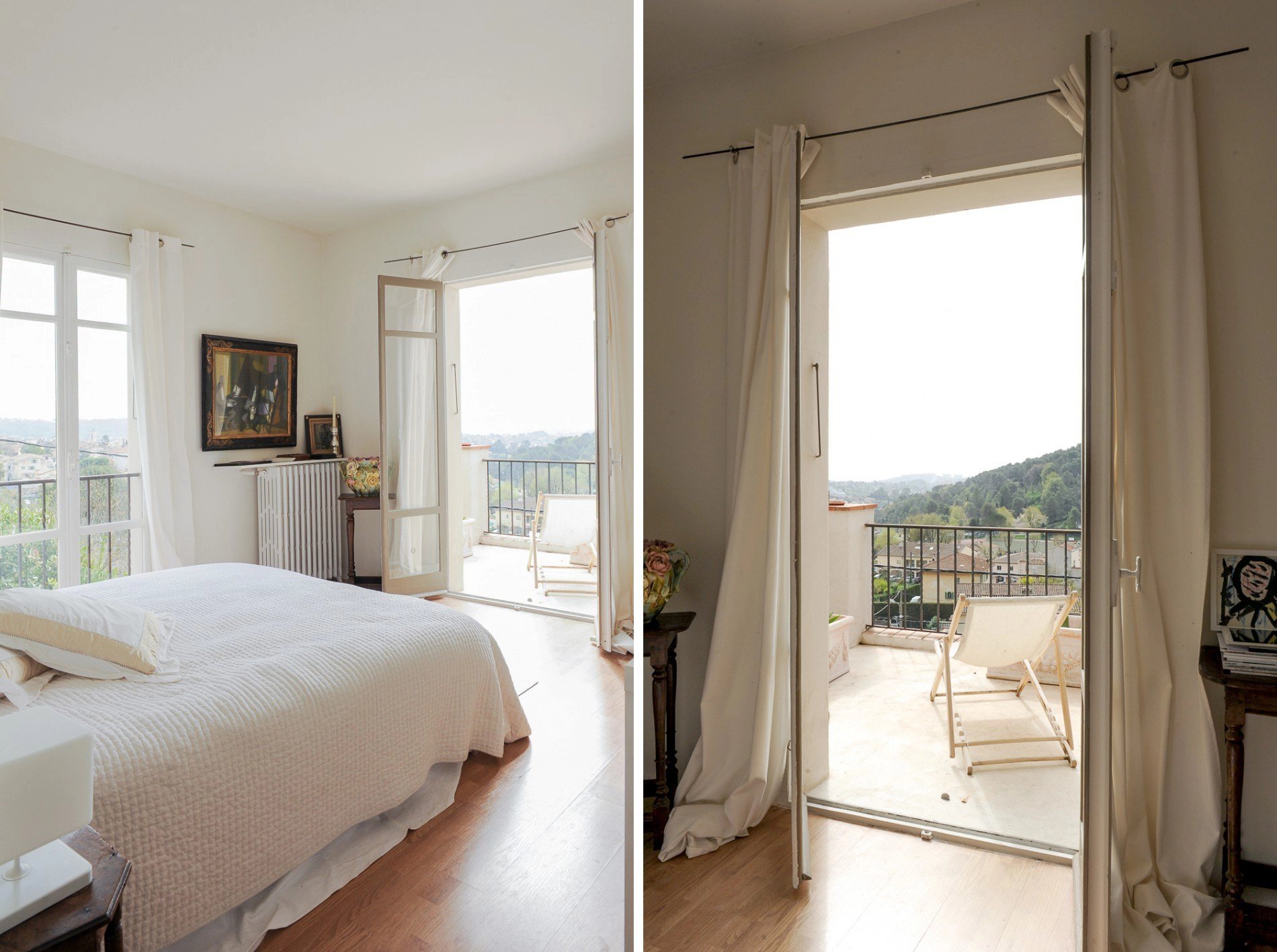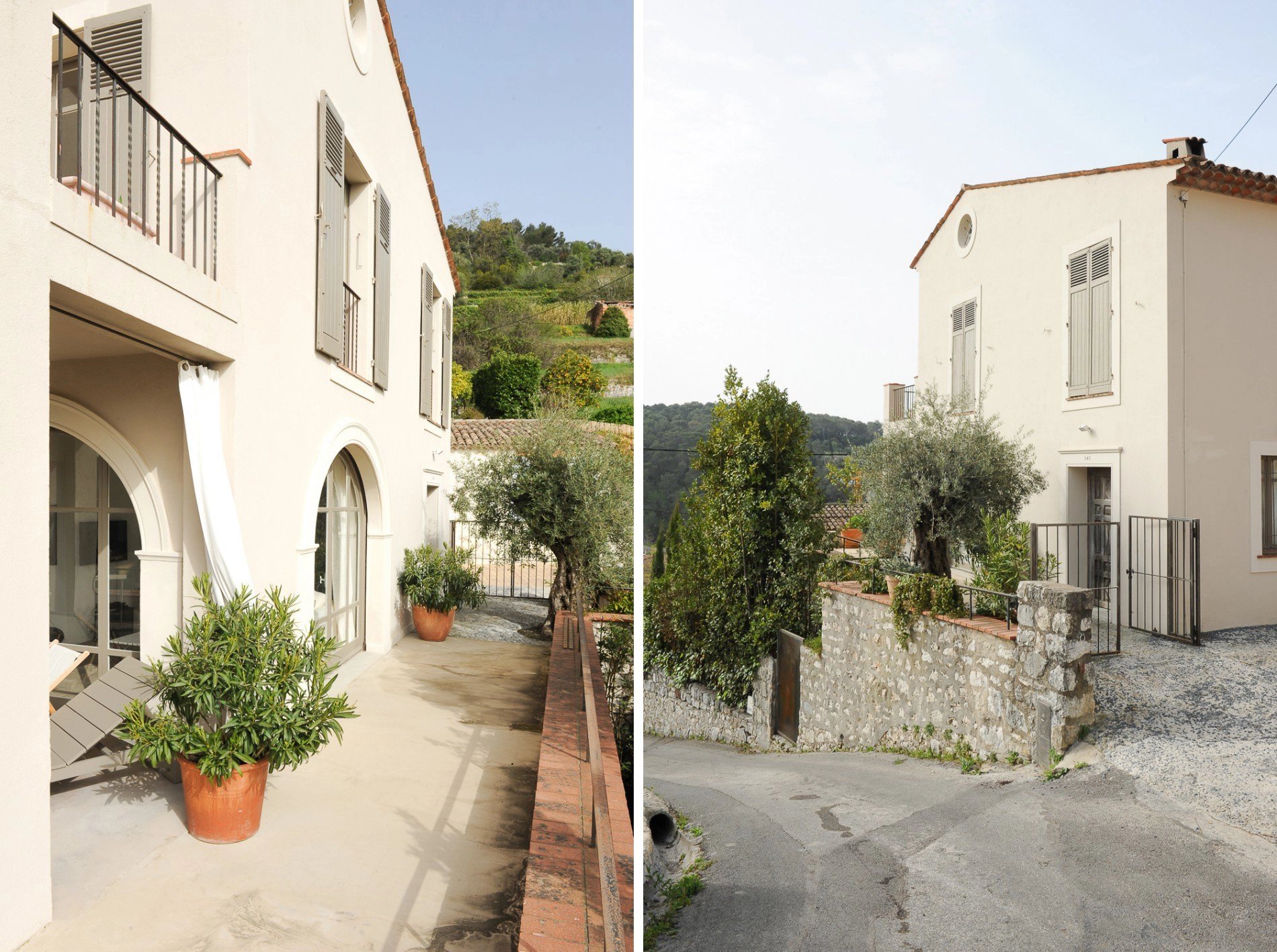 Le niveau supérieur dessert l’espace nuit, composé de deux belles chambres avec dressing donnant sur une terrasse au sud, une chambre à l’Est, ainsi qu’une superbe salle de bain en béton lissé et plâtre. La vue y est délectable avec au loin la mer et à l’Est le vieux village perché de Saint-Paul de Vence.