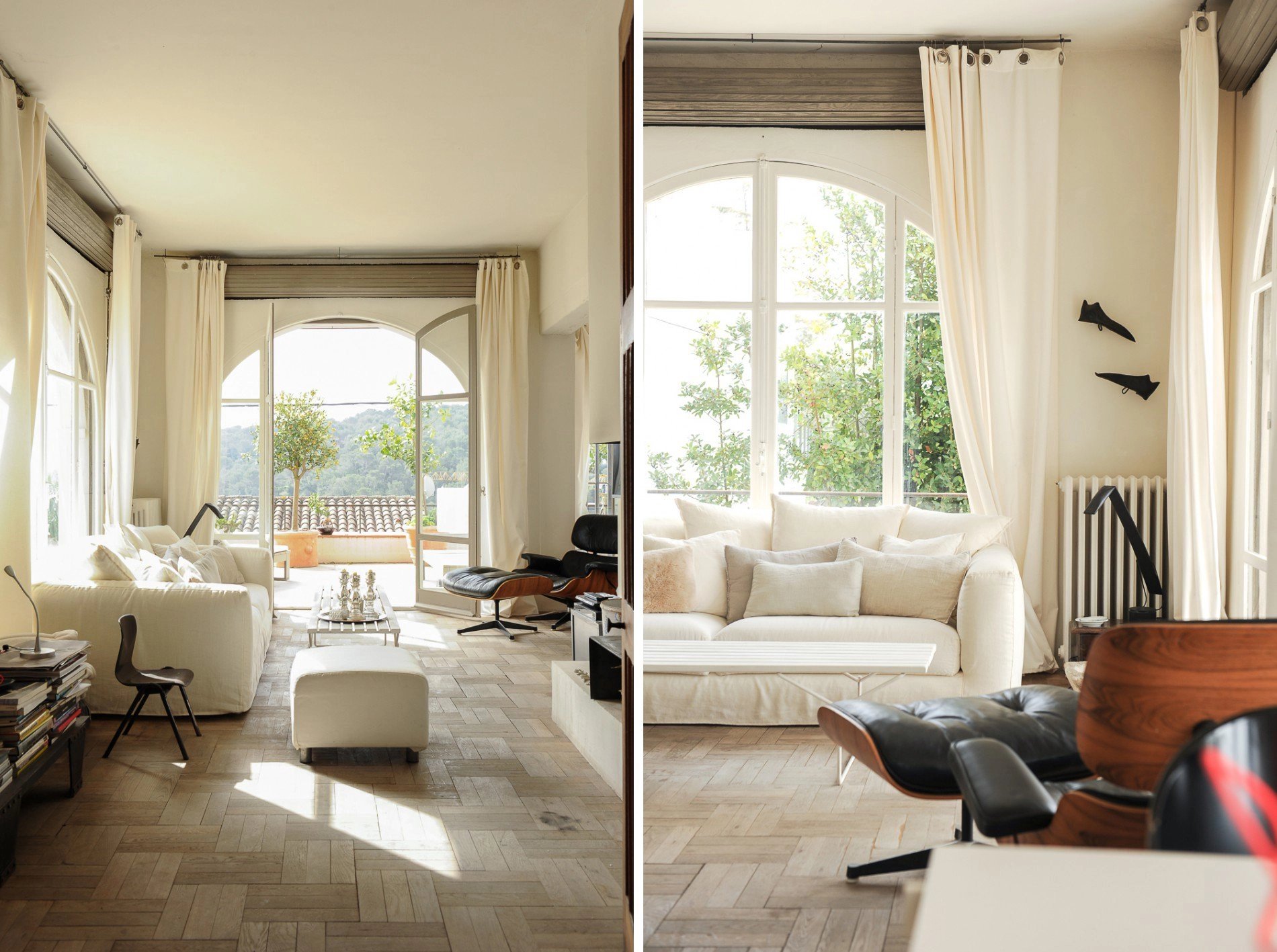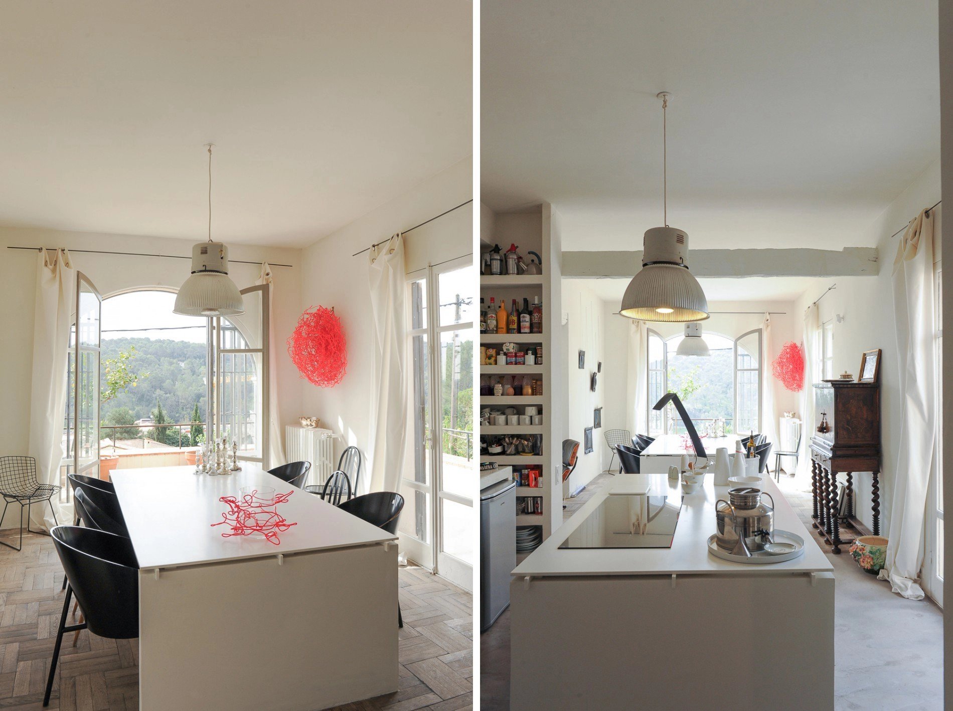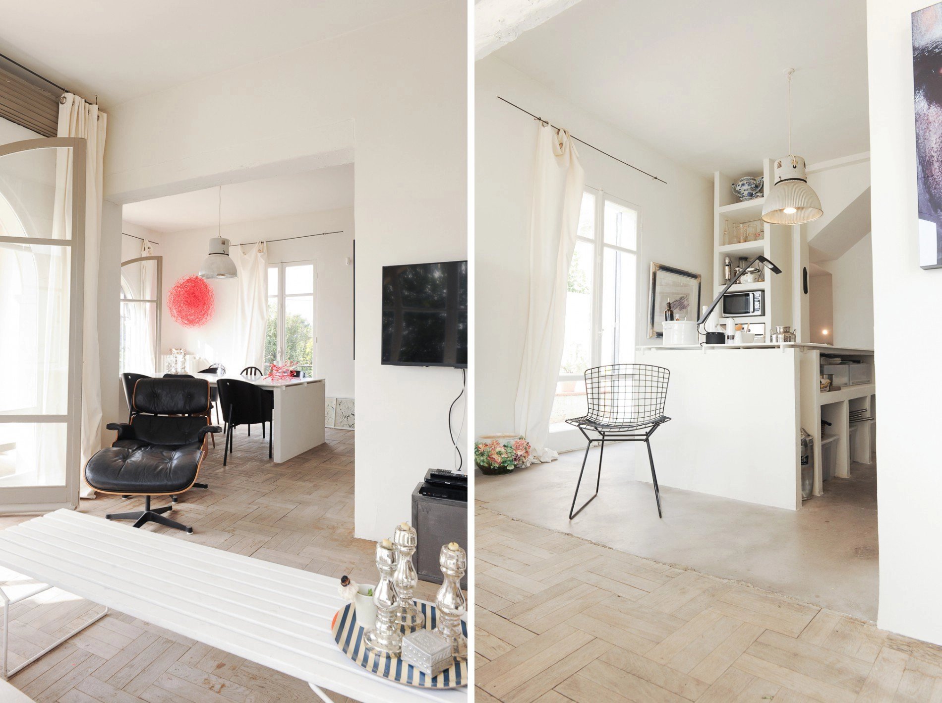 Les nuances de blancs sur les murs, la table de salon et l’îlot central en Corian, le sol en béton ciré de la cuisine et le marbre du Hall et de l’escalier, apportent fraîcheur et lumière. La chaleur est amenée par les larges ouvertures sur l’extérieur et le magnifique parquet brut en vannerie recouvrant le sol du salon et de la salle à manger.