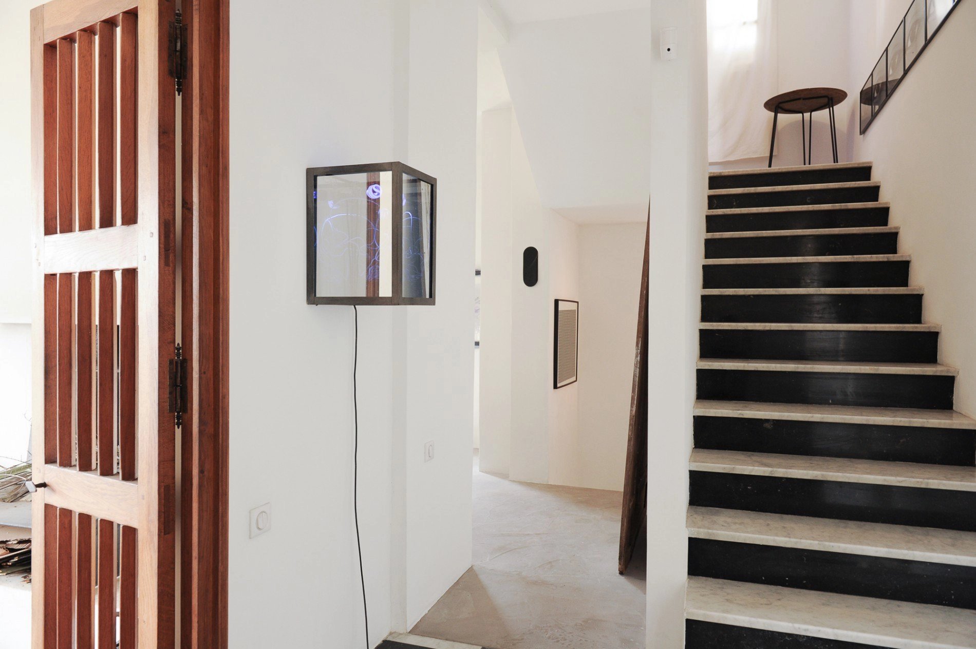 La visite débute par le niveau intermédiaire après avoir poussé la porte d’entrée en bois patiné, vous découvrirez l’âme de la belle. Le hall vous accueille par un vieux marbre à damier vestige de son passé, qui se prolonge sur votre gauche par l’espace salon avec cheminée, s’ouvrant en profondeur sur une vaste terrasse ensoleillé et en latéral sur votre droite par la salle à manger avec sa cuisine minimaliste sur-mesure ouverte sur le séjour.