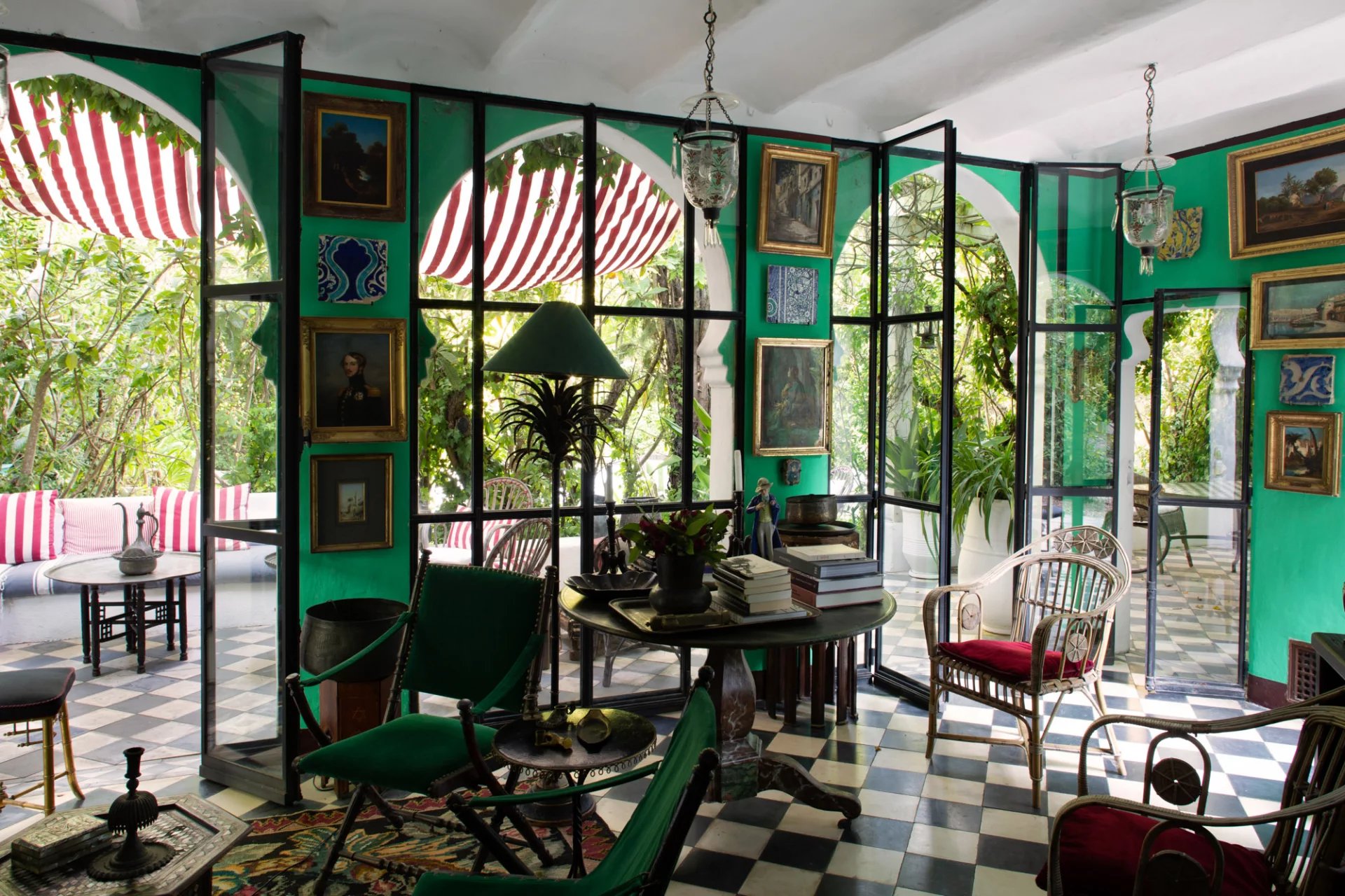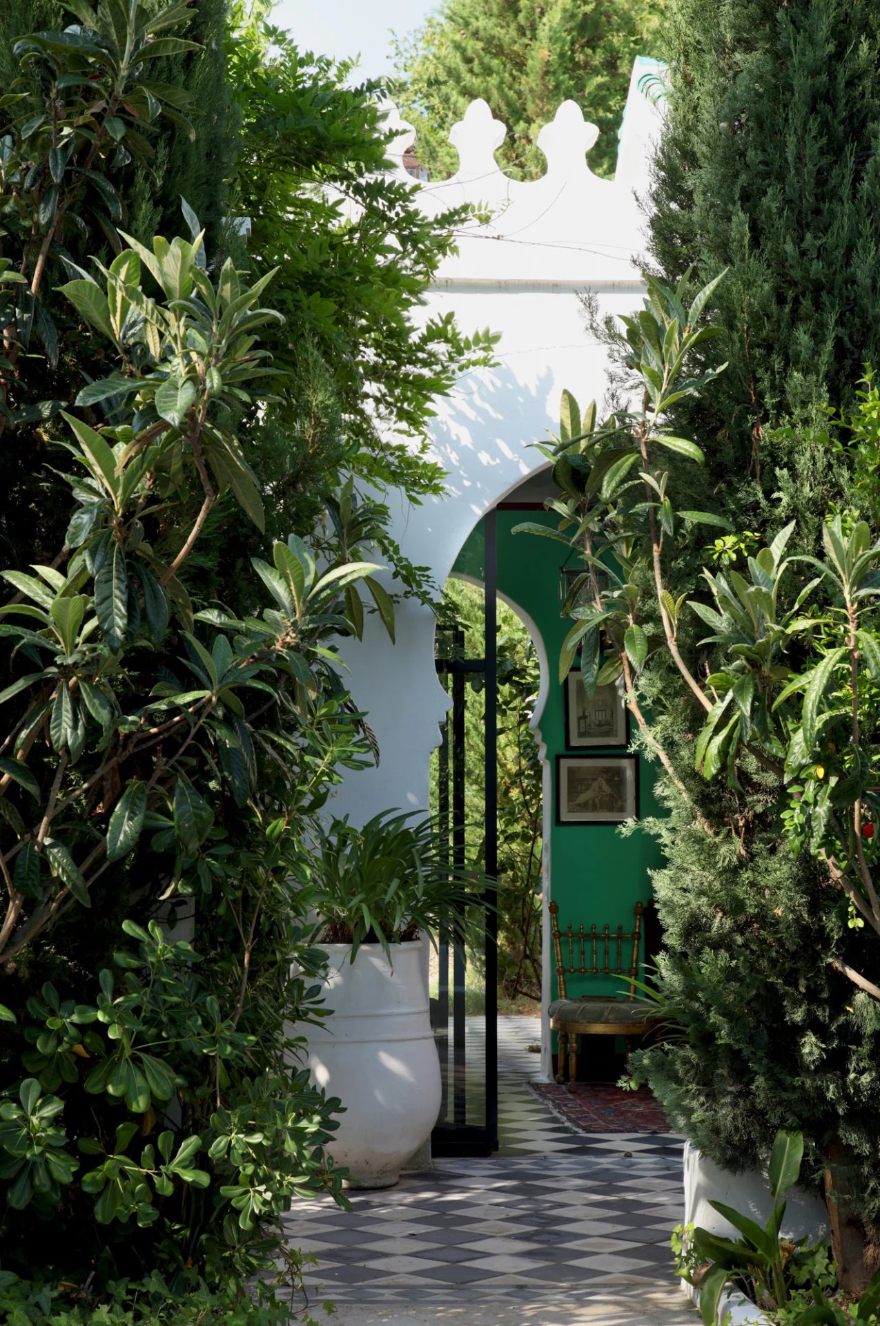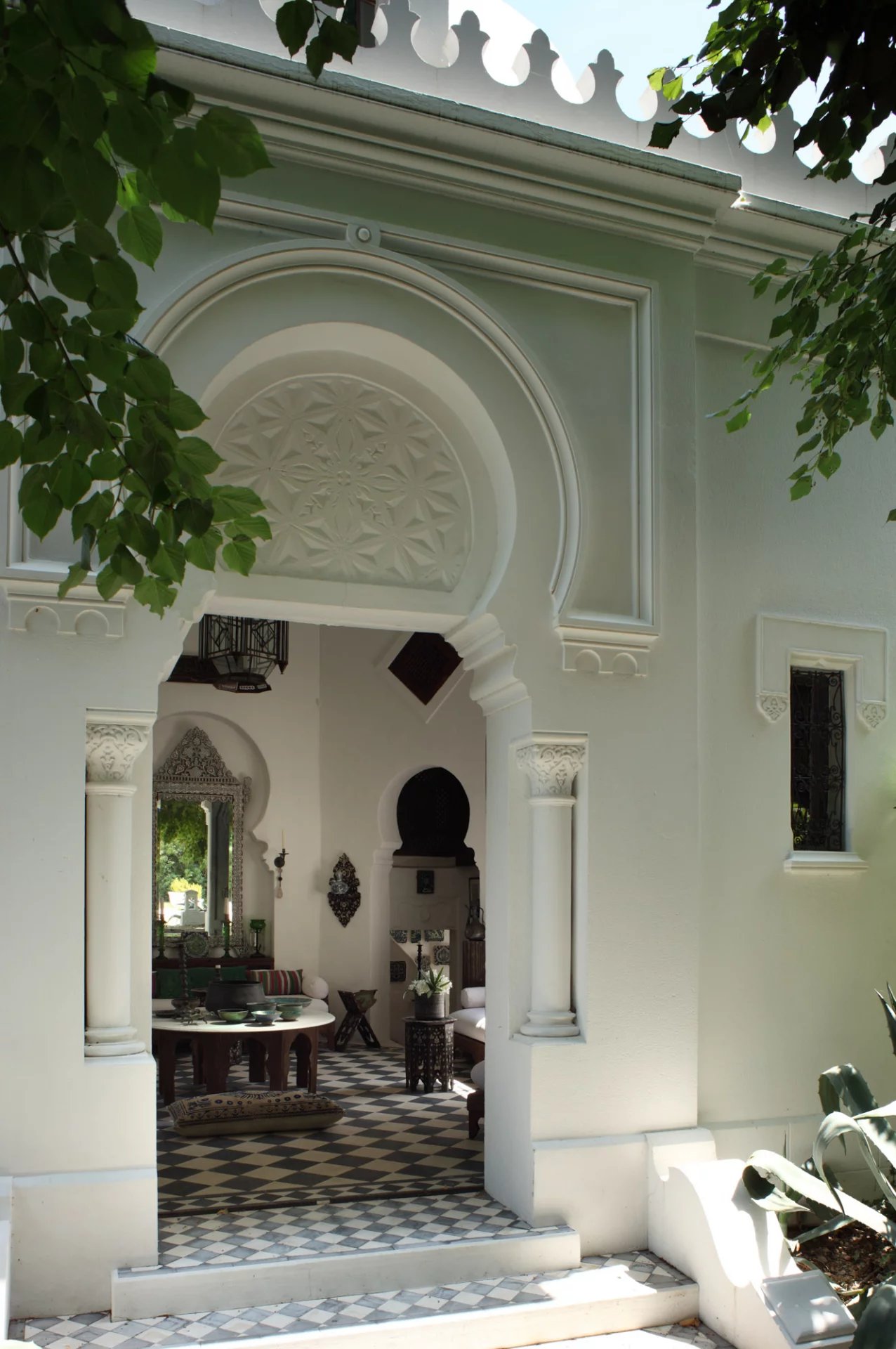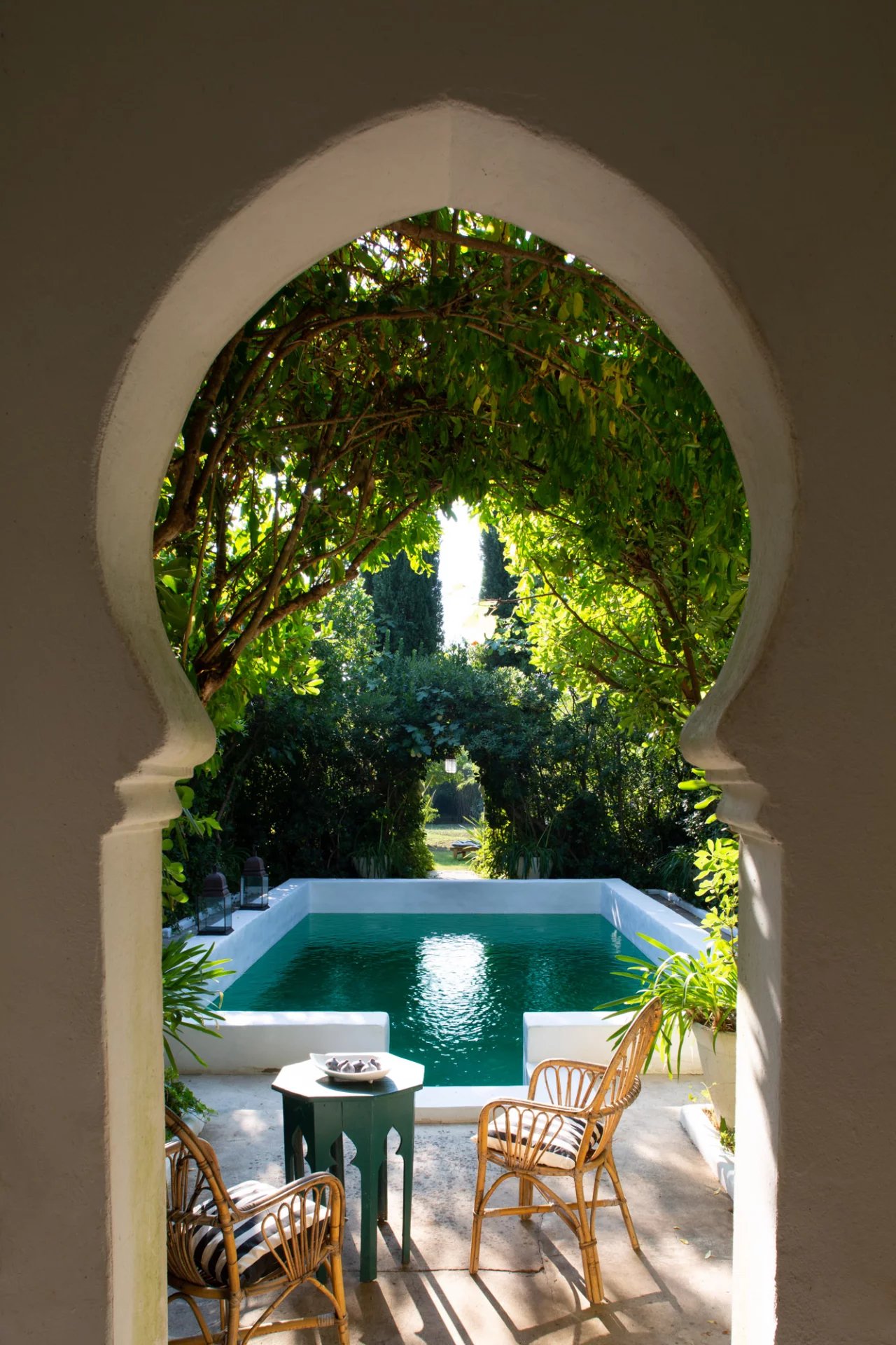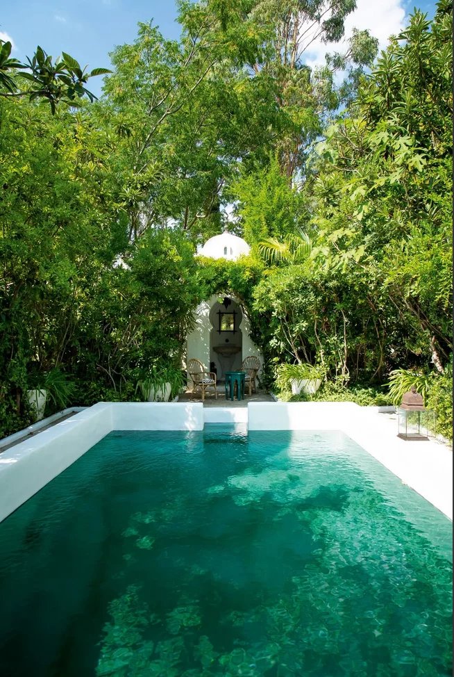 La nature luxuriante fusionne avec le style orientaliste de cette petite folie. Entièrement planté par l’architecte il y a quelques années, la nature s’invite désormais partout ; L’eau vert émeraude de la piscine bordé d’un muret blanc évoque les bassins d’Afrique du Nord.