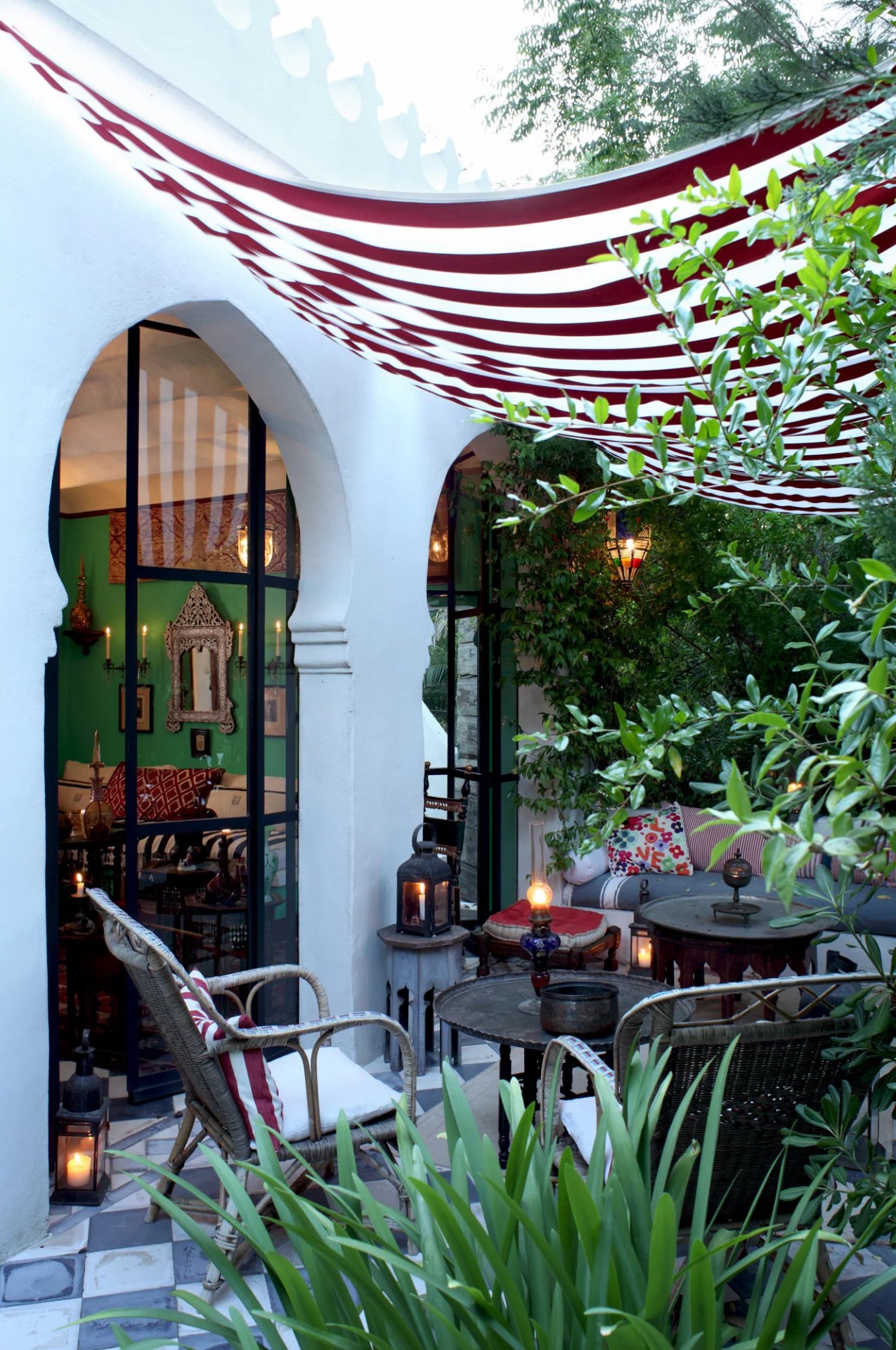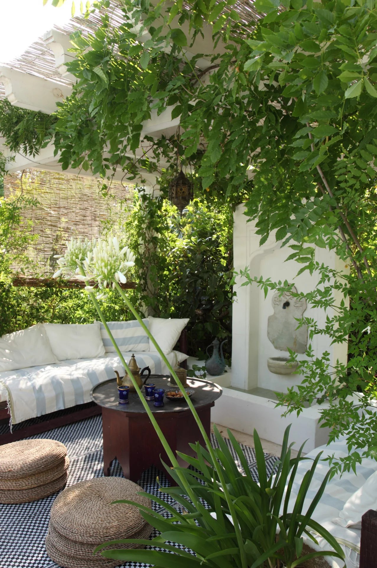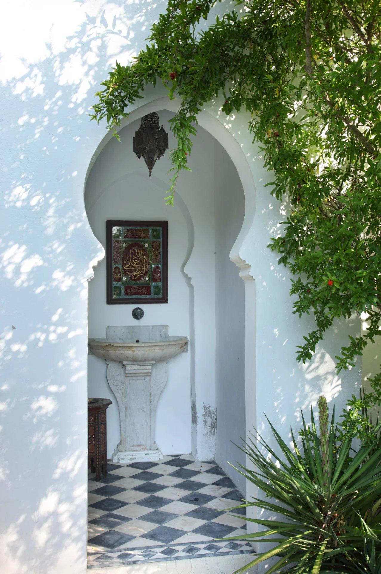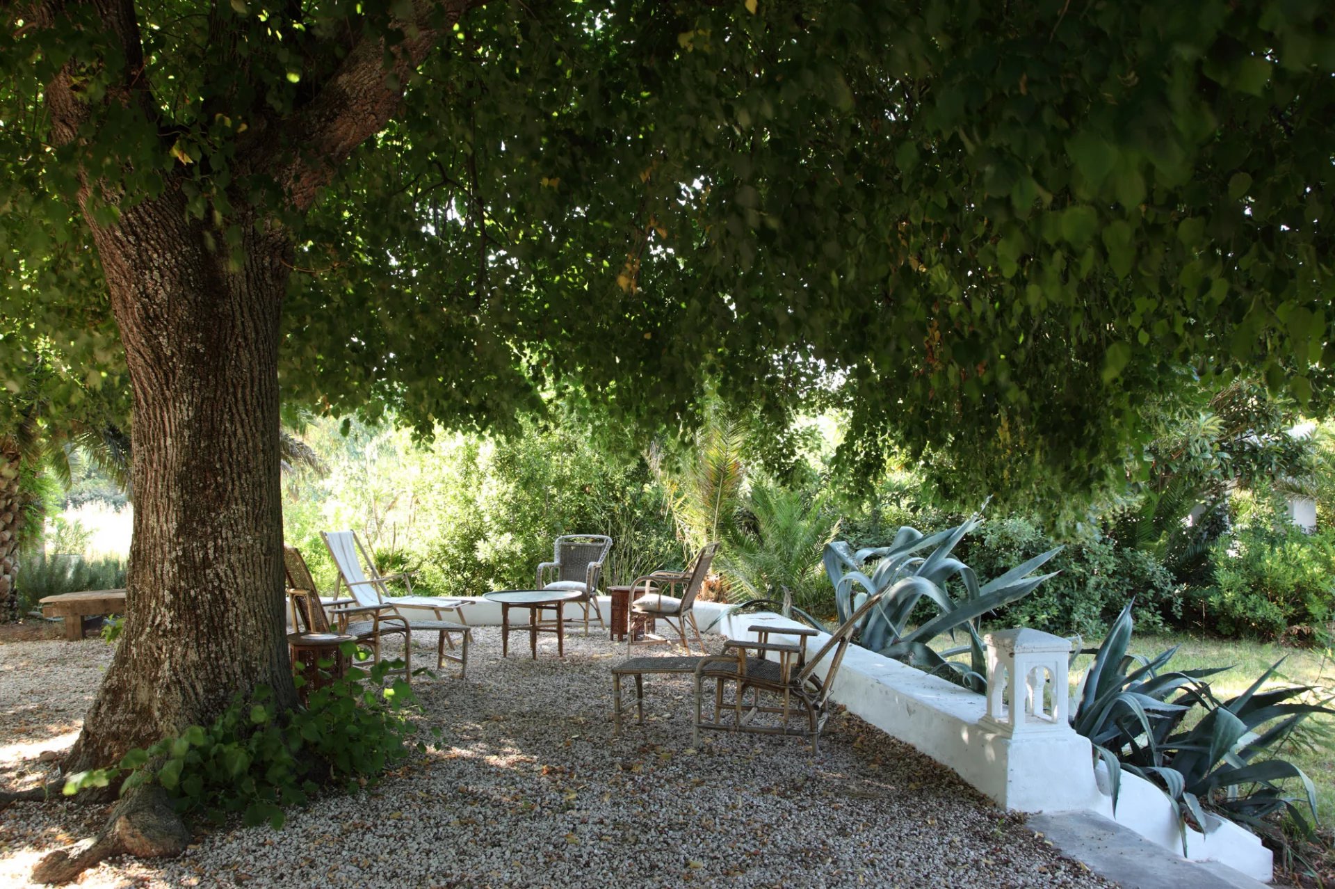 La nature luxuriante fusionne avec le style orientaliste de cette petite folie. Entièrement planté par l’architecte il y a quelques années, la nature s’invite désormais partout ; L’eau vert émeraude de la piscine bordé d’un muret blanc évoque les bassins d’Afrique du Nord.