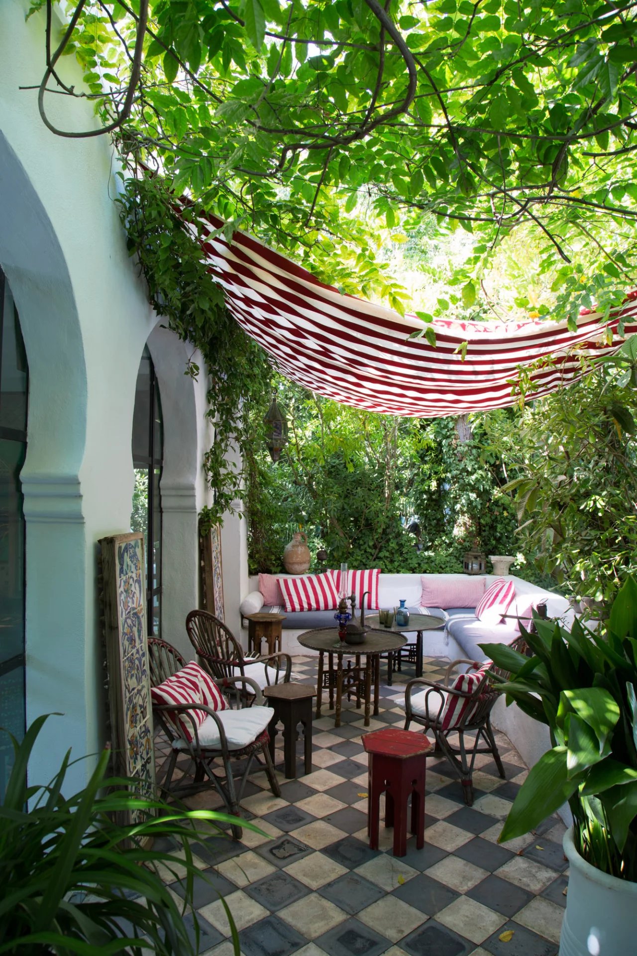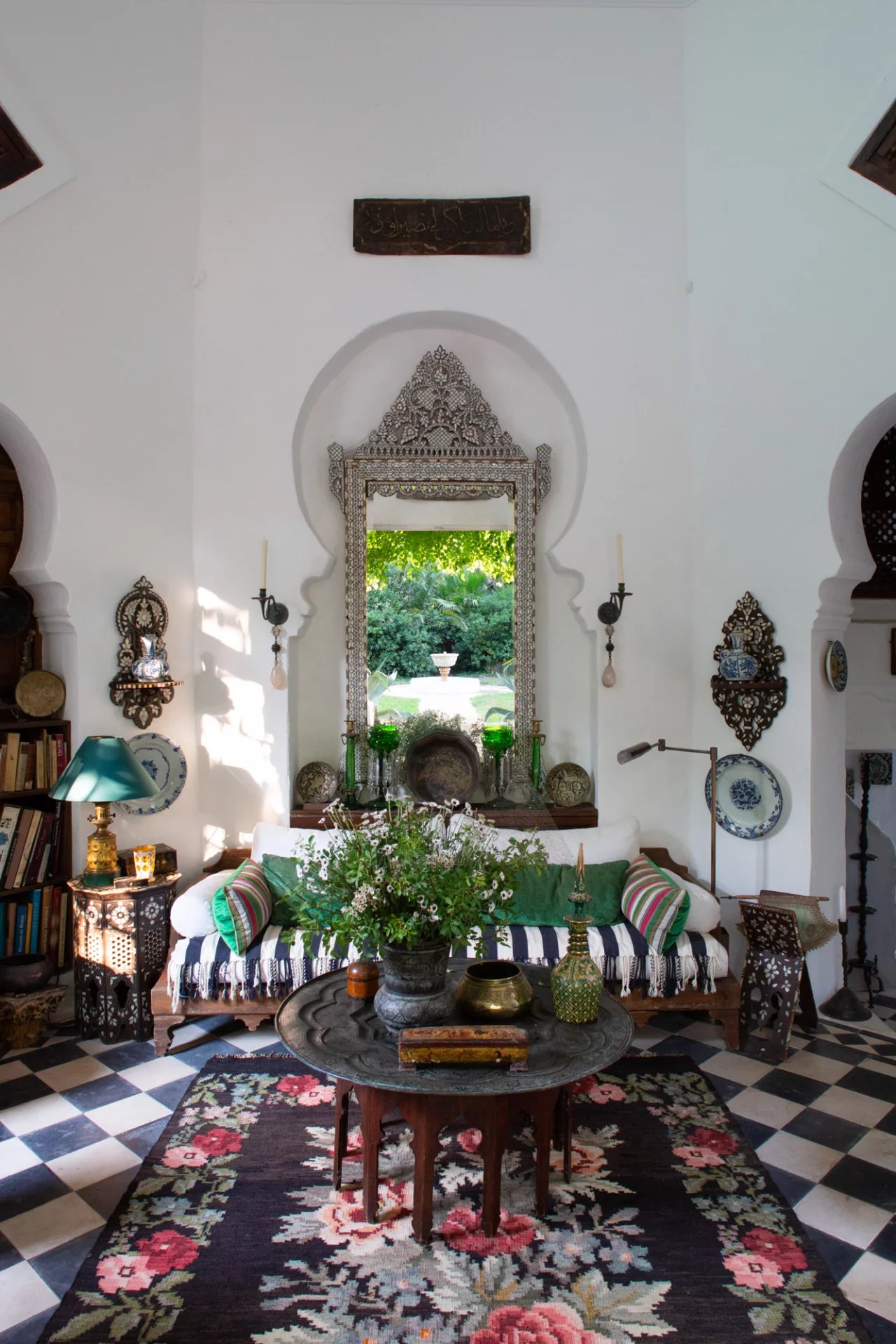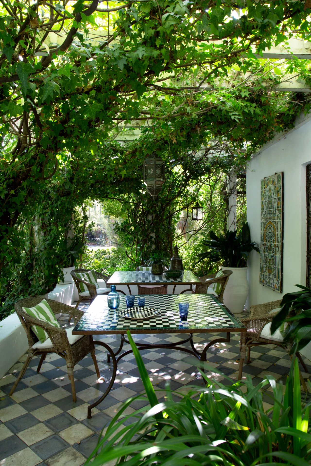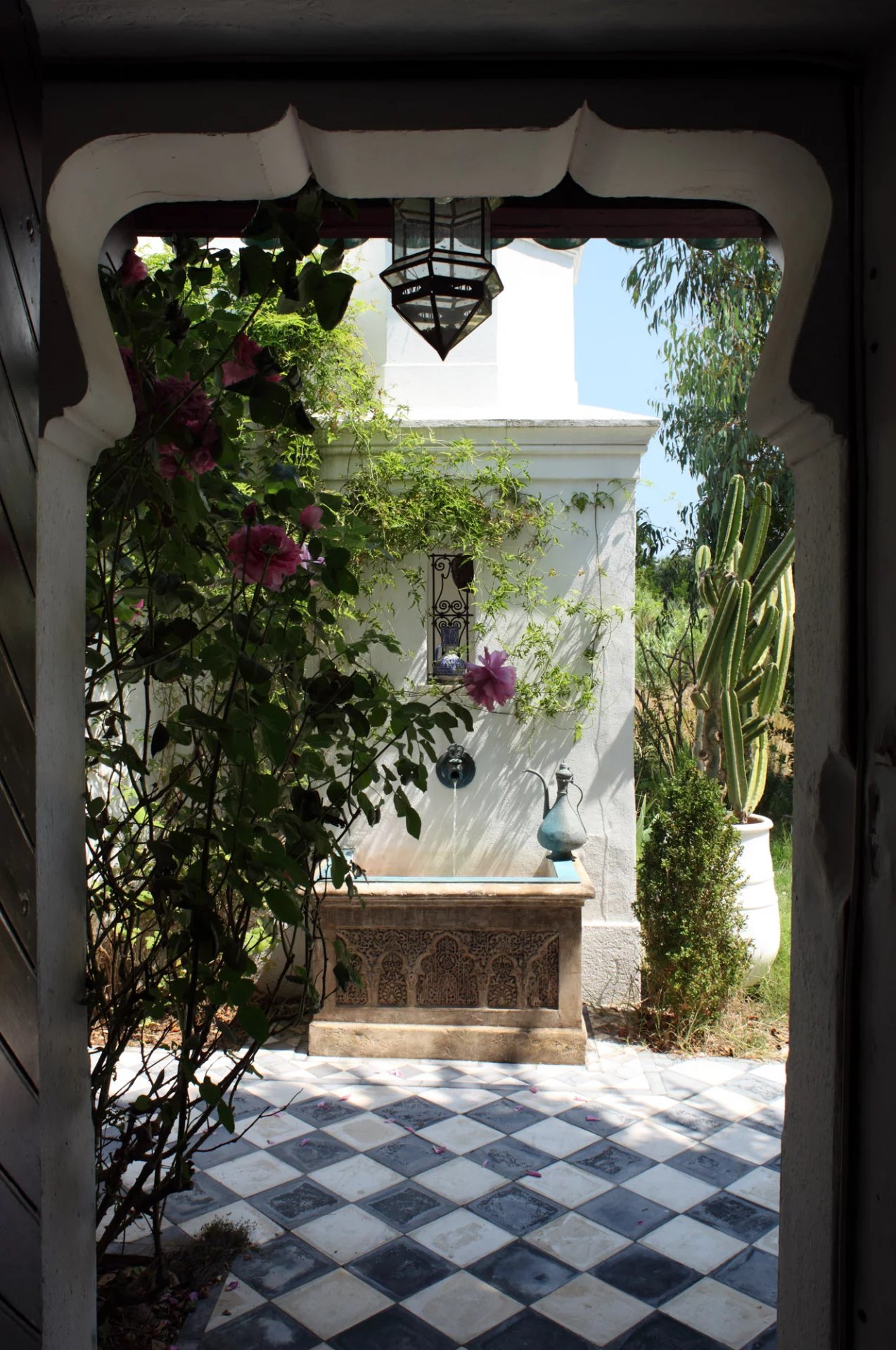 La nature luxuriante fusionne avec le style orientaliste de cette petite folie. Entièrement planté par l’architecte il y a quelques années, la nature s’invite désormais partout ; L’eau vert émeraude de la piscine bordé d’un muret blanc évoque les bassins d’Afrique du Nord.