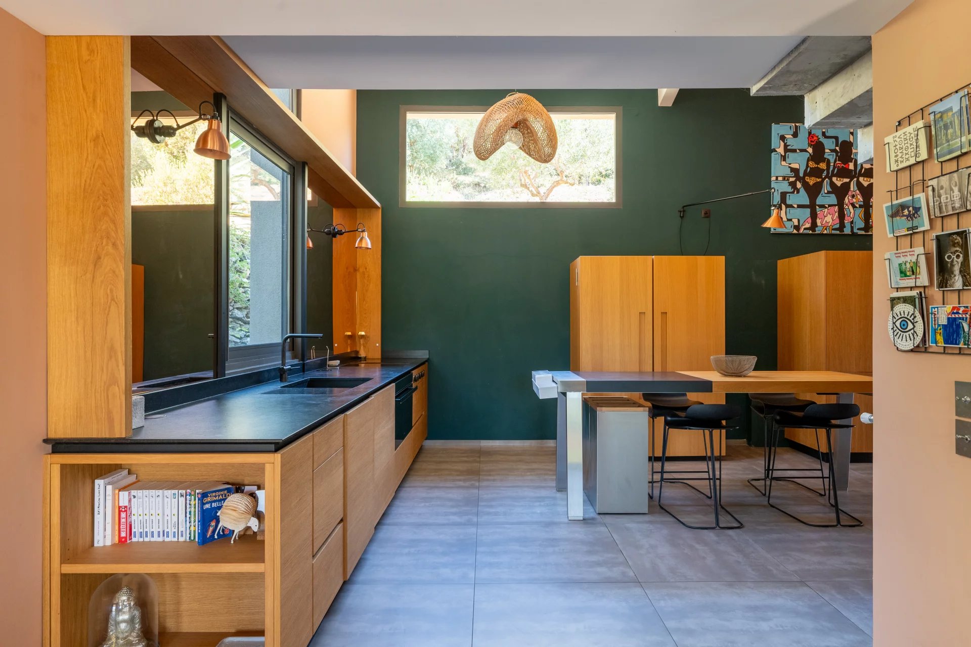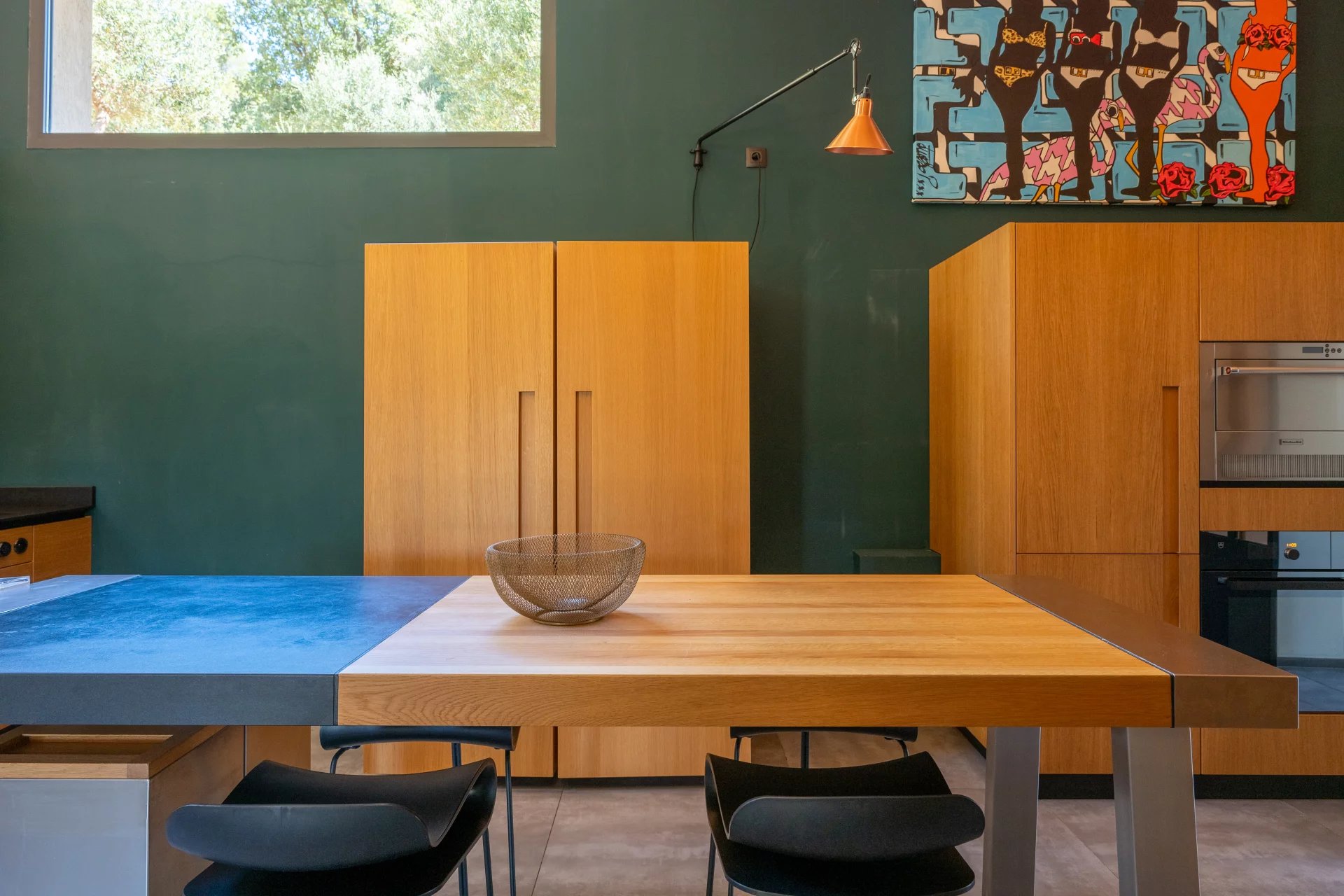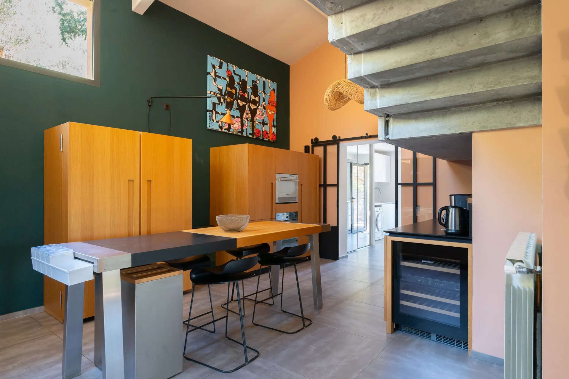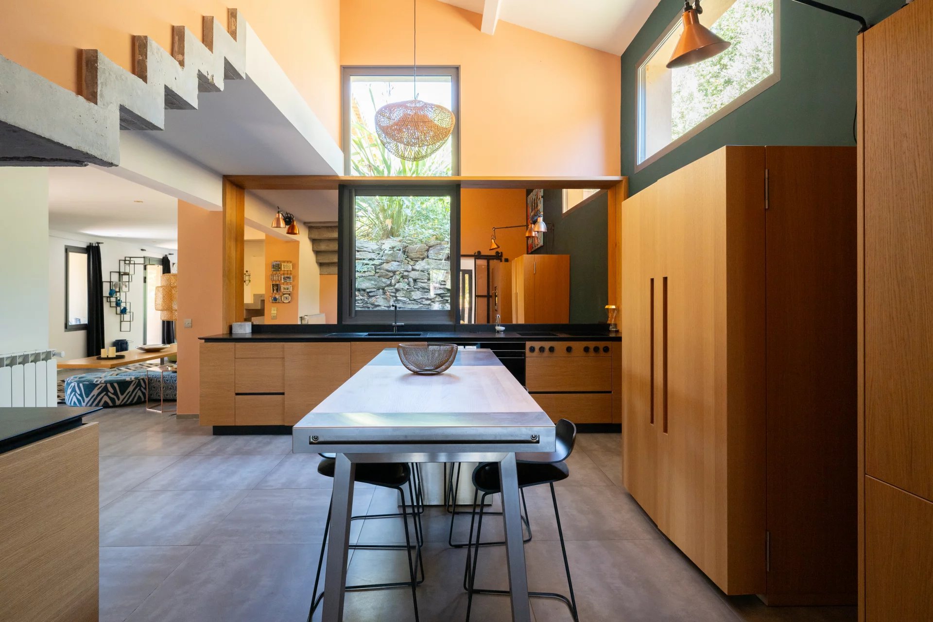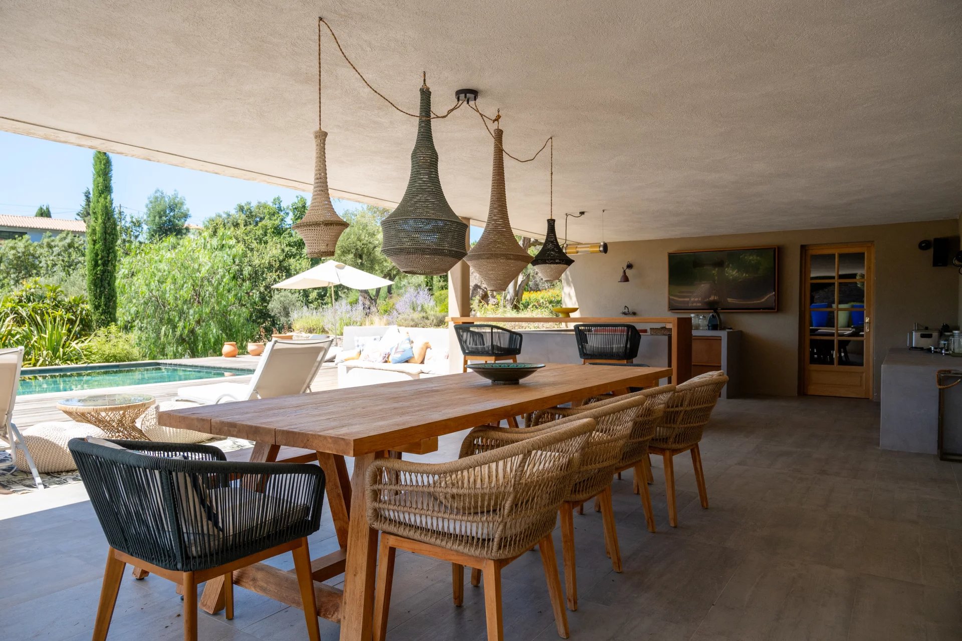 Le rez de chaussée dispose d'un grand salon avec cheminée s'ouvrant au sud sur une terrasse ombragée, la cuisine Bulthaup semi ouverte sur le salon profite d'une large ouverture sur le jardin et d'un accès sur un espace buanderie avec entrée de service.