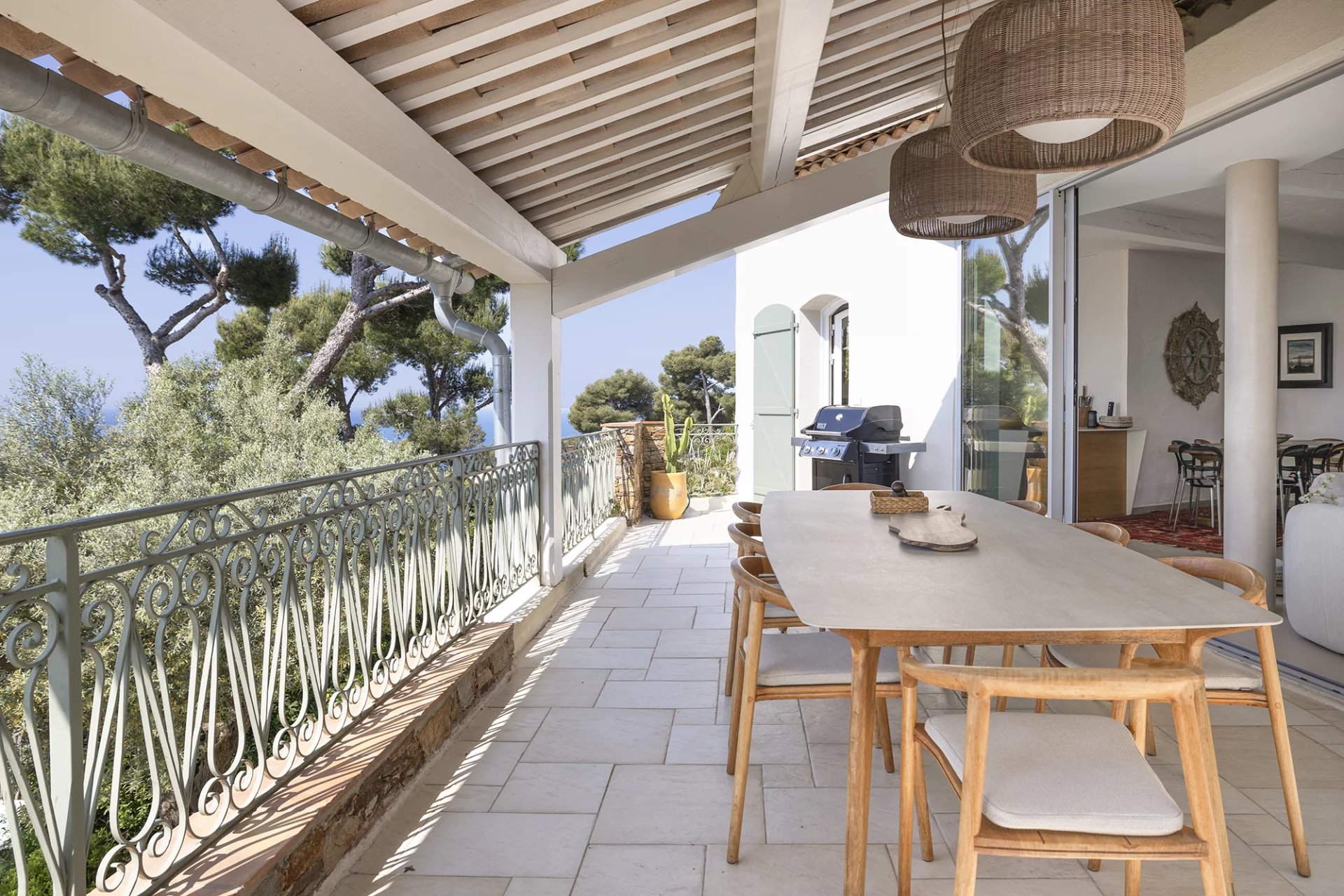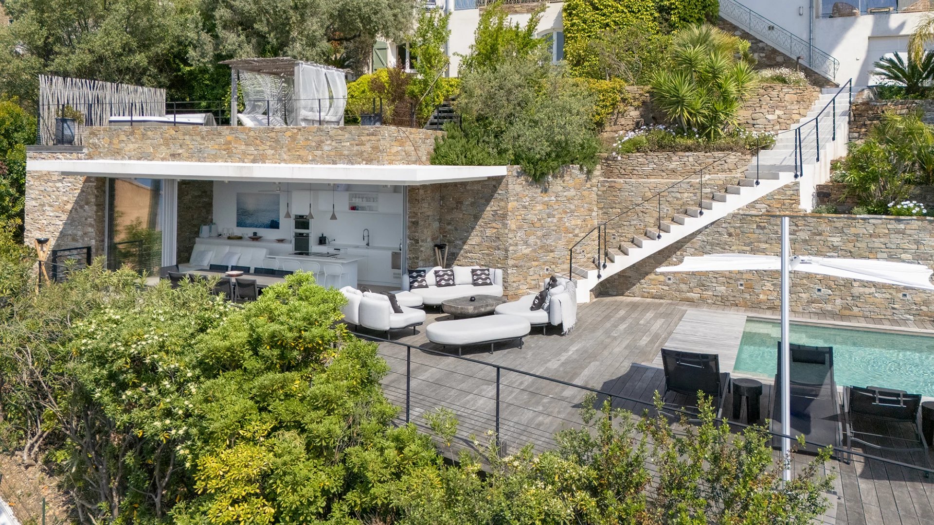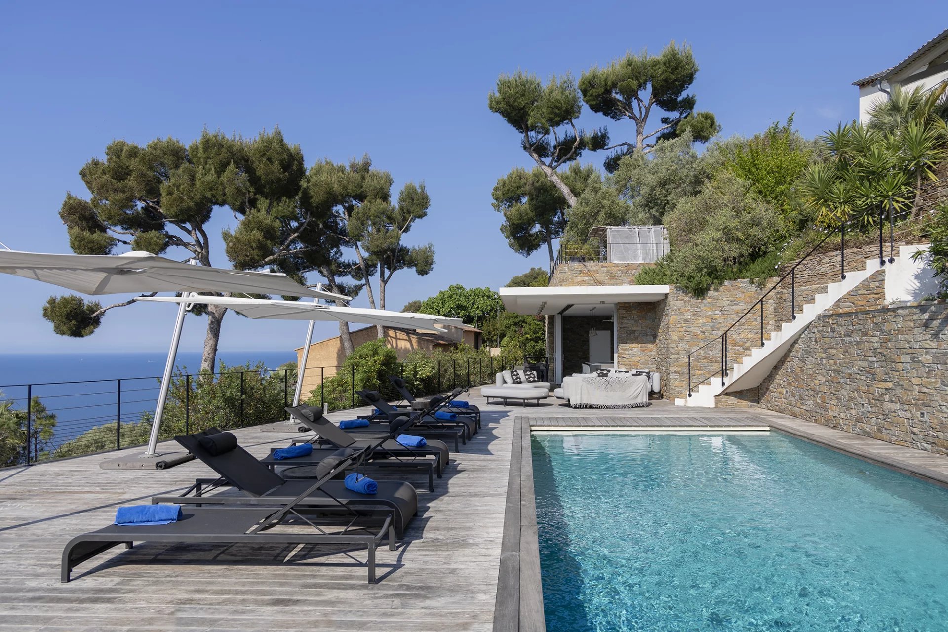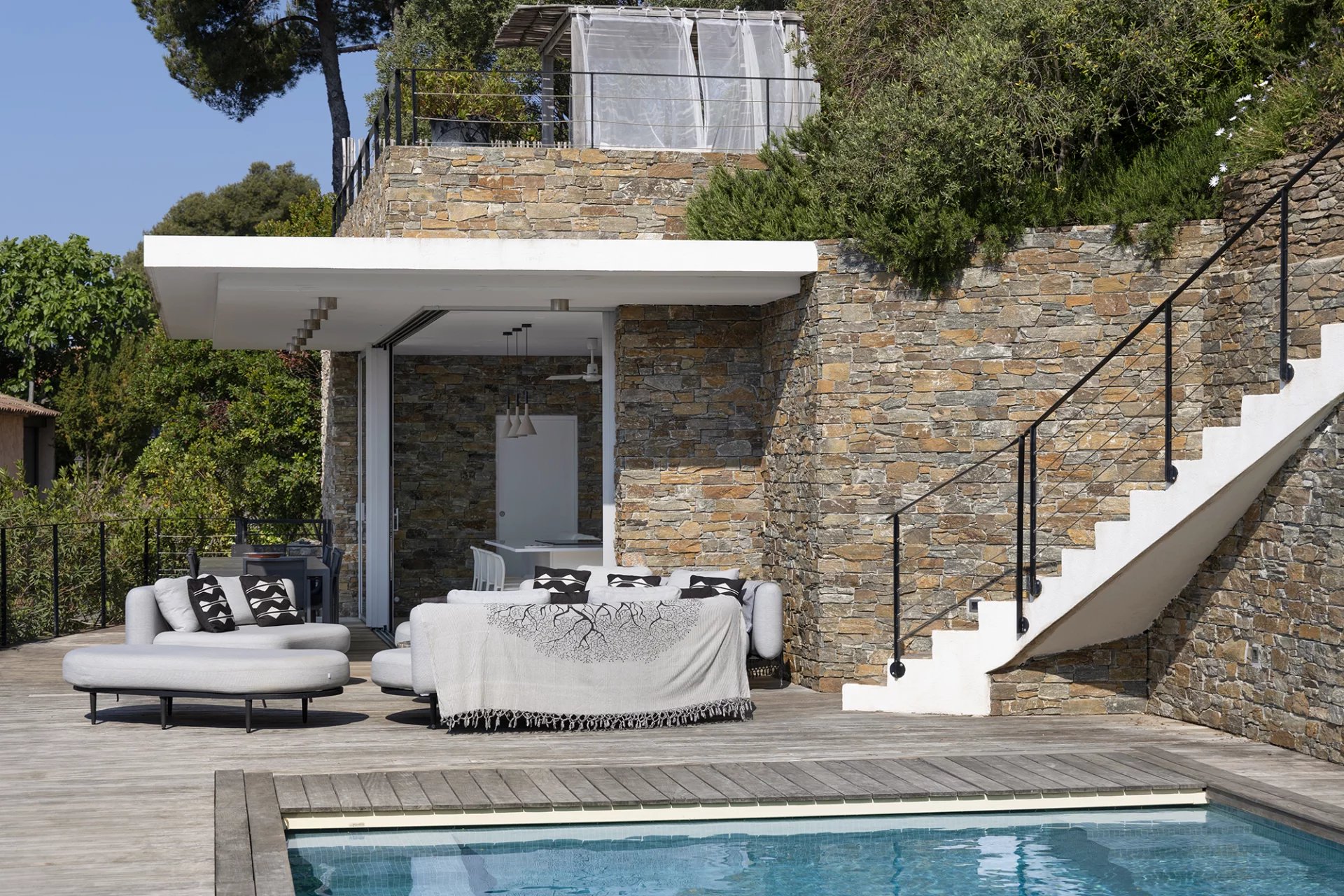 Construite dans les années 1980 dans un style méditerranéen, la villa a fait l’objet d’une rénovation complète et d’une extension en 2016, confiée à l’architecte Frédérique Pyra. L’intervention a permis la création d’un pool-house indépendant ainsi que d’une terrasse en bois de 140 m², offrant un cadre de vie contemporain, fonctionnel et résolument tourné vers l’extérieur.