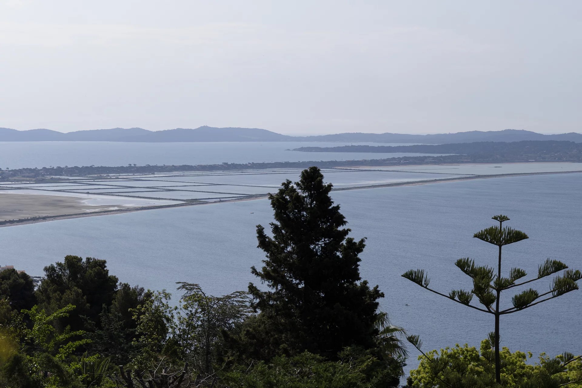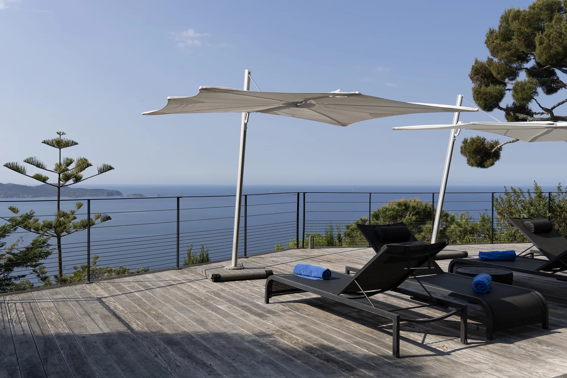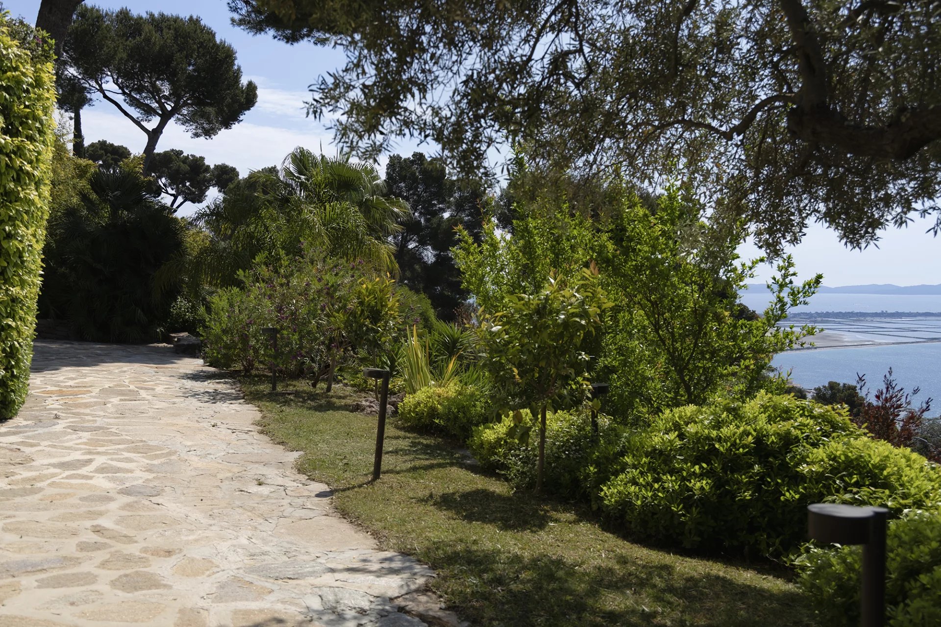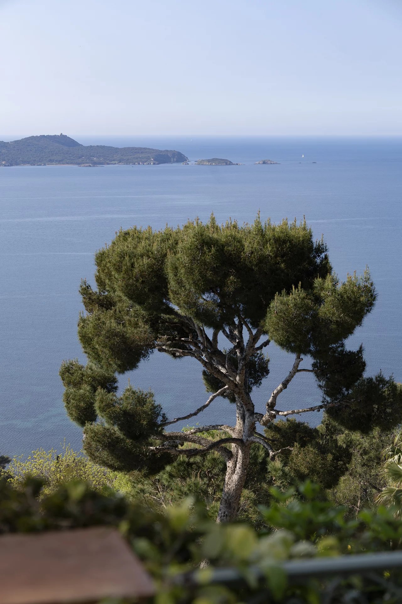 D’une surface totale de 267 m², la propriété se compose d’une maison principale de 227 m² répartis sur trois niveaux, et d’un pool-house de 40 m². Elle bénéficie d’une exposition plein sud et d’une vue dégagée sur la mer, le Tombolo, la presqu’île de Giens et les Îles d’Or.