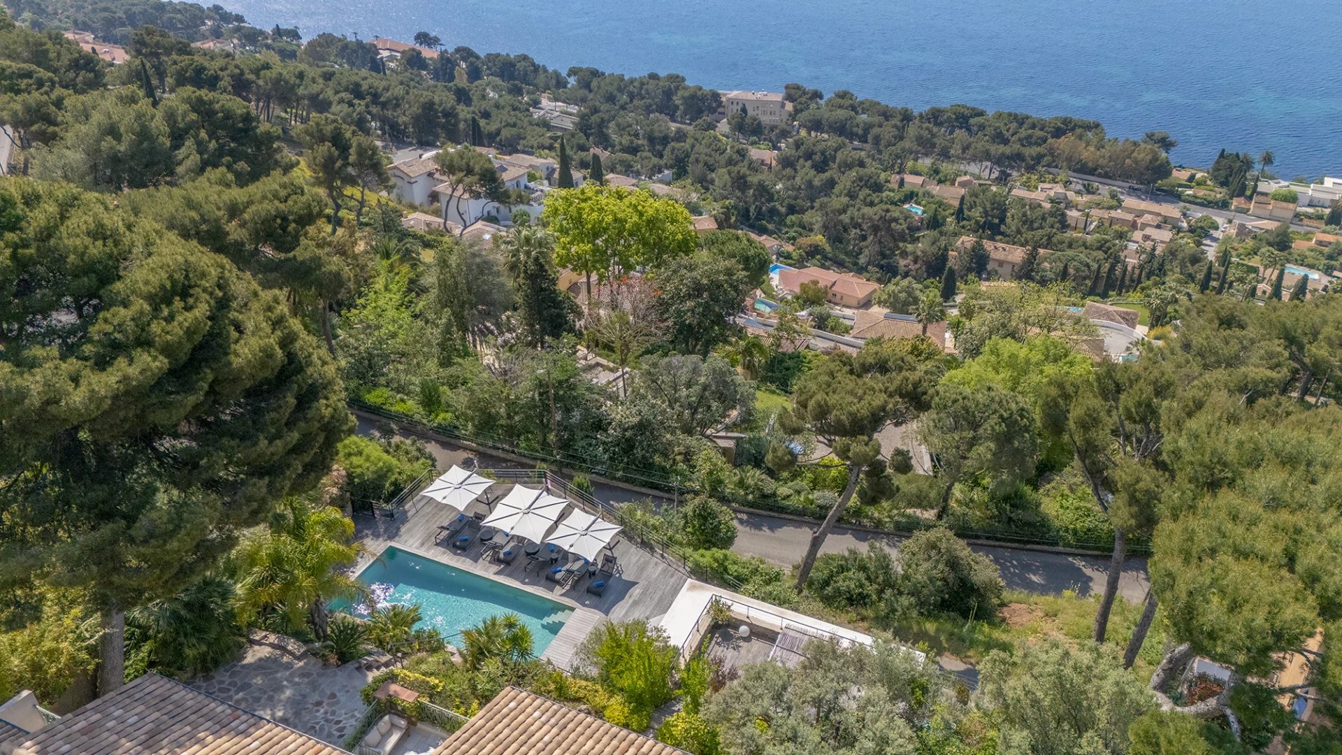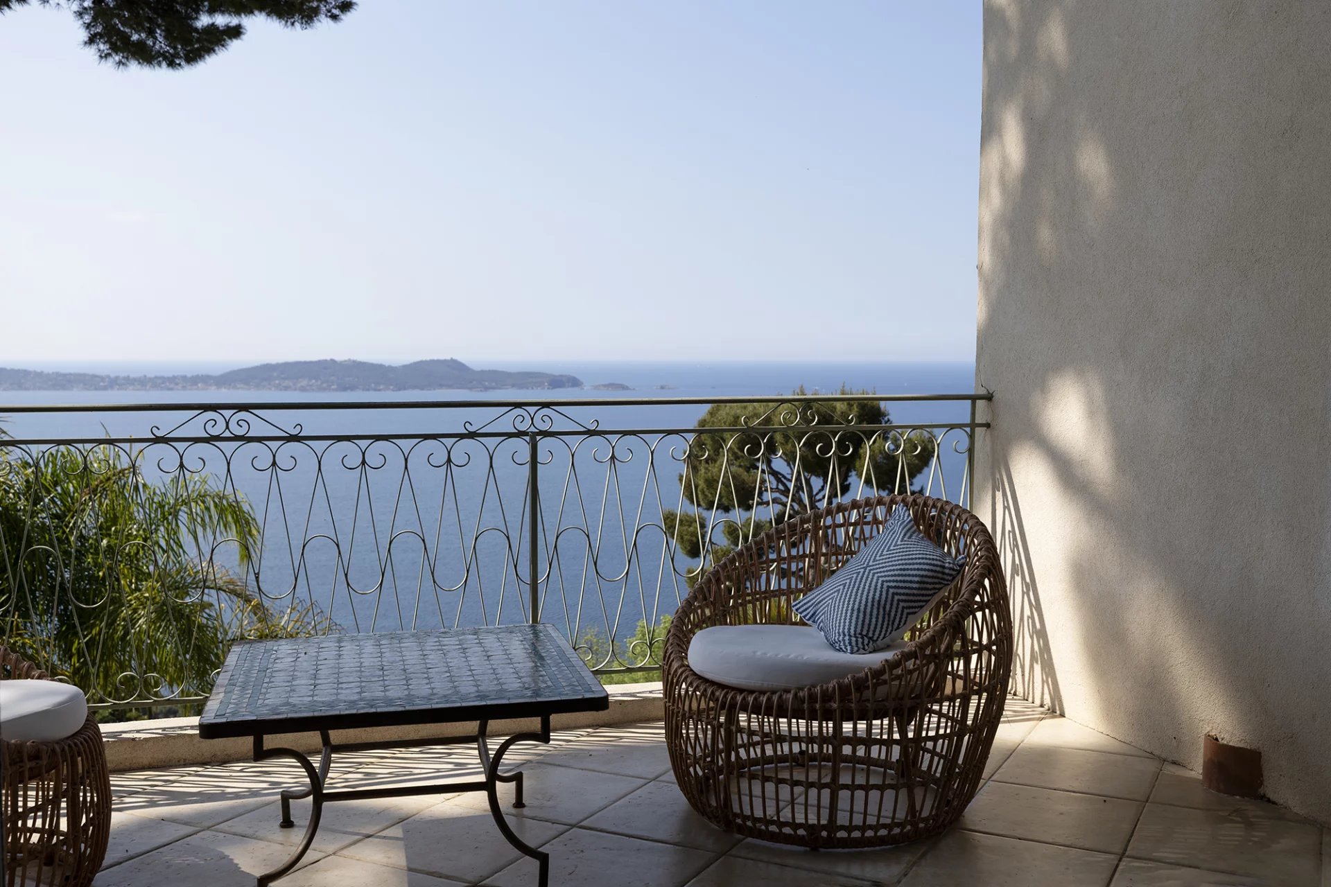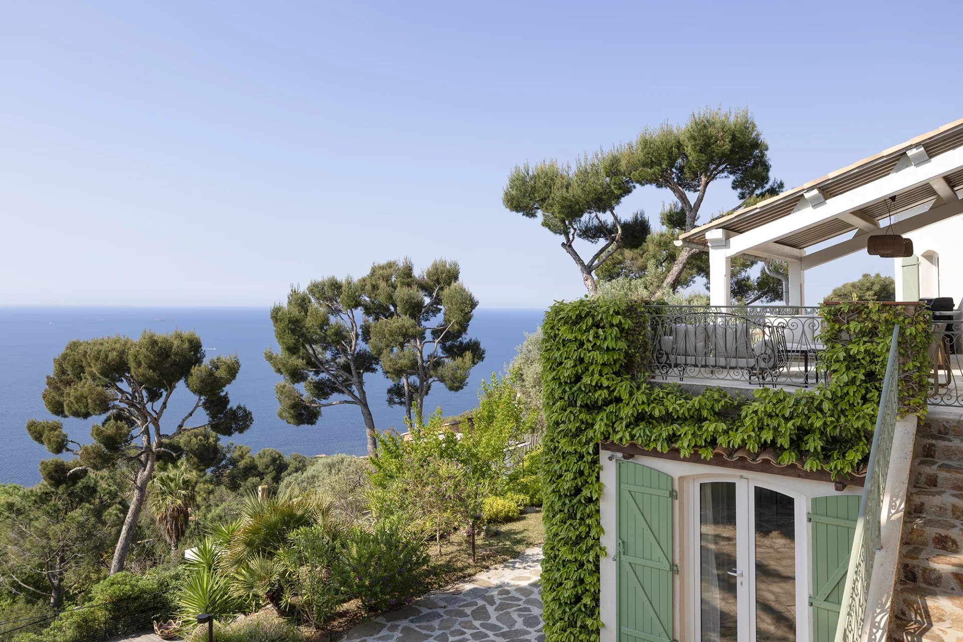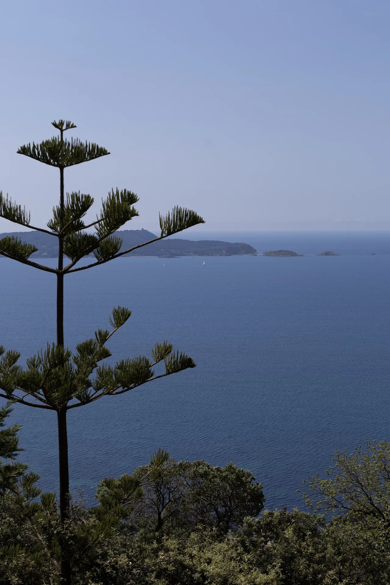 D’une surface totale de 267 m², la propriété se compose d’une maison principale de 227 m² répartis sur trois niveaux, et d’un pool-house de 40 m². Elle bénéficie d’une exposition plein sud et d’une vue dégagée sur la mer, le Tombolo, la presqu’île de Giens et les Îles d’Or.