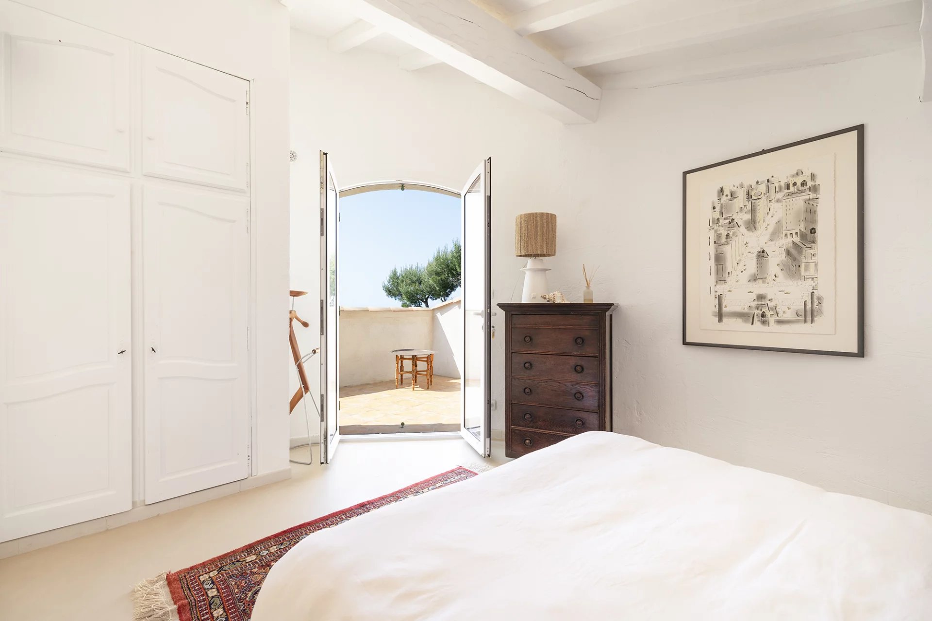 À l’étage, une chambre supplémentaire avec salle d’eau s’ouvre également sur une terrasse.