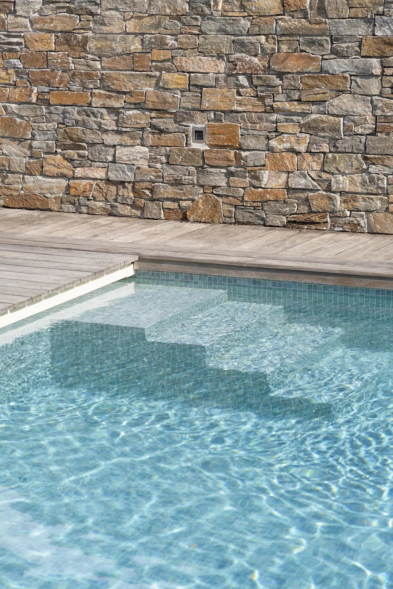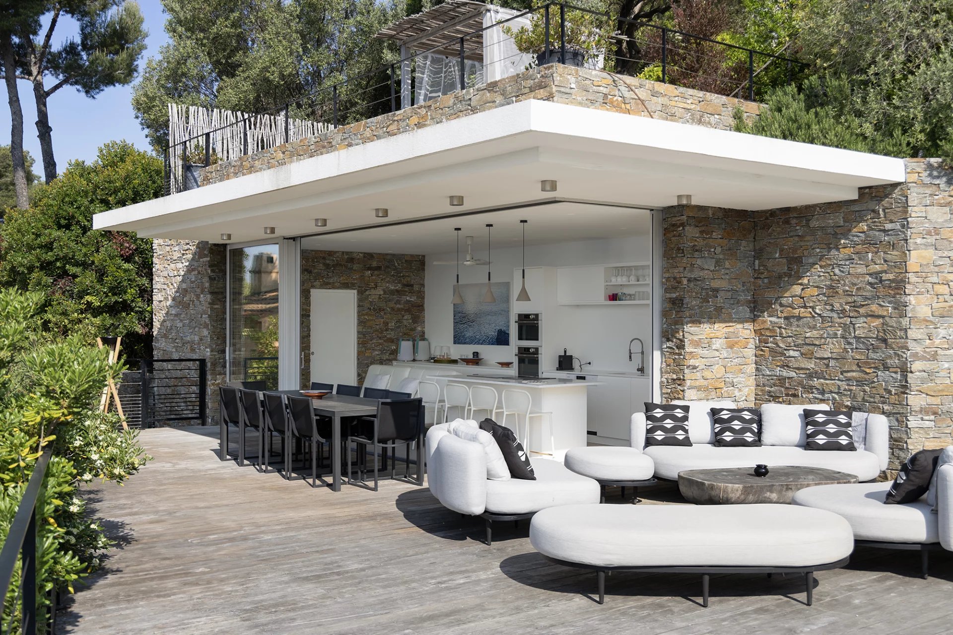 Le pool-house indépendant est équipé d’une cuisine d’été, d’un espace salon et d’une salle d’eau. Il donne sur une grande terrasse en bois, attenante à la piscine de 10 x 5 mètres et au toit-terrasse accessible.