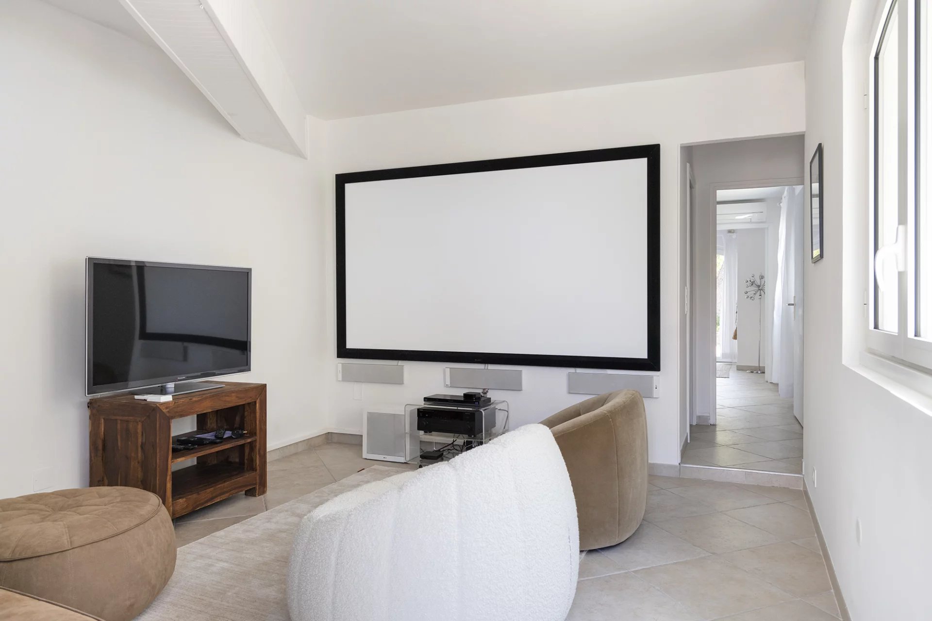 La maison principale comprend, au rez-de-jardin, deux chambres, une salle de bains, une salle de cinéma ainsi qu’un garage.