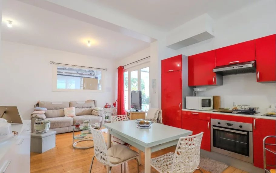 En RDC d'un sas d'entrée avec double placards, wc d'invité, d'une grande cuisine dinatoire entièrement équipée avec accès terrasse, d'un double séjour (43 m²) exposé Sud-Est, de 2 chambres avec placards et d'une salle d'eau avec wc.